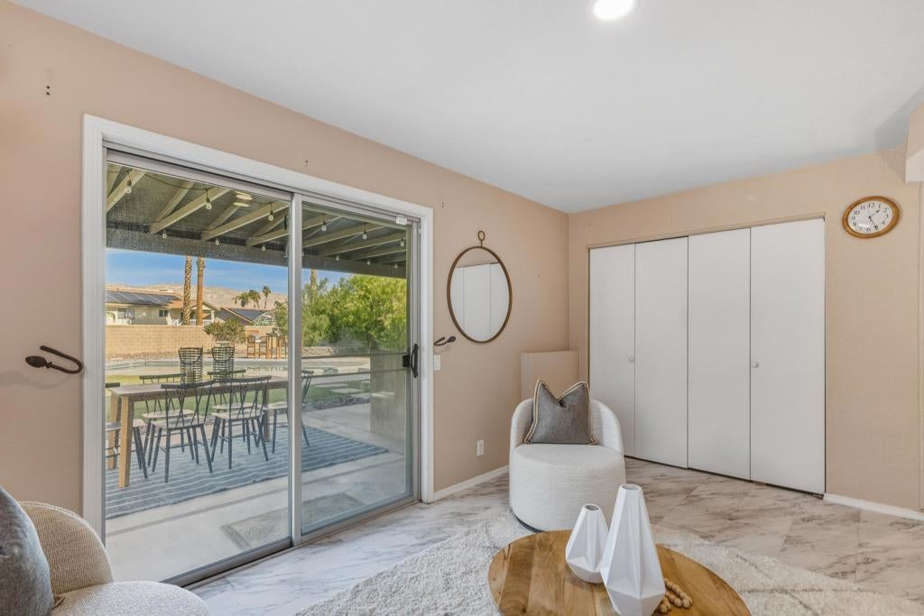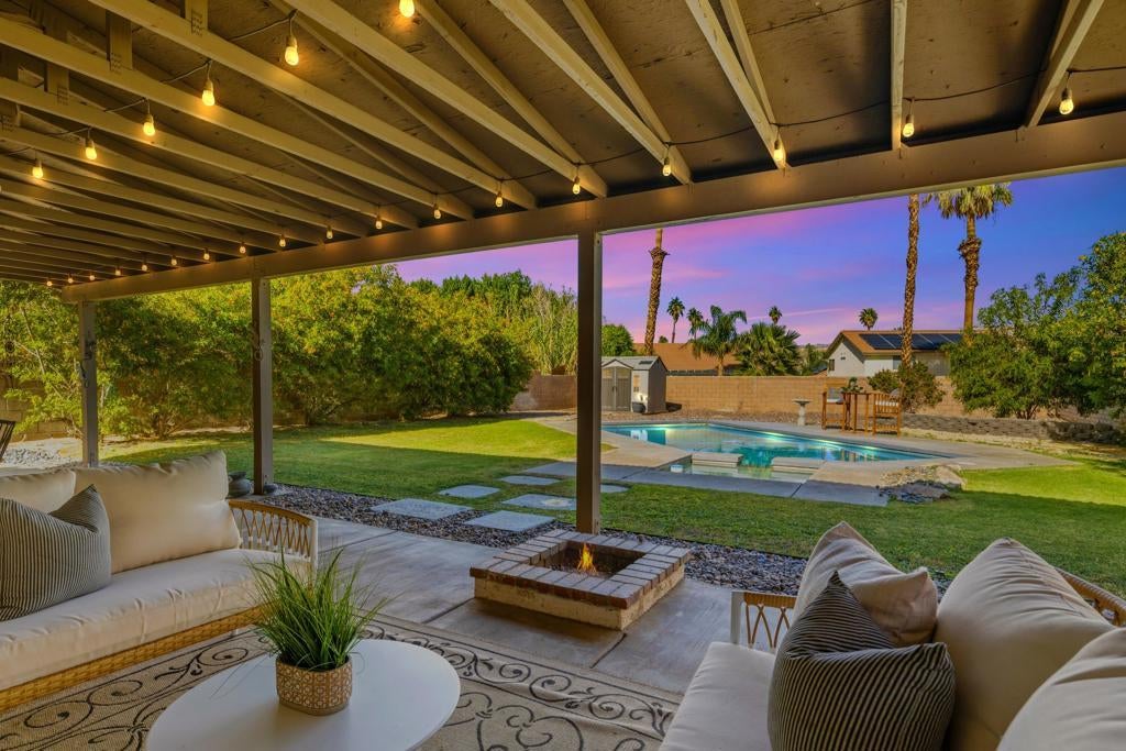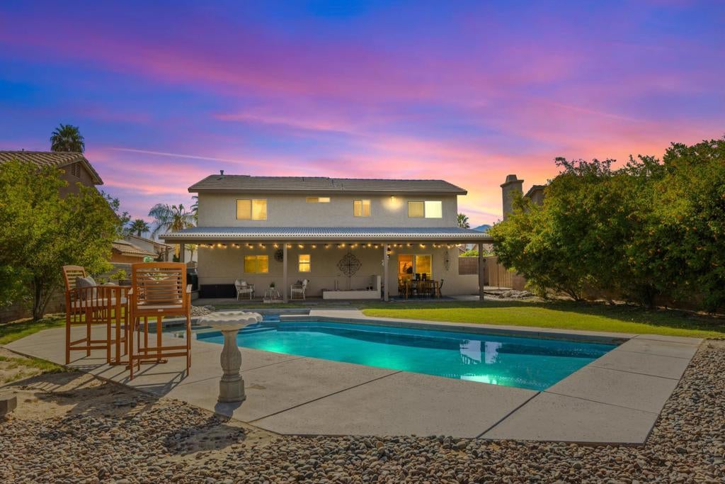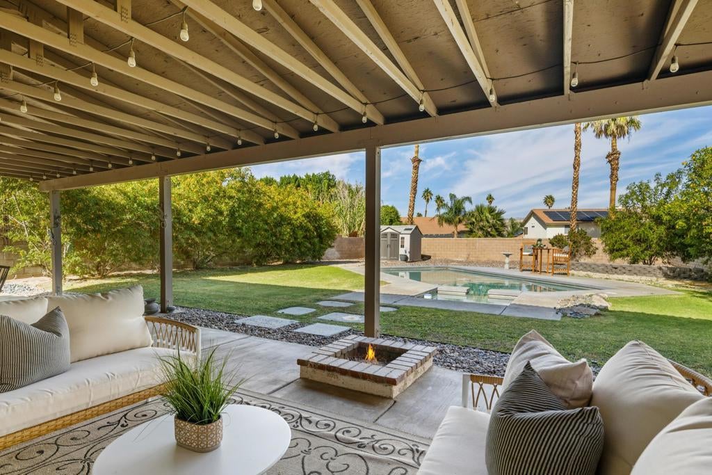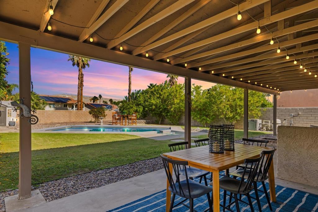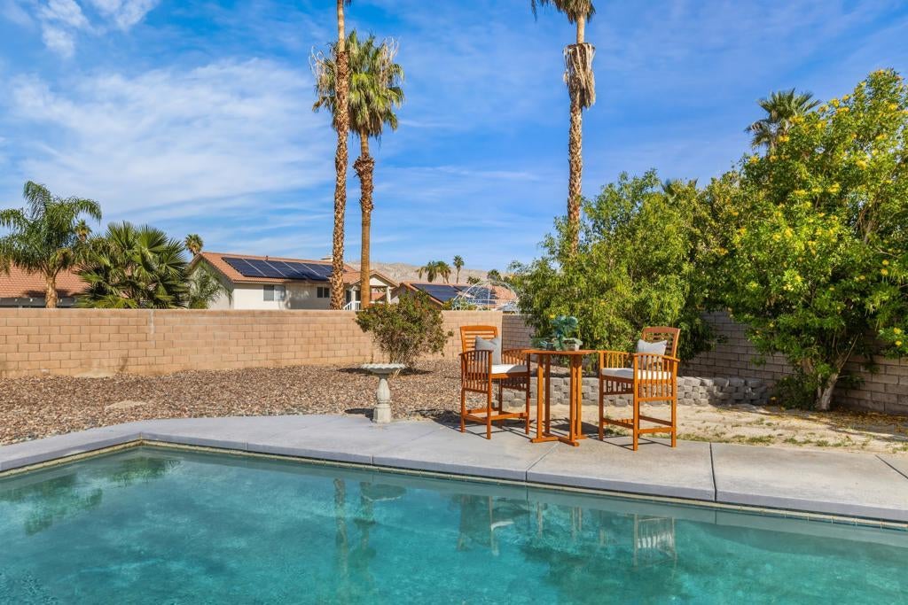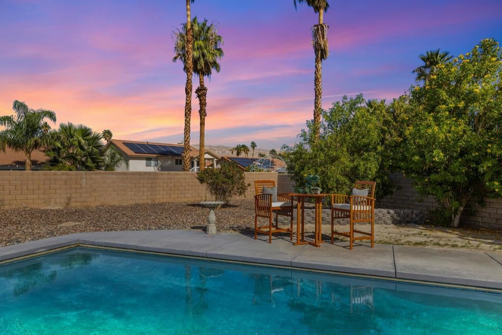 Proudly set on Cathedral City's famous ''Candy Cane Lane,'' this welcoming tri-level home offers over 2,200 sq. ft. of living space with 3 bedrooms, 2 bathrooms, and beautiful mountain views from all levels. The flexible layout includes multiple living areas, great for family gatherings, kids, or guests. Step outside to a spacious backyard made for everyday living, with a sparkling pool and spa ready for weekend barbecues and celebrations. A detached shed provides extra space for tools, storage of holiday decor, or hobbies. The owned solar system keeps utility costs low. Loved for its strong sense of community and festive holiday spirit, ''Candy Cane Lane'' is one of Cathedral City's most treasured neighborhoods. A wonderful opportunity for first-time buyers, an investor, or anyone looking for room to grow in a place that feels like home.