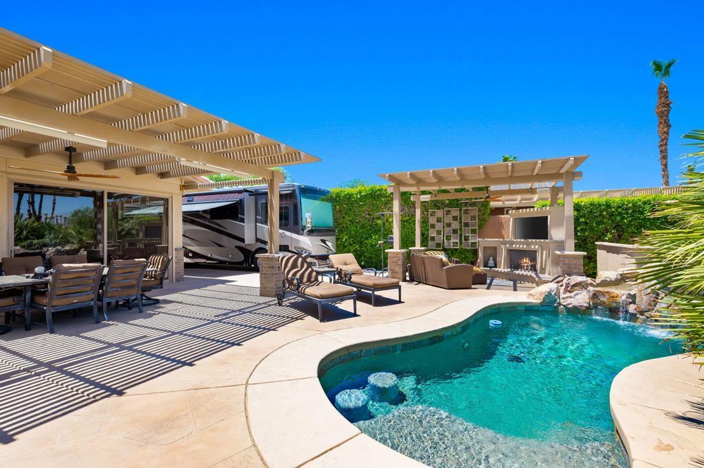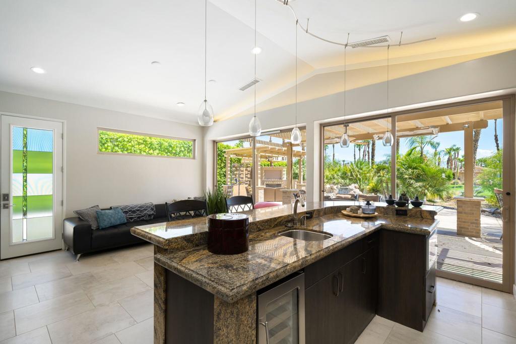 #16 DESERT SHORES RESORTRedesigned, 1,200 Sq Ft Villa now with 2 Retreats + 2 Bathroom, (1 with steam shower) and a 438 Sq Ft. garage with car lift. Total size of structure is 1,638 Sq. Ft.Outdoor living offers huge, circular granite bar, pool and outdoor fireplace situated high above Lake 1 with fountain views!Association includes clubhouse, tennis, pickleball, fitness center, community pool & spa, social activities, 24-hour, guard gated with high-tech perimeter security, trailer storage area, doggie park, front yard landscape maintenance & High Speed Internet.