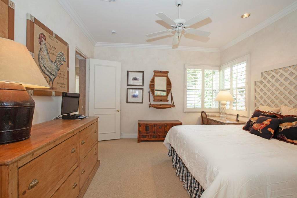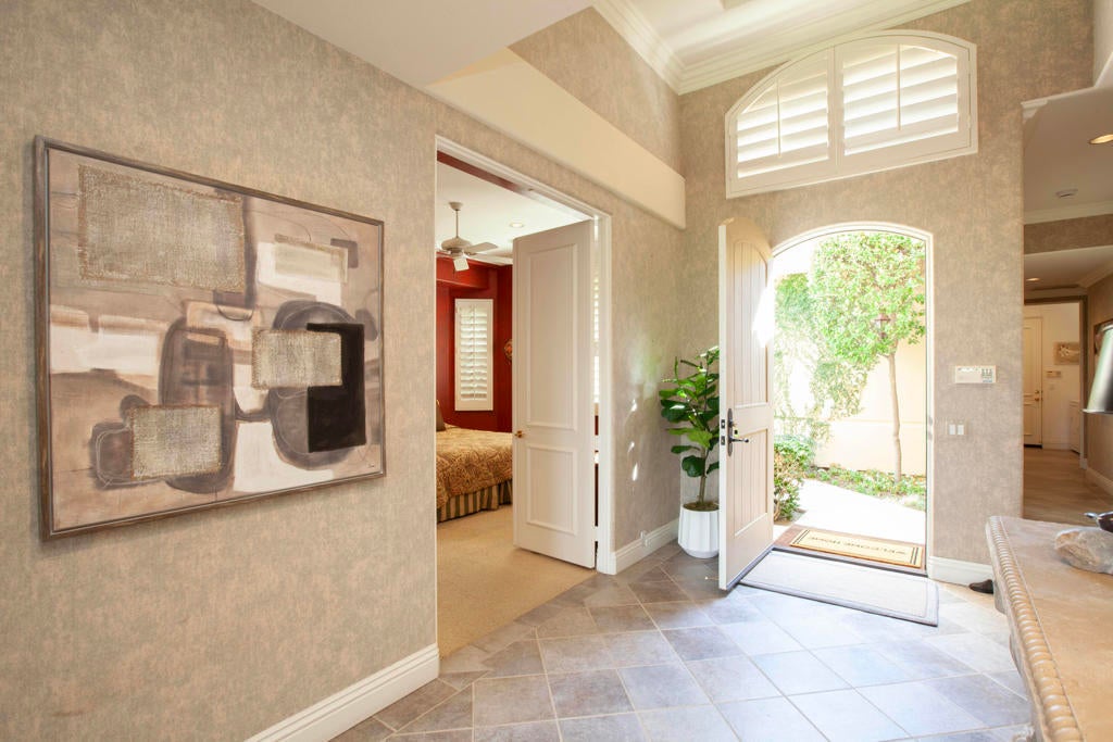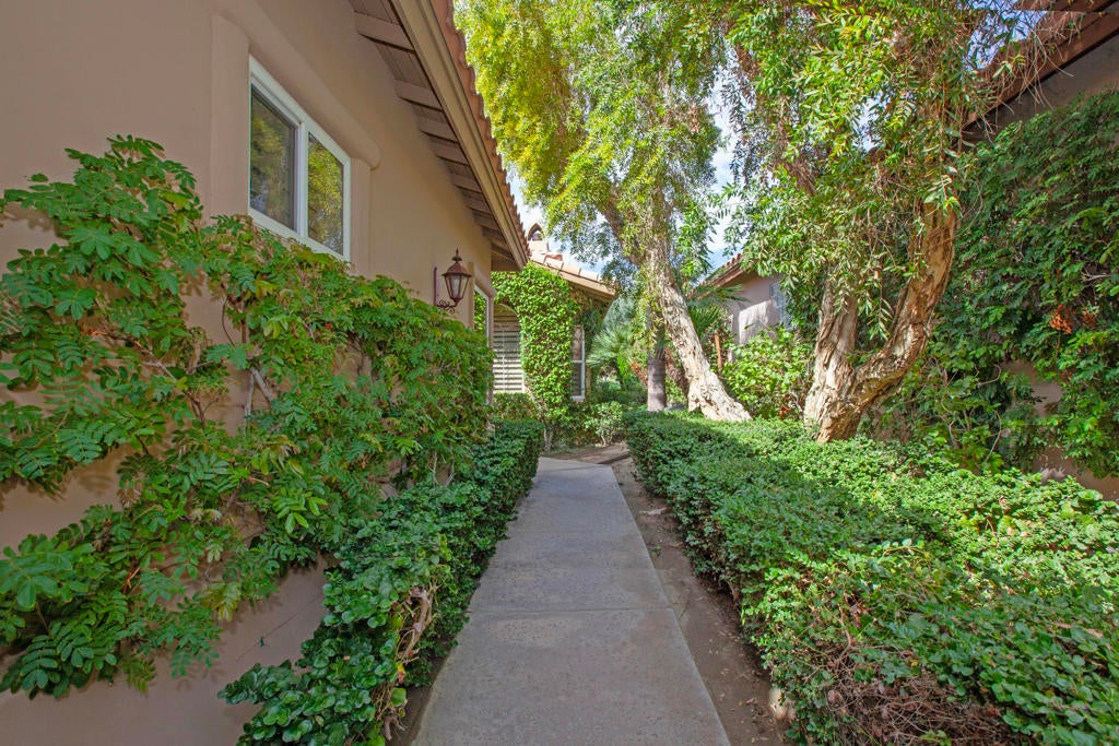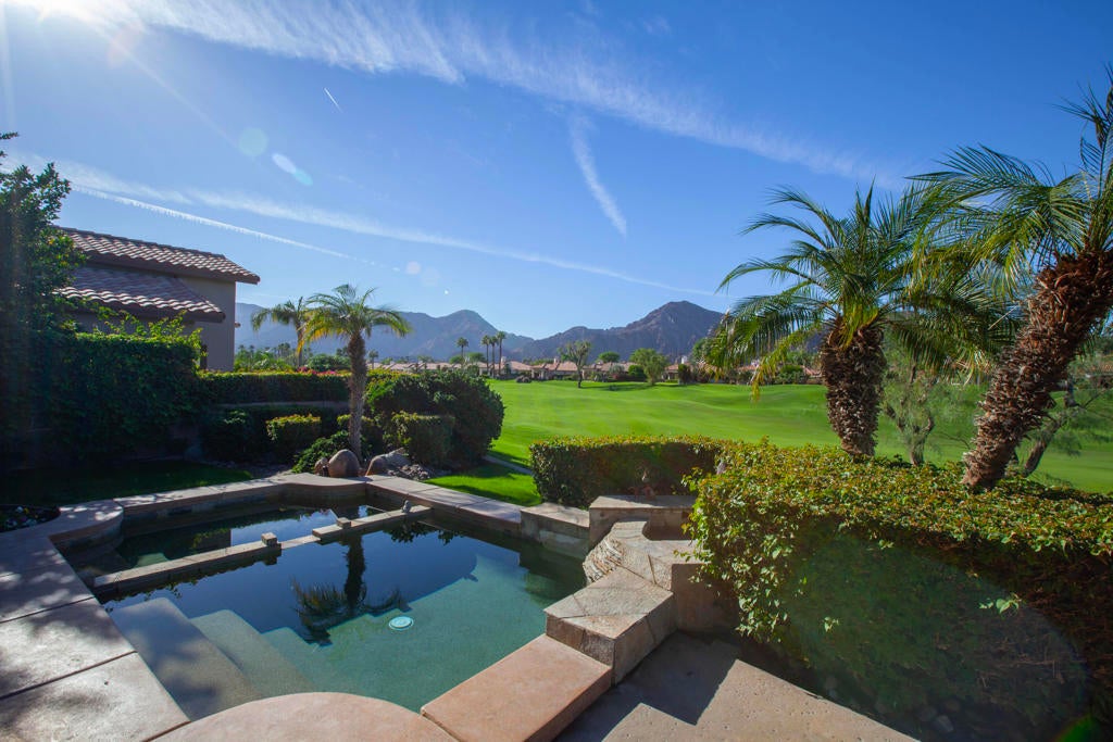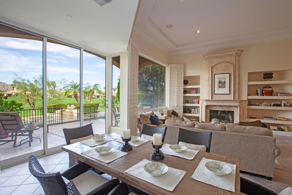 Welcome to an exceptional desert residence in the prestigious Rancho La Quinta Country Club, where breathtaking scenery and refined living come together seamlessly. This beautifully appointed home enjoys an enviable setting with dramatic, rugged Santa Rosa Mountain foothill vistas and sweeping views across the lush, undulating 8th fairway of the Robert Trent Jones Jr. Championship Golf Course. Designed to embrace the desert lifestyle, the view patio provides a private retreat with a refreshing mini-pool, large spa, and ample space for relaxing and entertaining while enjoying vibrant sunsets that paint the mountains in spectacular color.Tall ceilings and large panoramic windows frame the natural beauty outdoors, bringing an abundance of light into the great room, where mountain views serve as a captivating backdrop. A dramatic fireplace with a custom face and hearth anchors the living space, complemented by designer wall treatments and custom window shutters. Neutral high-quality tile flooring flows through the main living areas, while plush, upgraded carpeting adds comfort to the bedrooms.The open cook's kitchen is ideal for both casual and large-scale entertaining, featuring a generous center island, gas cooktop, dual ovens, raised-panel cabinetry, and excellent storage. The adjacent dining and living areas allow for effortless indoor-outdoor connection and a natural flow for gatherings of all sizes. The large primary suite is a serene retreat, offering two walk-in closets, a spacious bath, and direct access to the tranquil outdoor setting. Guests will appreciate privacy and comfort throughout the home. A welcoming entry courtyard provides an additional outdoor living space and sets the tone for the home's warm and inviting atmosphere.Practical features include a two-car garage with additional side-pull golf cart parking, ideal for accessing the community's renowned golf and lifestyle amenities. Please see the Amenities list. Positioned on an ancillary road within the community, this residence benefits from reduced traffic and a more peaceful setting.Offering a rare blend of natural beauty, comfort, and style, this home presents an outstanding opportunity to enjoy the highly sought-after Rancho La Quinta Country Club lifestylea'with championship golf, resort-style amenities, and stunning scenery surrounding you at every turn. Furnished per Inventory List