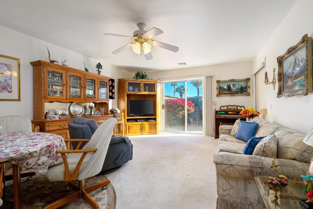 Beautifully maintained, single family home in the much sought after Desert Grove (55+) community. Quiet location convenient to pool and spa area. Two large bedrooms with walk in closets, two large bathrooms, and separate indoor Laundry room. This home has an attached two car garage for plenty of storage. Upgraded cabinets in kitchen with garden window which offers a lovely Mountain view. There are also Ceiling fans in each room. Desert Grove is an active, pet friendly, gated community with two pools, two spas, tennis, billiards, pickleball, clubhouse and paved RV parking available for rental onsite. This is a custom SFR - not a manufactured home.