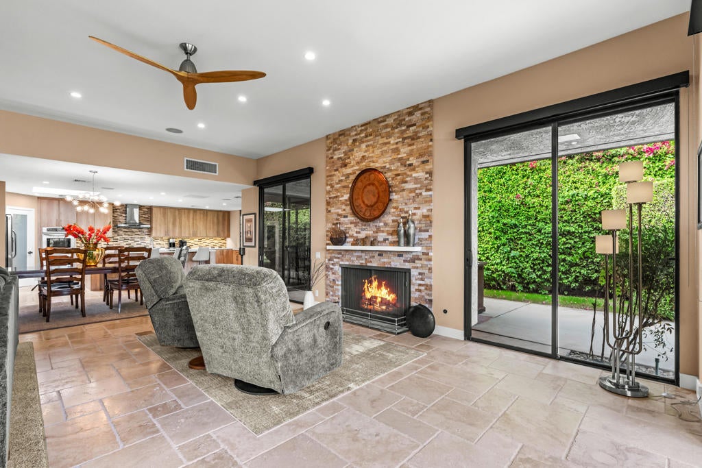 Experience modern desert luxury in this remodeled 3BD/3BA, 3,000 sq. ft. Shaughnessy floor plan at The Springs Country Club in Rancho Mirage. This open-concept has been reimagined to create bright open spaces linking the kitchen with family room and fireplace. Enjoy your new updated dream kitchen with skylight and custom cabinets. Kitchen-Aid appliances, and a large island is the center of the home. The large primary bedroom has addtional space for an office or reading nook. Organization has been improved by making the closet even bigger with custom build-out. The second and third bedrooms are also ensuites with updated baths. This floor plan provides separation between bedrooms for privacy. Just steps away, enjoy a heated community pool and spa maintained year-round by the HOA--no maintenance contracts, workers, or extra costs. The private patios help you take in San Jacinto Mountain sunsets from your own desert oasis surrounded by mature cacti and hummingbirds. The home is sold furnished and also includes outdoor grilling station. Located near the newly renovated 48,000 sq. ft. clubhouse, this home includes large 2-car garage plus golf cart garage. HOA dues include insurance, cable, internet, and house painting and roof replacement. The Springs is proud to announce the completion of a total restoration of our private 18-hole Desmond Muirhead Signature golf course, 46 pools, tennis + pickleball active racket-sports community play, bocce courts, fitness center, spa, and dining all year round. 24-hour guard-gated community minutes from Eisenhower Medical Center, The River, shopping on El Paseo and Palm Springs. Furnishings included minus personal items/art.