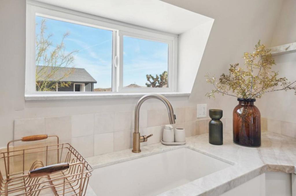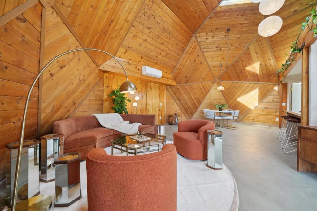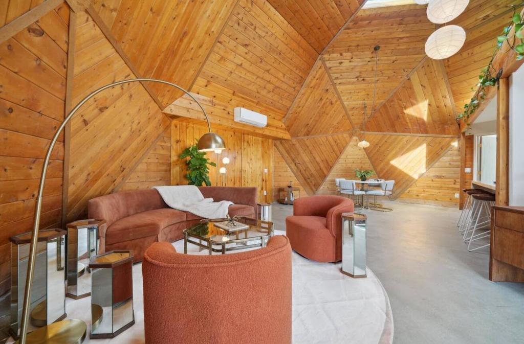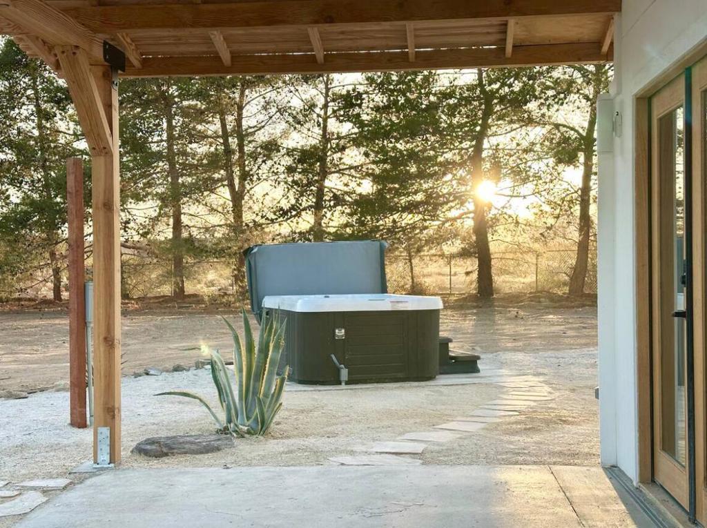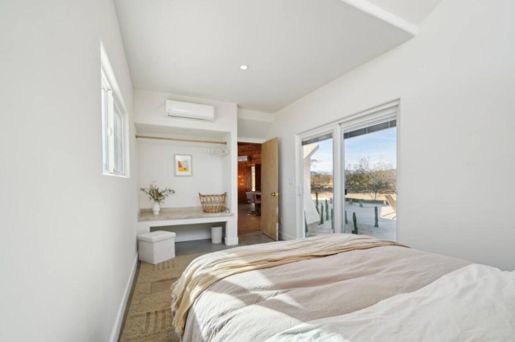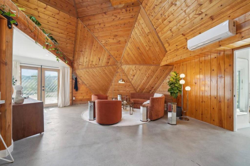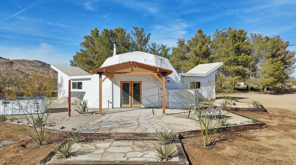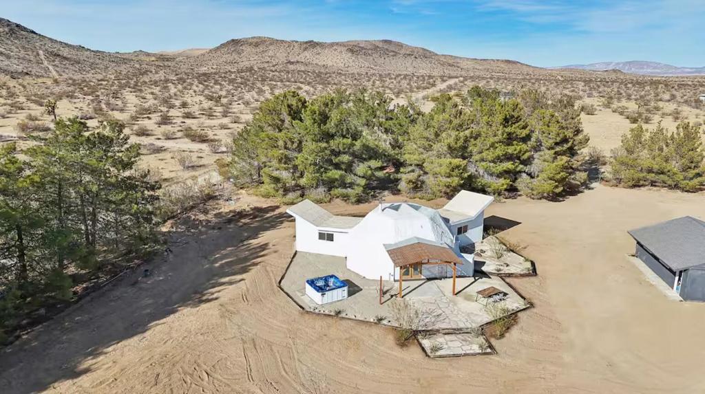 One-of-a-kind geodesic dome home that features designer touches enhancing the enchanting aesthetics. Built in 1975, this rare architectural gem features a spacious open floor plan with skylights, high ceilings, concrete floors, mini-split hvac, and a triple orb pendant lighting. Loft styled with curated Scandinavian botanicals and minimalist plant decor. Dining area is anchored with an oval chain swag light with ample room for many guests. Kitchen with breakfast bar, Taj Mahal quartzite counters, electric stove and cooktop, recessed lighting, tile backsplash, stainless steel dishwasher and refrigerator. Bathroom with vessel sink vanity, large walk-in shower with glass and raindrop shower-head. Two bedrooms with smooth white walls, dual alcove shelves and glass sliders leading to the patio. Fully fenced 2.5 acres with towering mature pinion pines enhancing the privacy and shade. Water well used primarily for agricultural purposes. Ample parking and a detached 700sf garage. Enjoy starry nights with friends under the milky way. Quad hammock star. Patio adorned with ''Mexican fencepost'' cactus, Arizona Star agave and mature Joshua Trees. Shaded front patio. Hot tub with electrical sub panel. Sunken bench lounge area. Next to thousands of acres of government open space with hills and trails to explore. Not far from the Joshua Tree National Monument where about 3 million tourists visit annually. 12 miles to Yucca Valley for all amenities. 44 miles to Palm Springs. 132 miles to Los Angeles. Don't Wait! - Call Now!