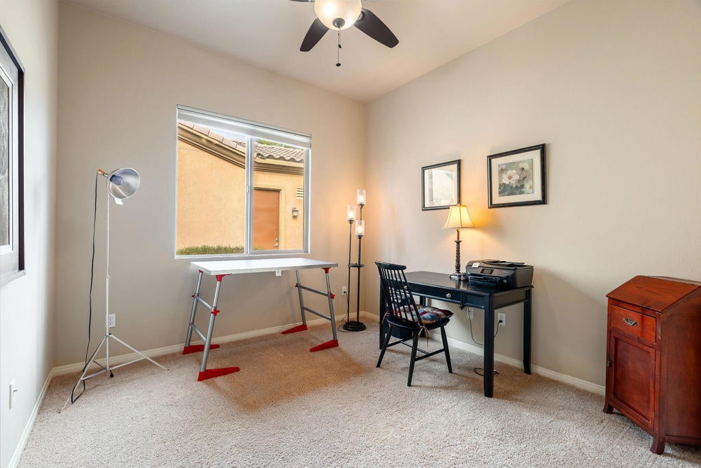 Mountain Views and Golf Course Living!Experience stunning southern views of Mt. San Jacinto and Mt. Gorgonio from this beautifully furnished Avalino floor plan in Sun City Shadow Hills. Perfect as a seasonal retreat or year-round residence, this 2-bedroom, 2-bath home with den/office offers comfort, quality, and resort-style living.The open kitchen features Corian countertops, double ovens, a gas cooktop, 42-inch cabinetry, a step-in pantry, and a breakfast bar overlooking the spacious great room ideal for gatherings and everyday living. Plantation shutters throughout add privacy and elegance, complementing the high ceilings and tasteful decor.The primary suite provides a relaxing retreat with dual vanities, a soaking tub, separate shower, and custom walk-in closet. A guest bedroom and den offer flexible space for visitors or a home office.Step outside to enjoy the ultimate in desert outdoor living. The elevated patio above the 12th green of the North Course features two new motorized 10-foot extendable awnings, a new outdoor L-shaped sectional, and five matching gliding chairs, creating the perfect setting for entertaining or relaxing. The fire pit and alfresco dining area make this space ideal for both cool winter evenings and sunny summer days.This turnkey home captures the essence of desert living refined, comfortable, and perfectly situated in the heart of Sun City. Sun City Shadow Hills offers two championship golf courses, resort-style clubhouses, state-of-the-art fitness centers, pools, tennis and pickleball courts, and an abundance of social clubs and activities for the desert lifestyle.