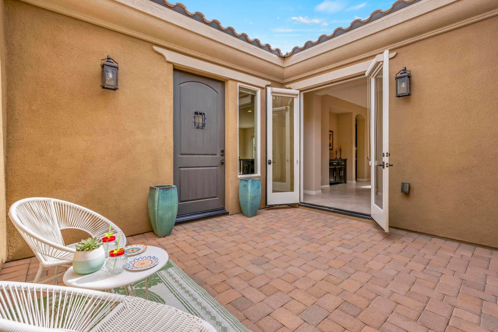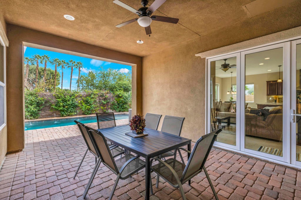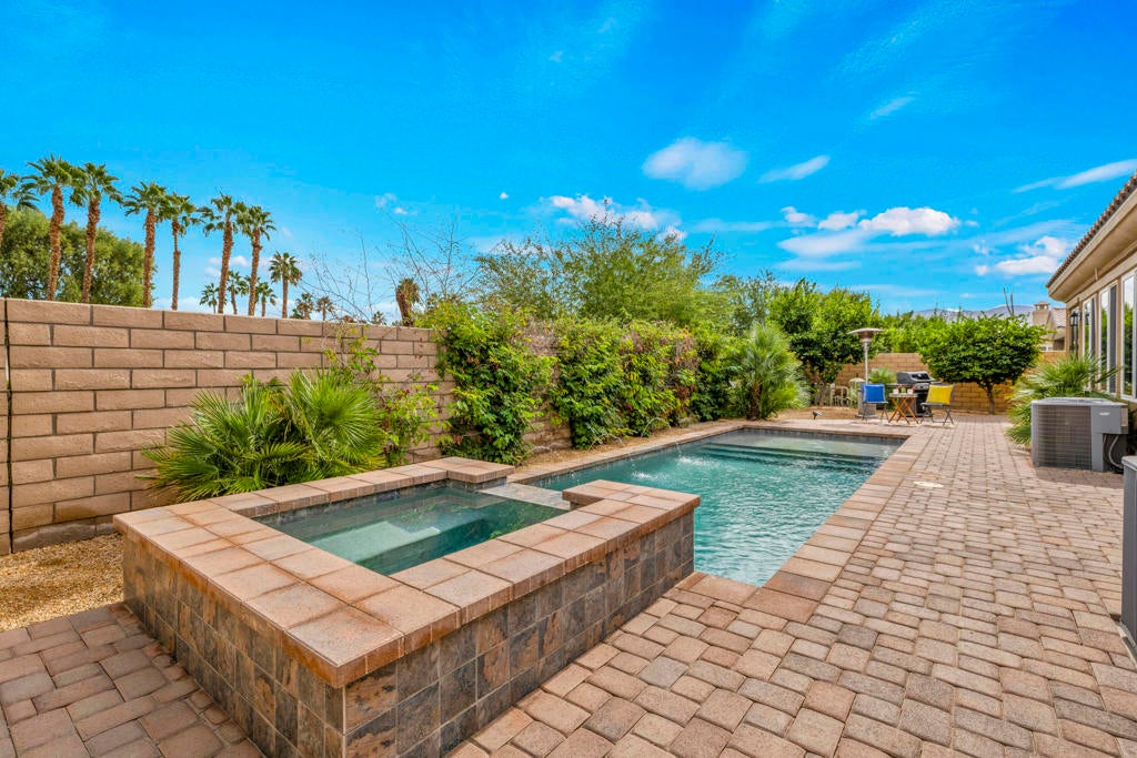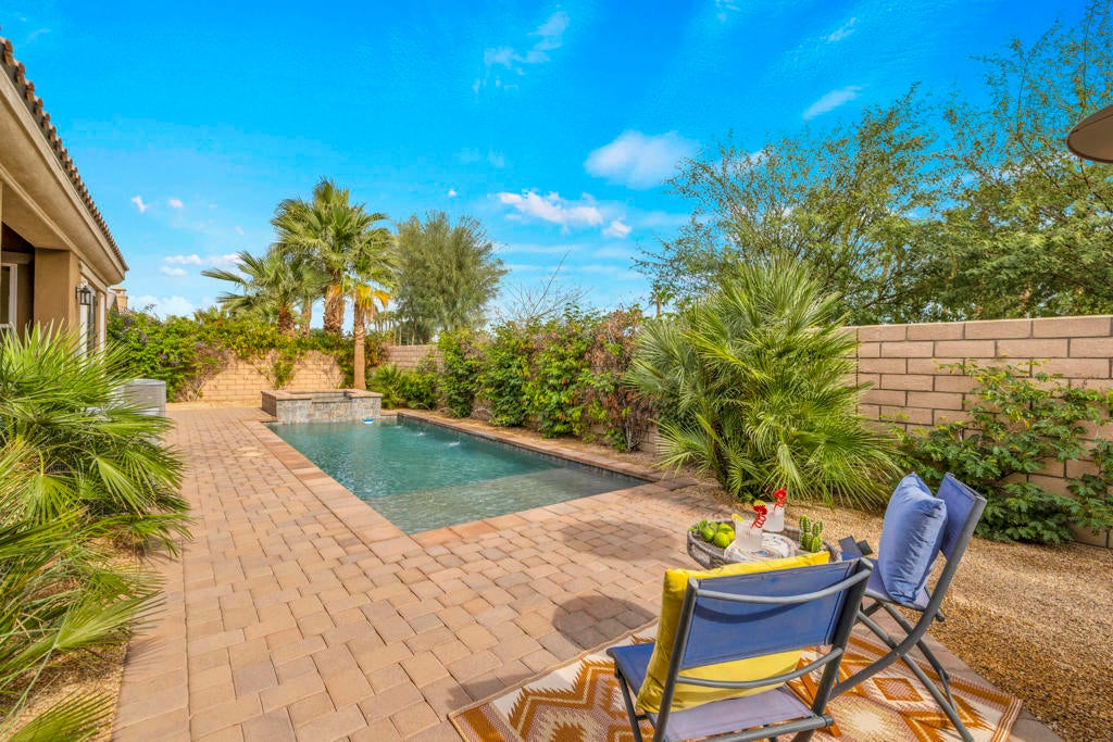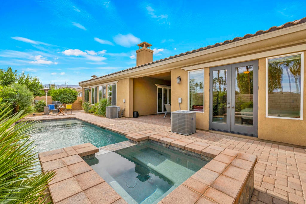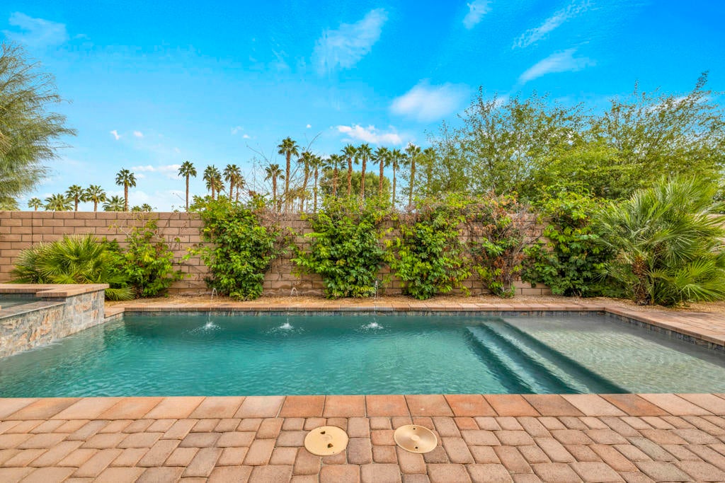 Step beyond the paver-finished courtyard entry and into a sanctuary where luxury meets the quintessential desert lifestyle. This meticulously cared-for residence is a testament to true pride of ownership and features a brilliant, well-designed floor plan offering exceptional separation between the Primary and Guest Suites; notably, all bedrooms are en-suite. The heart of the home is a grand entertaining space with soaring 10-foot ceilings and sun-drenched rooms. The architectural highlight is the expansive great room, where a striking set of accordion pocket doors glides open to the covered patio, creating a seamless, unforgettable indoor-outdoor living experience. The gourmet kitchen is a chef's dream, featuring a grand island, a five-burner gas cooktop, chimney-style range hood, and thoughtful storage including a large pantry and butler's pantry. A double convection oven/microwave combo, ensure every culinary endeavor is a success. Elegance extends to the Primary Suite, a private retreat with dual vanities, a large soaking tub, and French doors leading directly to the resort-style backyard oasis. The outdoor space is defined by the Palm Springs blue PebbleTec swimming pool, tanning shelf, and elevated spa, complemented by handsome pavers throughout. Additional refined interior details, such as the glazed porcelain tile, new carpeting, and Hunter Douglas roller shades, underscore the home's commitment to enduring style, making this a sophisticated and turn-key desert haven.