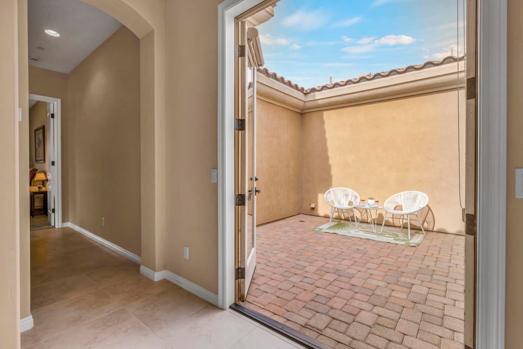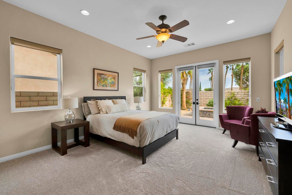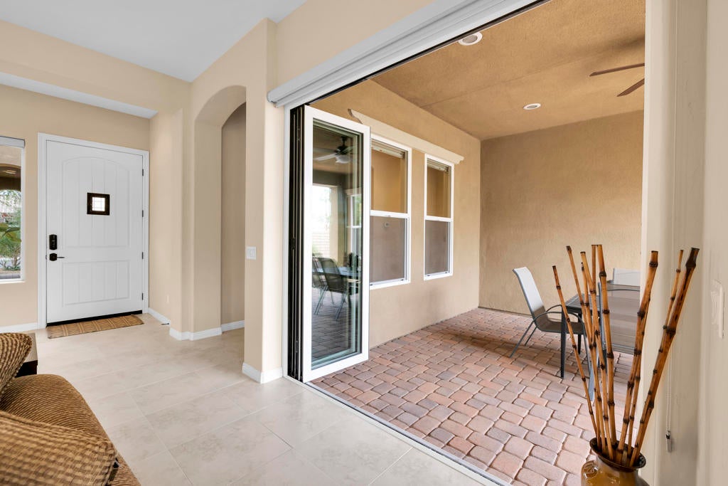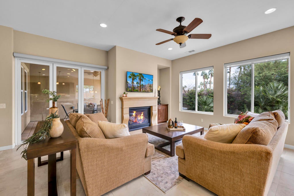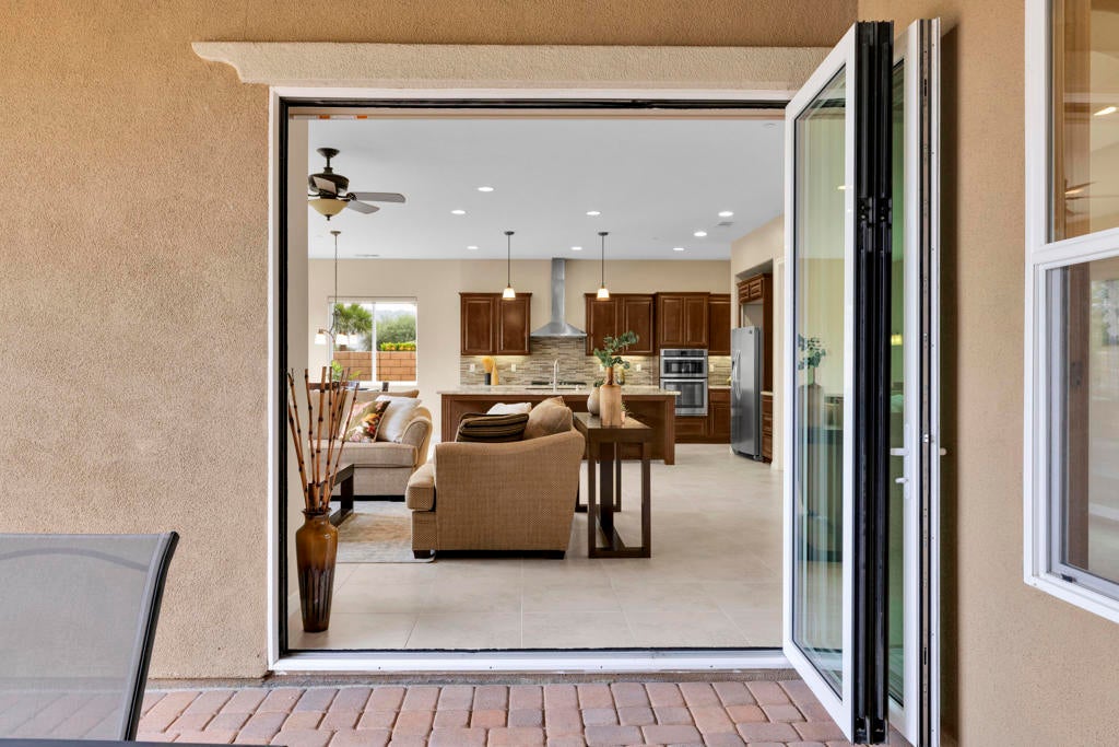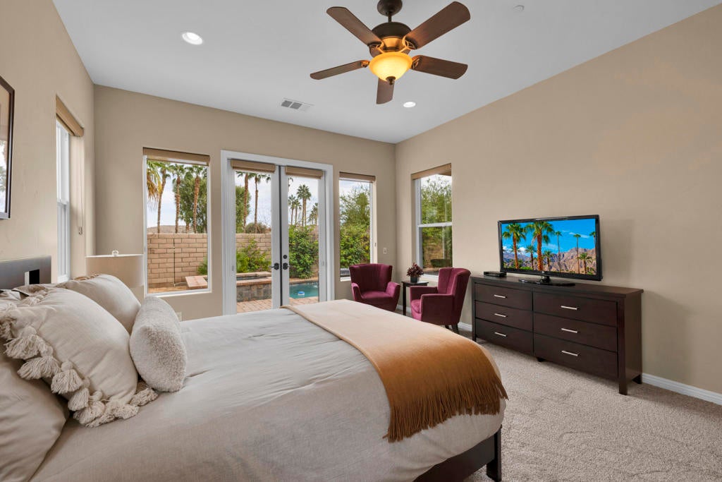 Step beyond the paver-finished courtyard entry and into a sanctuary where luxury meets the quintessential desert lifestyle. This meticulously cared-for residence is a testament to true pride of ownership and features a brilliant, well-designed floor plan offering exceptional separation between the Primary and Guest Suites; notably, all bedrooms are en-suite. The heart of the home is a grand entertaining space with soaring 10-foot ceilings and sun-drenched rooms. The architectural highlight is the expansive great room, where a striking set of accordion pocket doors glides open to the covered patio, creating a seamless, unforgettable indoor-outdoor living experience. The gourmet kitchen is a chef's dream, featuring a grand island, a five-burner gas cooktop, chimney-style range hood, and thoughtful storage including a large pantry and butler's pantry. A double convection oven/microwave combo, ensure every culinary endeavor is a success. Elegance extends to the Primary Suite, a private retreat with dual vanities, a large soaking tub, and French doors leading directly to the resort-style backyard oasis. The outdoor space is defined by the Palm Springs blue PebbleTec swimming pool, tanning shelf, and elevated spa, complemented by handsome pavers throughout. Additional refined interior details, such as the glazed porcelain tile, new carpeting, and Hunter Douglas roller shades, underscore the home's commitment to enduring style, making this a sophisticated and turn-key desert haven.