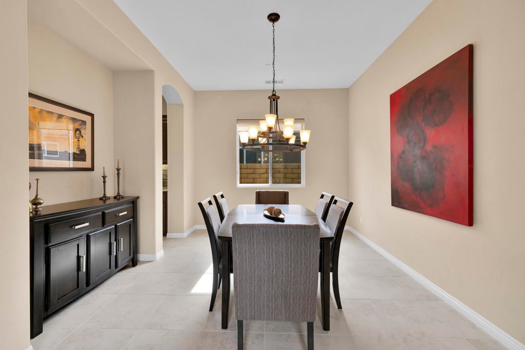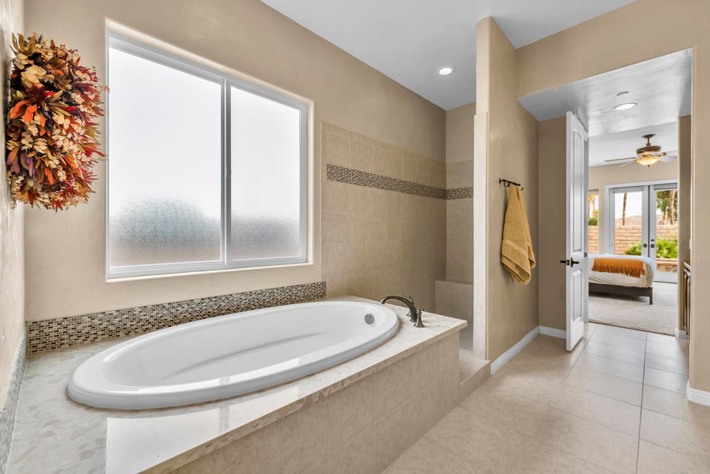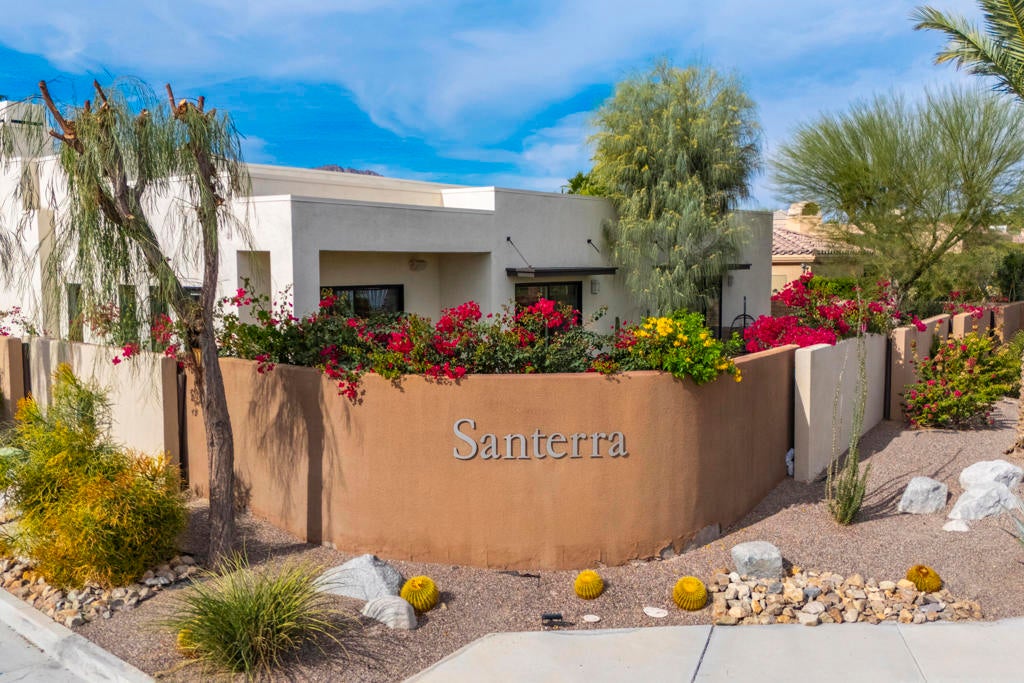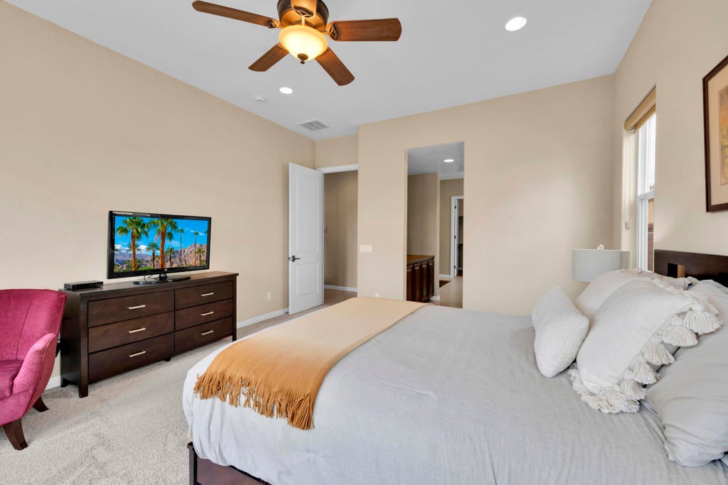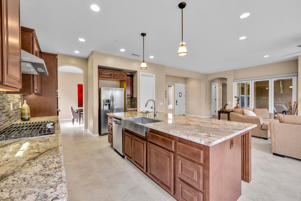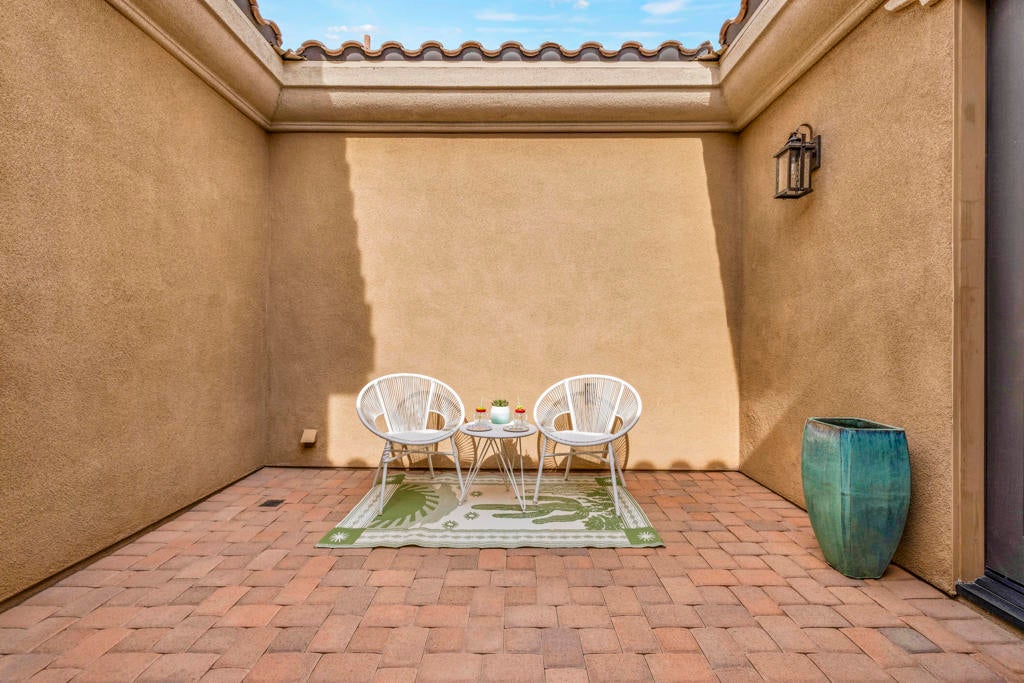 Step beyond the paver-finished courtyard entry and into a sanctuary where luxury meets the quintessential desert lifestyle. This meticulously cared-for residence is a testament to true pride of ownership and features a brilliant, well-designed floor plan offering exceptional separation between the Primary and Guest Suites; notably, all bedrooms are en-suite. The heart of the home is a grand entertaining space with soaring 10-foot ceilings and sun-drenched rooms. The architectural highlight is the expansive great room, where a striking set of accordion pocket doors glides open to the covered patio, creating a seamless, unforgettable indoor-outdoor living experience. The gourmet kitchen is a chef's dream, featuring a grand island, a five-burner gas cooktop, chimney-style range hood, and thoughtful storage including a large pantry and butler's pantry. A double convection oven/microwave combo, ensure every culinary endeavor is a success. Elegance extends to the Primary Suite, a private retreat with dual vanities, a large soaking tub, and French doors leading directly to the resort-style backyard oasis. The outdoor space is defined by the Palm Springs blue PebbleTec swimming pool, tanning shelf, and elevated spa, complemented by handsome pavers throughout. Additional refined interior details, such as the glazed porcelain tile, new carpeting, and Hunter Douglas roller shades, underscore the home's commitment to enduring style, making this a sophisticated and turn-key desert haven.