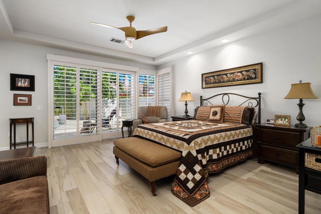 This popular floorplan has a spacious courtyard entry offering stunning south-facing mountain views, creating a warm and inviting first impression. A glass front door welcomes natural light into the foyer and expansive great room beyond.Featuring light wood-look porcelain tile flooring, seamlessly blended with diagonal tiles throughout. Painted wood shutters adorn most windows and doors, adding charm and character. Each generously sized bedroom includes an en-suite bath, ensuring comfort and privacy for all. The third bedroom has french doors to the courtyard and can serve as an attached casita. The luxurious primary suite boasts direct access to the backyard, where a pool and spa provide a private retreat. Drift off to sleep with the soothing sound of the spa waterfall just outside your window. The garage is temperature controlled with a mini-split and the garage floor is custom installed rubber tiles in shades of gray. Lucky cars! Meticulously maintained, this home is a true gem in La Quinta Fairways, a guard gated community located conveniently in the middle of La Quinta, close to restaurants, groceries and shops. La Quinta Fairways is one of four key associations affiliated with PGA West. OPEN HOUSE: Saturday 11-2