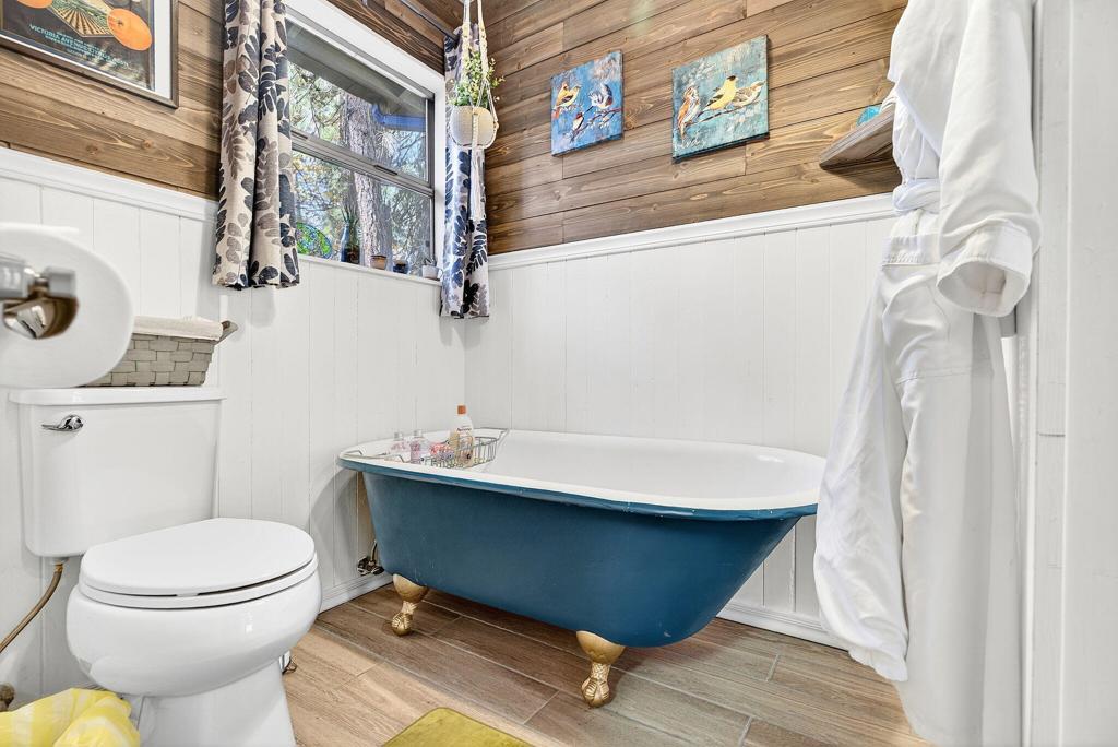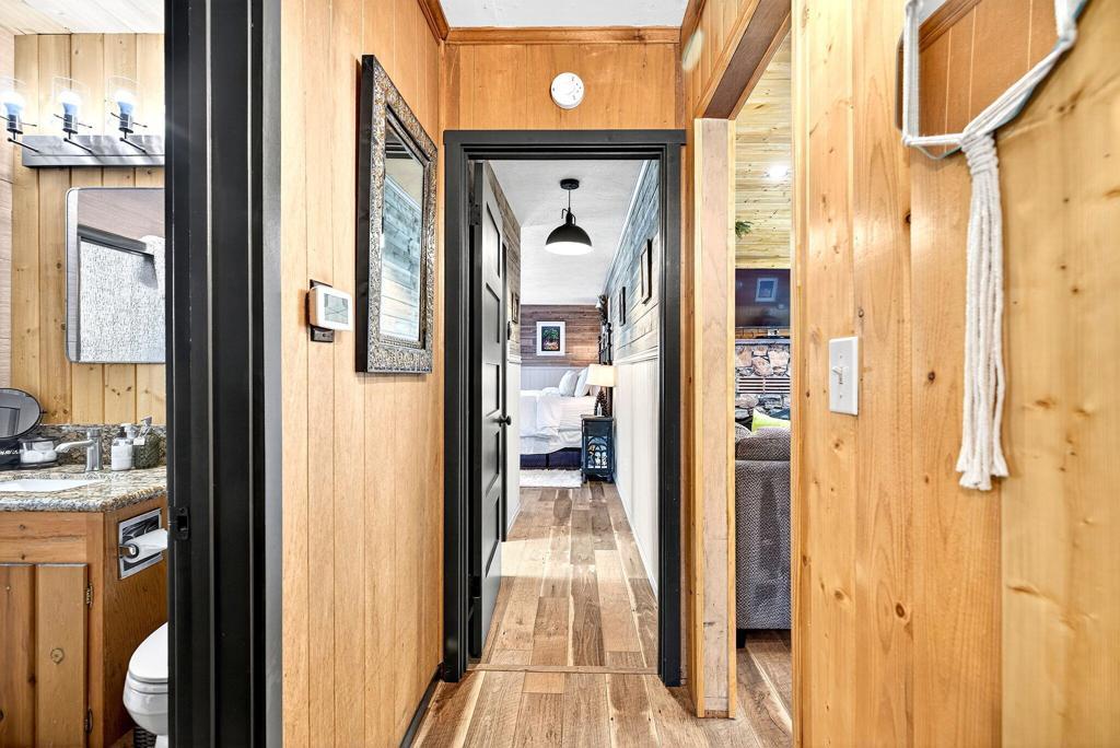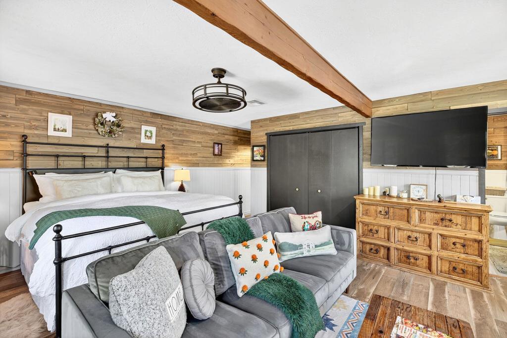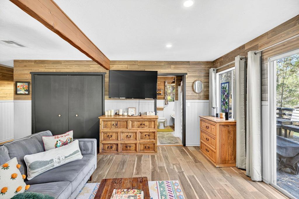 Set on just under an acre of gorgeous, wooded, creekside land with a property line that extends all the way back to Strawberry Creek, this beautifully remodeled ~1575 sq ft 3BR/2BA home blends classic mountain charm with modern comfort. Renovated in 2019, the home features warm knotty pine interiors, upgraded lighting throughout, a spacious living room anchored by the original rock fireplace, and a well-appointed kitchen with granite countertops and stainless steel appliances.The primary suite is a true retreat expansive and inviting with its own wood-burning stove, a cozy sitting area, and direct access to the wraparound deck. The ensuite bathroom offers timeless character with a claw-foot tub, plus a dedicated laundry area with additional storage. Two generously sized guest bedrooms and a second full bath provide ample space for family and visitors.Outside, enjoy the wraparound deck overlooking the serene creek, and take advantage of direct access to Strawberry Creek for peaceful nature walks and quiet moments by the water. The property is fully fenced, with the fenced area added in 2023 and extending about halfway back, while the remaining land continues all the way to the creek line.Additional upgrades include central air conditioning, a rare luxury in Idyllwild. With mostly flat, usable land, maintained roads, and an easy walk to Idyllwild Arts, the elementary school, and town, this home offers natural beauty, comfort, and convenience in one exceptional mountain setting.