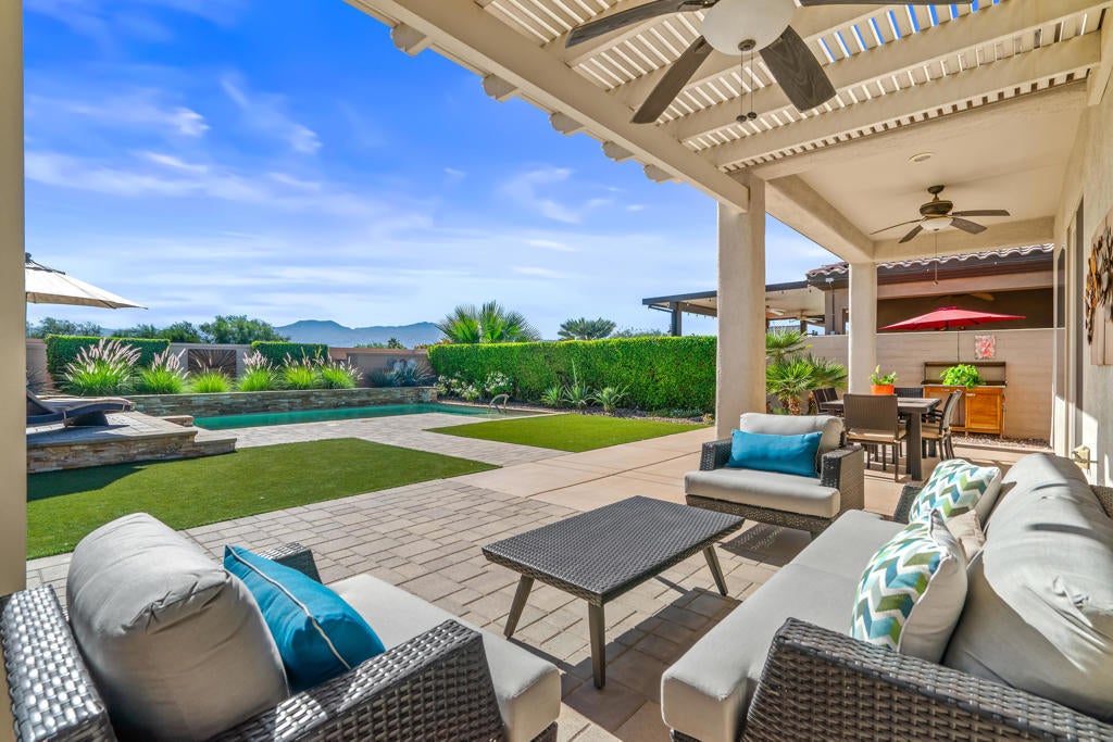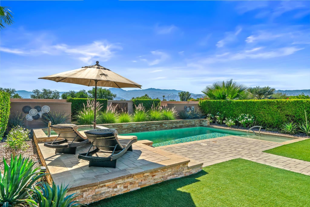 EXCEPTIONAL MODERN ELEGANCE AND REFINED LUXURY in the resort style community of Sun City Shadow Hills! Homes of this caliber rarely come onto the market! Offered TURNKEY FURNISHED, this upscale residence showcases contemporary design, fine finishes and an open floor plan perfect for desert living and effortless entertaining. Enter from a beautifully landscaped walkway into a bright and welcoming dining area that flows gracefully into the chef's kitchen, designed with upgraded cabinetry, Corian countertops, breakfast bar, gas stove and built in microwave. The open living concept anchors the space offering abundant natural light, modern recessed lighting and a seamless connection to the outdoor patio, creating a true indoor/outdoor lifestyle! Conveniently located off the kitchen is the laundry room featuring a utility sink, ample cabinetry and direct access to the garage for everyday ease. The Primary Suite is a serene retreat, offering both comfort and sophistication. Wake up to gentle morning light and views of your sparkling pool, offering a gentle ease into your daily routine The spa inspired ensuite features dual vanities, a glass enclosed shower and a spacious walk in closet, designed for ultimate functionality. Every finish evokes a sense of calm elegance, from the neutral palette to the soft textures and refined details. The Guest Room/Office offers exceptional versatility workspace. Outfitted with a custom Murphy Bed that folds away to reveal a built in desk, easily transformed from a comfortable guest room to a productive home office optimizing dual purpose living! Step outside to your PRIVATE RESORT STYLE OASIS situated on an OVERSIZED PREMIUM LOT capturing breathtaking mountain views. Enjoy a fabulous heated saltwater pool and spa, surrounded by paver decking, a tanning ledge and multiple areas for lounging and entertaining. A large covered patio with a pergola provides shade and comfort for alfresco dining, while the professional landscaping with Ficus greenbelts ensues both beauty and privacy EVERY surface and detail from doors and fixtures to lighting and hardware reflects the quality craftmanship and a commitment to luxurious living! CELEBRATE LIFE in prestigious 55+ Sun City Shadow Hills, where residents enjoy two golf courses, clubhouses, fitness centers, pools, tennis, pickleball courts and a whole calendar of clubs and social events. TURNKEY, STYLISH AND IMPECCABLY MAINTAINTED... THIS IS IT!