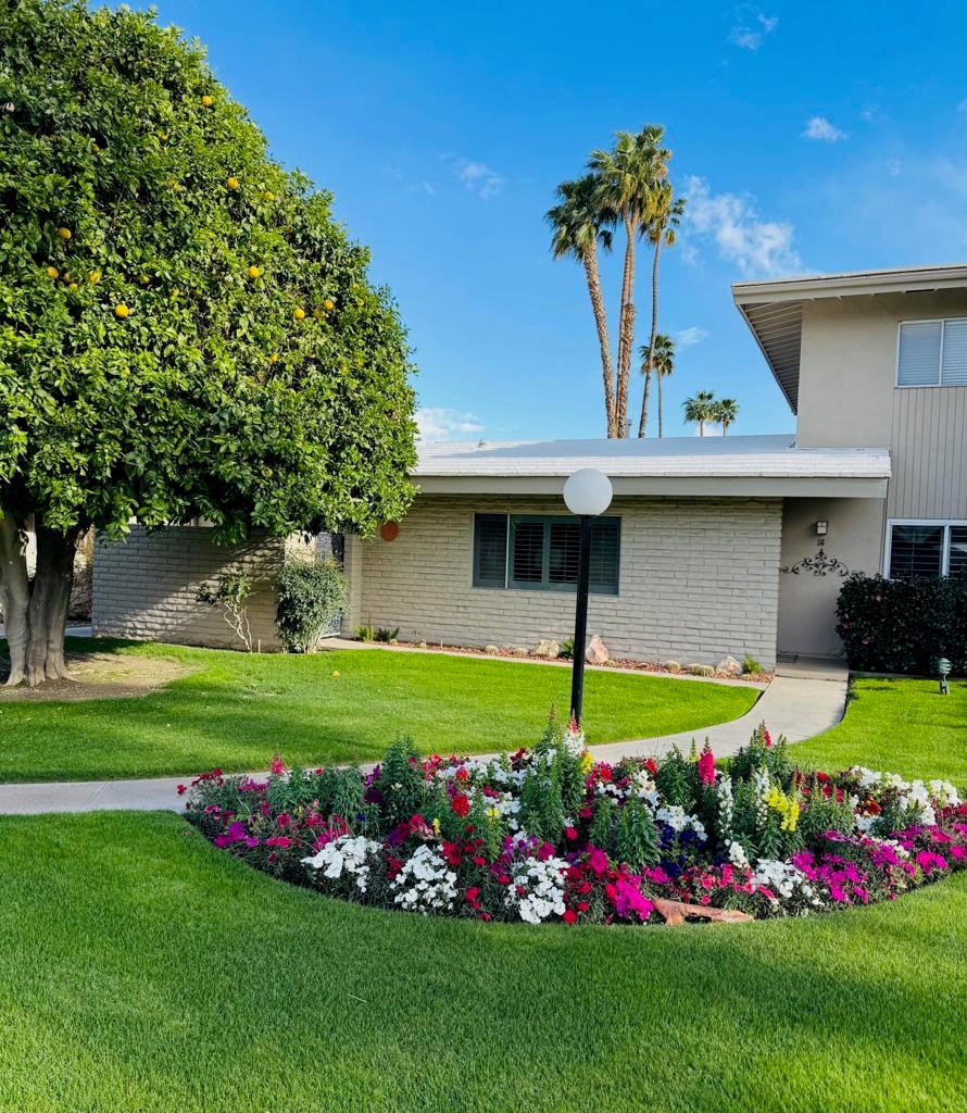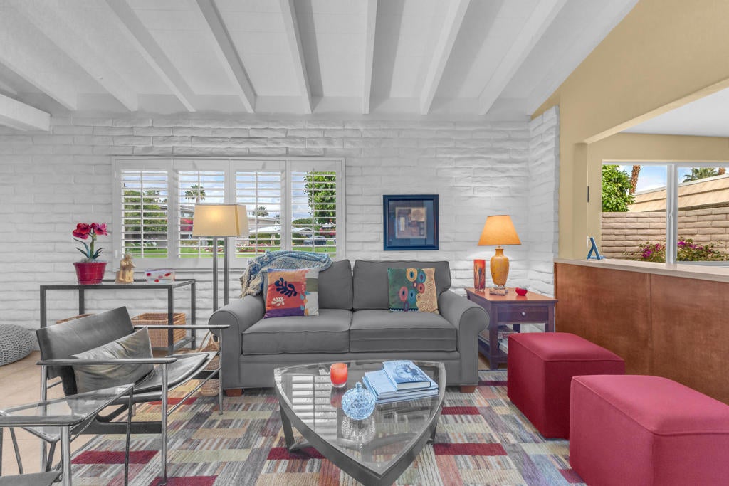 Price Reduced! What an amazing value! Rarely available and incredibly charming ''dollhouse'' boasting vaulted beamed ceilings, sleek tile flooring and custom features galore. The only unit of this type with 2 bathrooms. You'll love the plantations shutters, cozy outdoor living spaces, 3 skylights, built-in gas wall fireplace and original checkerboard ceiling design in the great room. Located in a quiet location, this one level home with no steps is close but not too close to the pool & spa. The newer mini-split HVAC system is perfect for lower utility bills plus you have your own interior washer & dryer. Each unit has a designated carport with storage above. Situated on over 12 acres Desert Braemar is a low density co-op community, called the 'hidden gem of the desert'. Every amenity is yours including pool/spa, gym, library, workshop, tennis/pickleball, putting green, lawn bowling, shuffleboard, clubhouse with amazing kitchen and terrace, on site manager M-F. Your co-op monthly fee includes all amenities, maintenance, water, sewer, trash, Spectrum high speed internet plus cable including HBO and Showtime AND YOUR PROPERTY TAXES! 55+ community. Desert Braemar is a Stock Cooperative and each owner is issued a 'stock certificate granting a specific number of shares of the complex with exclusive use of a particular unit. Cash sales only. Better hurry on this one before it gets away!