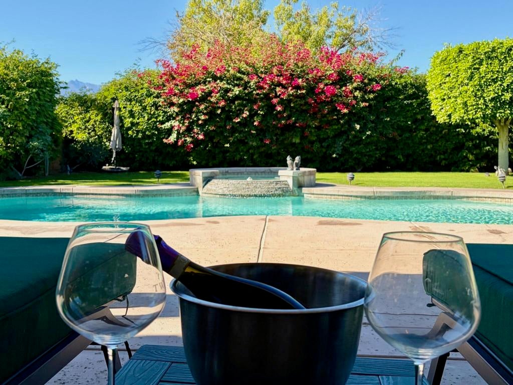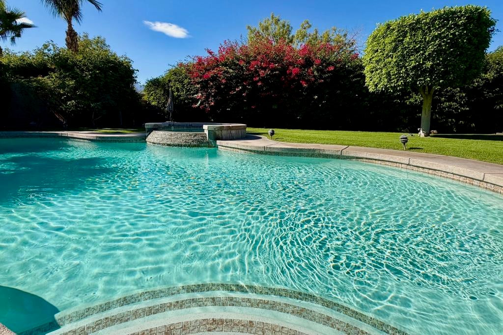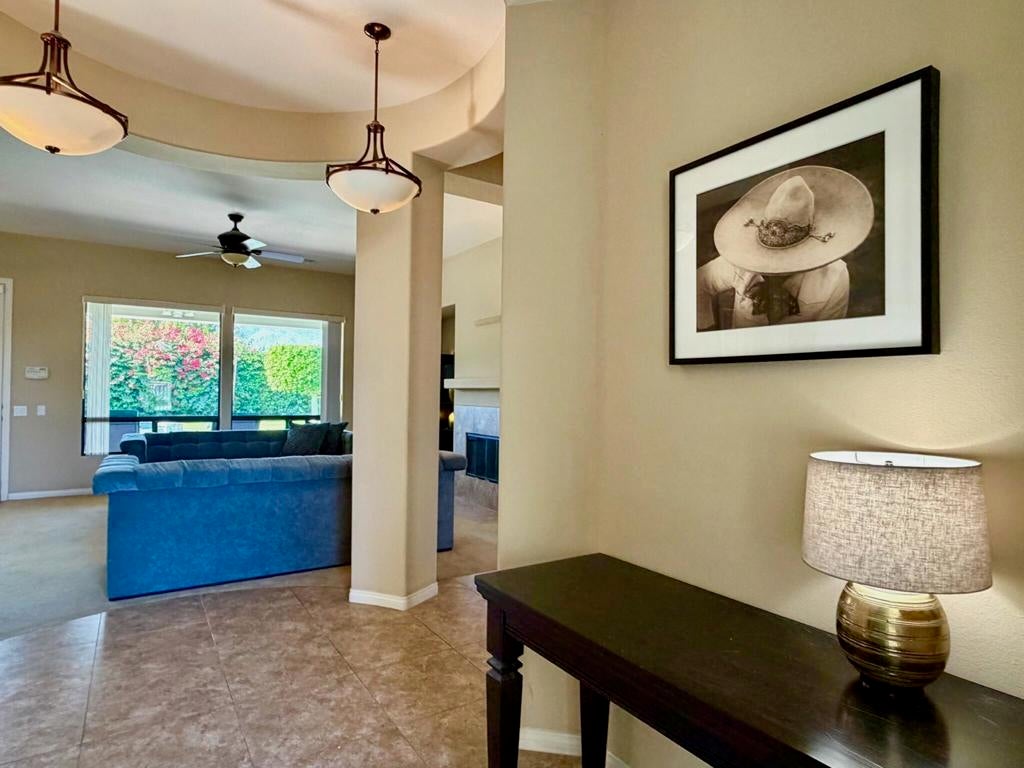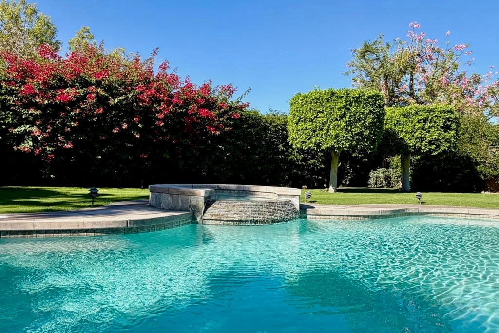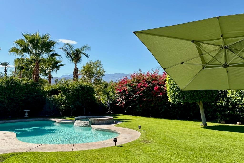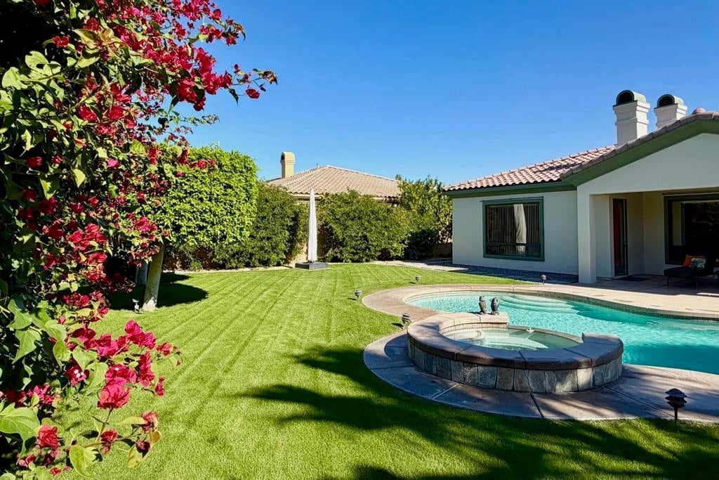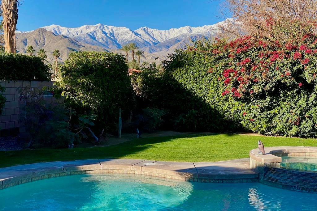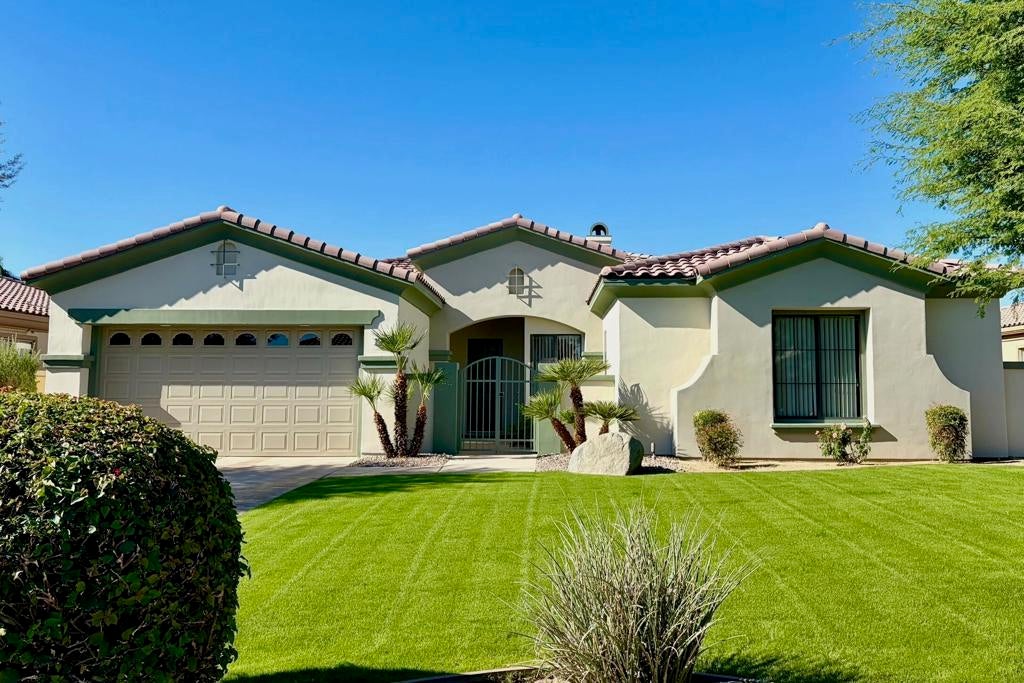 Enjoy the best of all worlds - the serenity of a small, gated community, along with proximity to Cathedral City's Arts and Entertainment District and nearby Mission Hills Country Club. This freshly painted, 2463 square foot home is a spa oasis: lush, private landscaping, a heated pool/spa, and beautiful views of the Santa Rosa & San Jacinto mountains. You enter the home through a courtyard into the welcoming entry rotunda. Ahead will be the large great room with high ceilings, gas fireplace, access to a covered patio, and beautiful views of the pool, landscape and mountains. To the left of the great room is the large kitchen with granite counters and stainless (gas) appliances -- and an inviting dining area. Heading through the kitchen toward the 2-car garage, you'll find the laundry room (with washer/dryer/sink) and a convenient office area. Heading from the kitchen toward the rotunda, you'll pass the walk-in kitchen pantry and half bath before reaching the first of three bedrooms. This bedroom/den features double doors and a 3/4 en-suite bathroom. Continuing down the hallway -- to the right is very large second bedroom with full en-suite bathroom and a separate dressing/sitting area. Down the hall is the primary bedroom - a serene setting with gas fireplace, access to the covered patio and pool, beautiful views of San Jacinto Mountains and a large en-suite bathroom with soaking tub, shower stall, double vanities and a large walk-in closet. This home features a leased Solar panel system, and a recently installed HVAC system (2023) and water heater (2024).