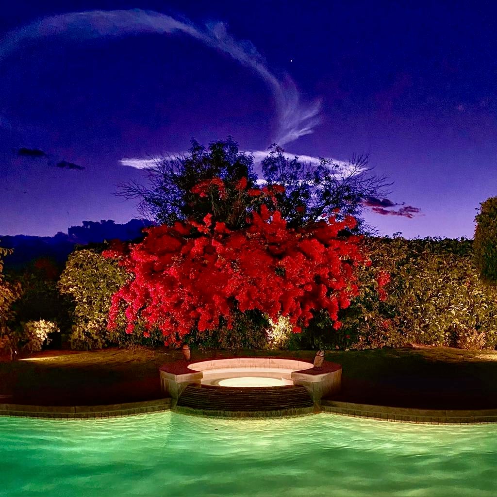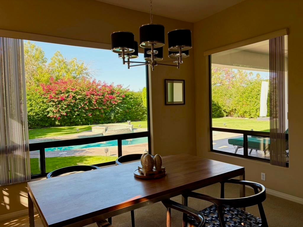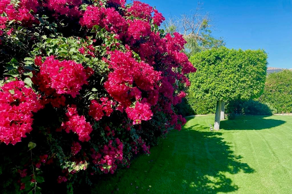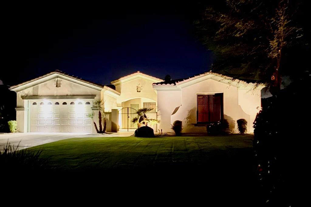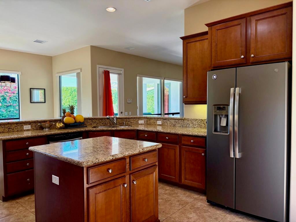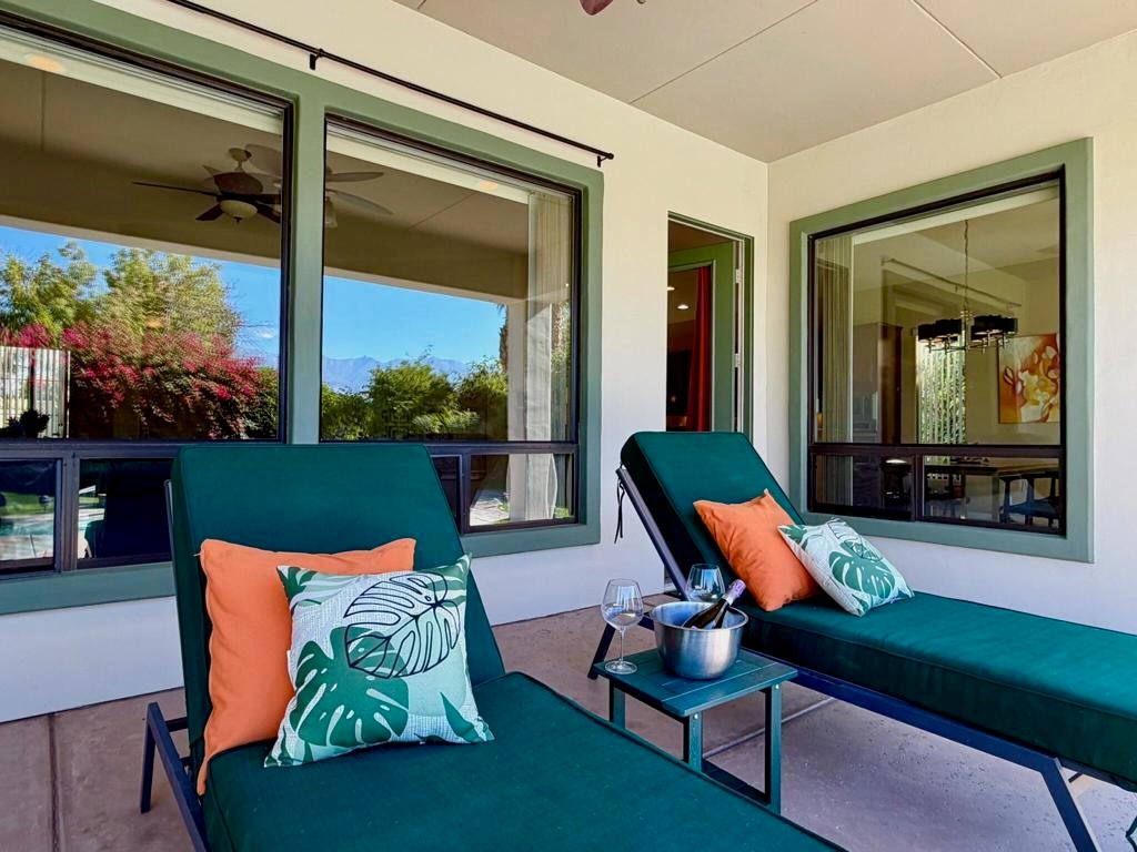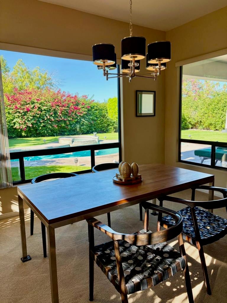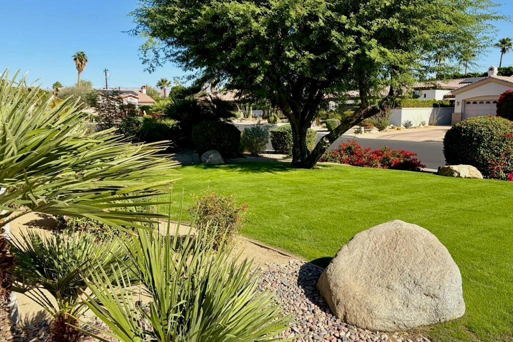 Enjoy the best of all worlds - the serenity of a small, gated community, along with proximity to Cathedral City's Arts and Entertainment District and nearby Mission Hills Country Club. This freshly painted, 2463 square foot home is a spa oasis: lush, private landscaping, a heated pool/spa, and beautiful views of the Santa Rosa & San Jacinto mountains. You enter the home through a courtyard into the welcoming entry rotunda. Ahead will be the large great room with high ceilings, gas fireplace, access to a covered patio, and beautiful views of the pool, landscape and mountains. To the left of the great room is the large kitchen with granite counters and stainless (gas) appliances -- and an inviting dining area. Heading through the kitchen toward the 2-car garage, you'll find the laundry room (with washer/dryer/sink) and a convenient office area. Heading from the kitchen toward the rotunda, you'll pass the walk-in kitchen pantry and half bath before reaching the first of three bedrooms. This bedroom/den features double doors and a 3/4 en-suite bathroom. Continuing down the hallway -- to the right is very large second bedroom with full en-suite bathroom and a separate dressing/sitting area. Down the hall is the primary bedroom - a serene setting with gas fireplace, access to the covered patio and pool, beautiful views of San Jacinto Mountains and a large en-suite bathroom with soaking tub, shower stall, double vanities and a large walk-in closet. This home features a leased Solar panel system, and a recently installed HVAC system (2023) and water heater (2024).
