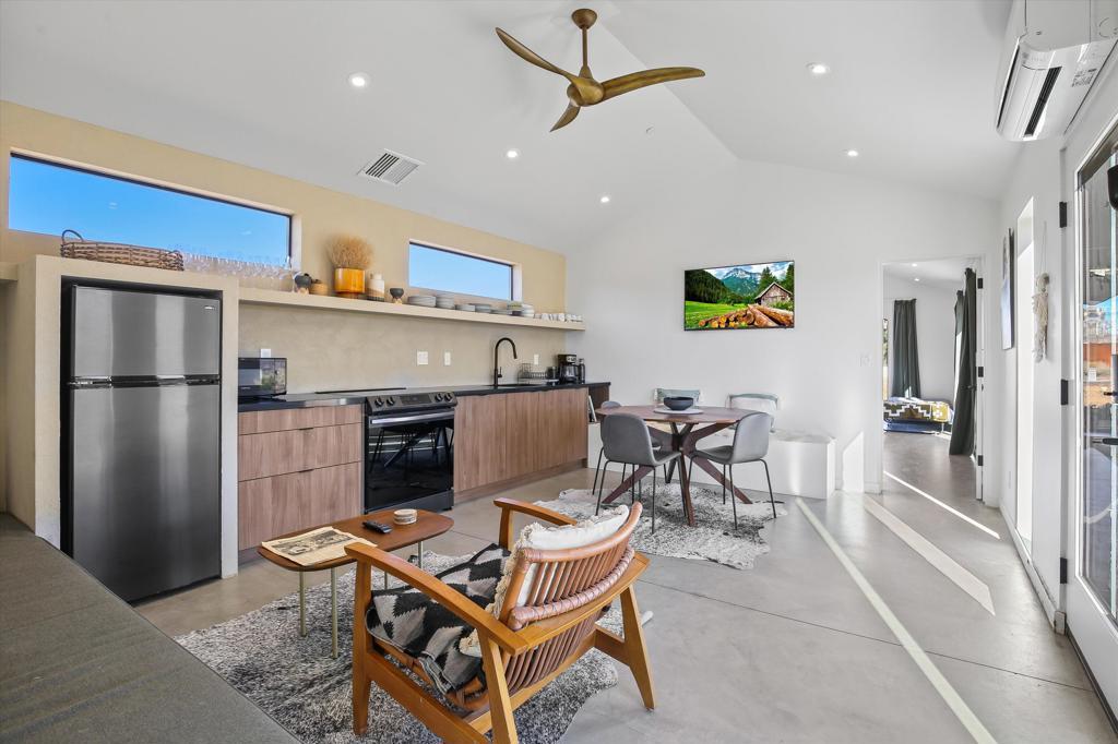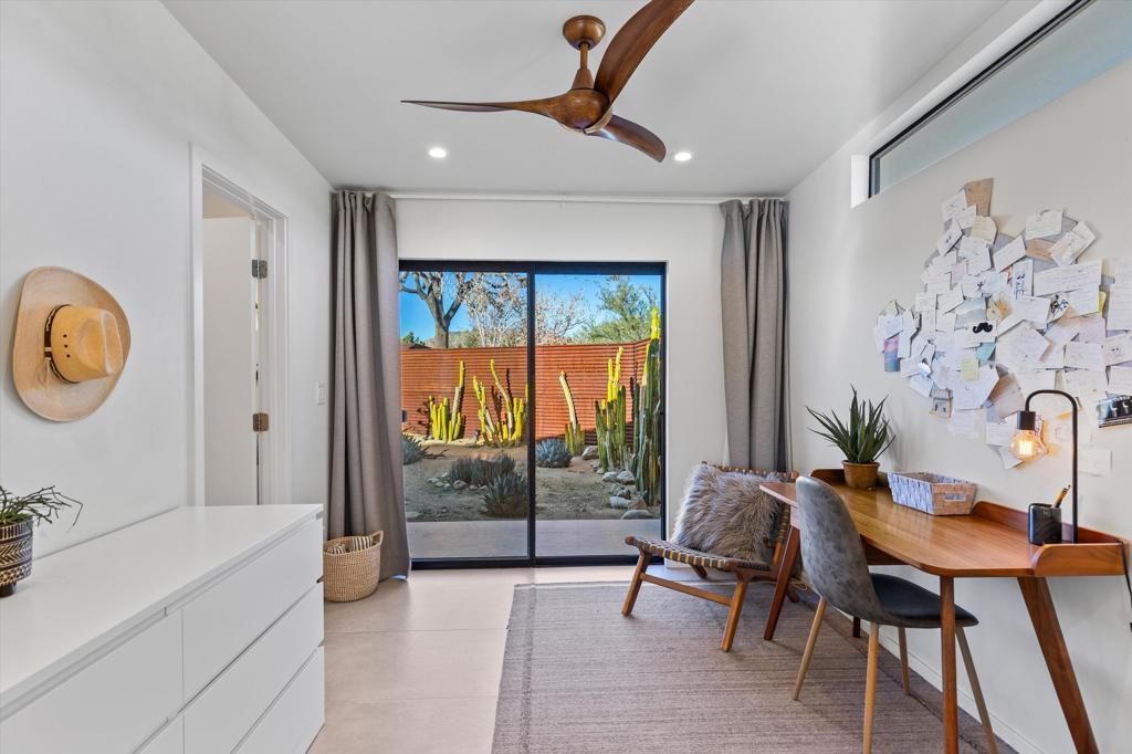 A contemporary Pipes Canyon compound by Wolfgang Pichler where architecture, landscape and light come together. Set on a private rise with long, open views, the property looks out toward the Sawtooth Mountains, distant boulder fields and wide mesa lines. The setting feels quiet and expansive, with intentional desert landscaping, specimen trees and mature plantings that frame the homes and create a sense of privacy. The main house, renovated in 2019, is designed for true indoor-outdoor living, with floor-to-ceiling glass, a clean open layout and a modern kitchen anchored by a large island. The primary suite continues the indoor-outdoor flow with a spa-like bath that includes a soaking tub, a walk-in shower and access to a private outdoor area with an outdoor shower. The second bedroom features its own en-suite bath and a private outdoor connection. The ADU, built in 2022, follows the same architectural language, offering large picture windows, beautiful natural light and far-reaching views. It includes two bedrooms with en-suite baths, a well-designed kitchen and a comfortable living area. Outdoor spaces are designed for easy gathering and relaxation, with an elevated deck, cowboy pool, spa, two outdoor soaking tubs, a fire feature, an open-air dining area and a collection of thoughtfully placed seating areas throughout the property, each oriented toward different views and moments in the landscape. With privacy, striking landscapes and thoughtful architecture, this property works as a full-time home, private retreat or high-performing short-term rental. It already enjoys strong rental income with significant opportunity to grow even further. Minutes to Pioneertown, Pappy and Harriets and Red Dog Saloon, and close to the trails of the Pioneertown Mountains Preserve and the Sand to Snow National Monument. Also an easy drive to La Copine, The Integratron, downtown Joshua Tree and Joshua Tree National Park, all while feeling quiet, private and immersed in one of the most sought after pockets of Pipes Canyon.