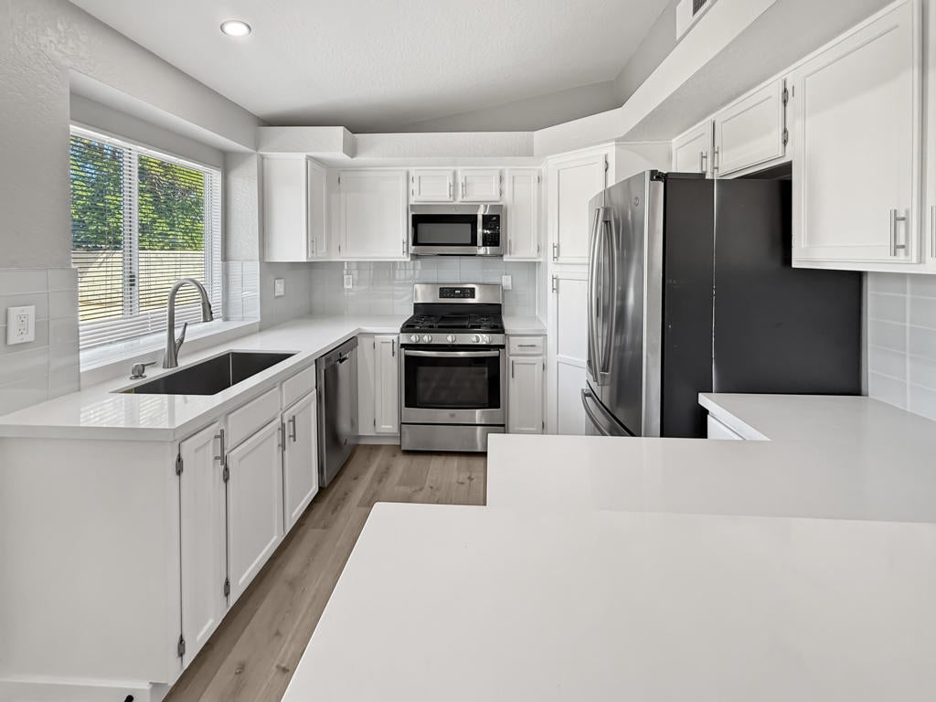 Beautifully Renovated Home with Included Electricity Move-In Ready!Welcome to this freshly remodeled 3-bedroom, 2-bath home in Cathedral City offering modern style, comfort, and value. Inside, you'll find an open floor plan with brand-new luxury vinyl flooring, recessed lighting, and a bright kitchen featuring white cabinetry, quartz countertops, and stainless-steel appliances. The spacious living area includes a cozy fireplace and large windows for plenty of natural light.The primary suite offers an updated bath with dual sinks, quartz counters, and a marble-style walk-in shower with built-in bench and grab bars for added comfort.Key Features: Electricity included in the monthly rent (tenant pays only for water and gas; overage applies if usage exceeds solar production) Landscaping service included Modern kitchen and bathrooms Two-car attached garage and low-maintenance desert landscaping Convenient location near Panorama Park and minutes to downtown Palm SpringsThis home offers a perfect blend of modern design and practical living with low utility costs and minimal upkeep ideal for long-term tenants looking for comfort and efficiency.