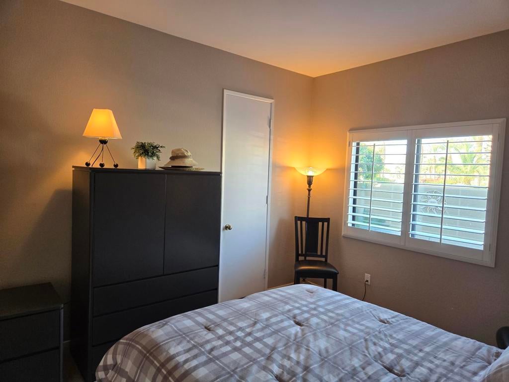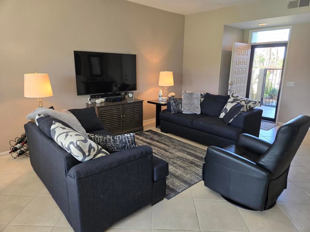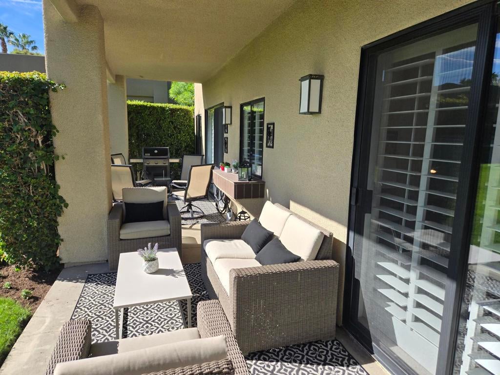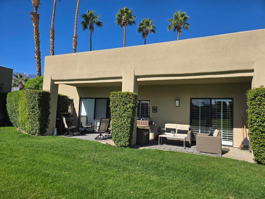 Bright & Modern 2-Bedroom Condo with Stunning Southeast Views from the patio with mountain vistas and the Arroyos fountain from the front entry.Enjoy beautiful water and fairway scenery from this light-filled, remodeled condo in Desert Princess. The spacious park-like setting is perfect for grandchildren to play safely in a no-golf ball zone, protected from the wind.Features include: HVAC replaced in 2024 Neutral 18x18 tile flooring throughout Remodeled kitchen with newer cabinets and stainless-steel appliances Updated bathrooms Newer washer and dryer White California shutters throughoutPet owners will appreciate the secure gated front courtyard, and the drywalled garage offers added shelves and a stand-alone cabinet for extra storage. Located just steps from the pool in the heart of Desert Princess, this home combines comfort, style, and convenience.Land Lease has been extended to 2069, Monthly Ground Rent is $186.94.HOA DUES INCLUDE: 2 DVR or HD Cable boxes and service, High Speed Internet, grounds maintained to your door by HOA ground maintenance crew, outside pest control when requested, outside water (you pay only for inside water). Gated community with 24-hour guard gate access, membership to Health and Fitness Center, Tennis, Bocce Ball, and Pickleball. Discounts and preferred tee-times for owners at the Desert Princess 27-hole PGA Championship golf course, no initiation fees, rated among the best in the valley by GOLF DIGEST. This quiet community is away from the noise yet minutes from everything that is in Palm Springs: restaurants, shopping, casinos, an international airport, the Tramway, Art Museum, Theaters, and the Street Fair.