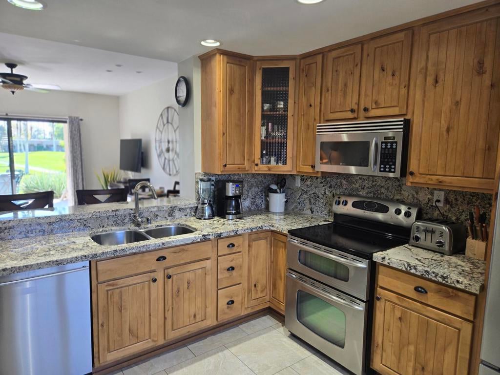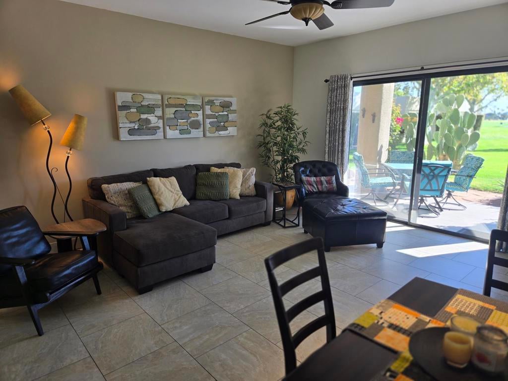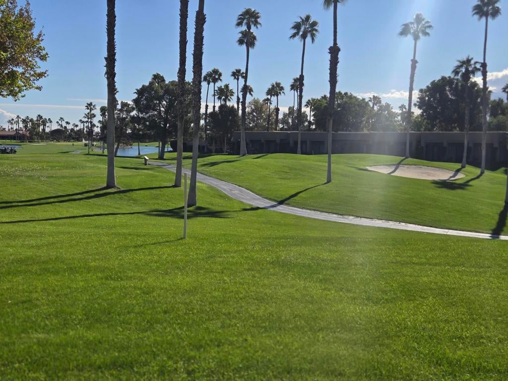 Completely remodeled, this beautifully appointed 3-bedroom end-unit condo features south-facing views of Lagos 8 green, Lagos 9 fairway, a pond with fountains, and mountain vistas. Interior upgrades include six-panel doors with glass transoms, updated cabinetry for enhanced storage, quality furnishings, a serene back patio, newer washer and dryer, and an HVAC system approximately 10 years old. Move-in ready--just bring your essentialsLand Lease extended to 2069 and Monthly Ground Rent is $186.94.HOA DUES INCLUDE: 2 DVR or HD Cable boxes and service, High Speed Internet, grounds maintained to your door by HOA ground maintenance crew, outside pest control when requested, outside water (you pay only for inside water). Gated community with 24-hour guard gate access, membership to Health and Fitness Center, Tennis, Bocce Ball, and Pickleball. Discounts and preferred tee-times for owners at the Desert Princess 27-hole PGA Championship golf course, no initiation fees, rated among the best in the valley by GOLF DIGEST. This quiet community is away from the noise yet minutes from everything that is in Palm Springs: restaurants, shopping, casinos, an international airport, the Tramway, Art Museum, Theaters, and the Street Fair.