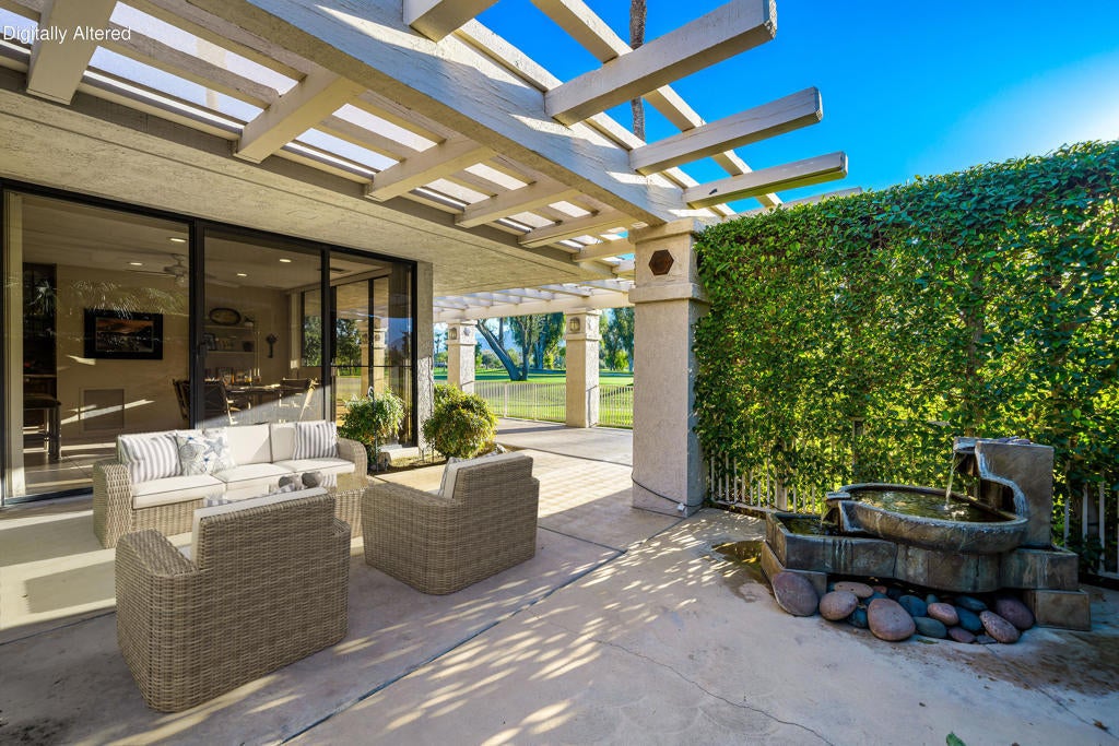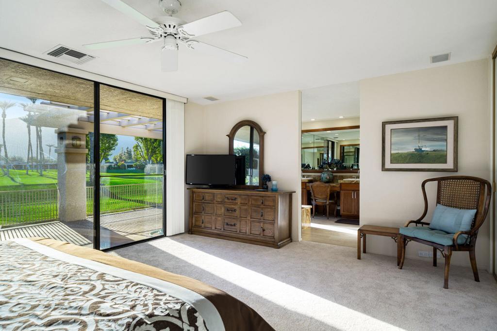 Experience luxury living at its finest in this elegant 3-bedroom, 3-bathroom home, perfectly situated on the prestigious third fairway of The Springs Country Club. This meticulously maintained property offers expansive breathtaking golf course views, combining sophistication and comfort for both relaxation and entertaining. The open-concept layout creates a seamless flow between the living, dining, and outdoor spaces, blending charm and functionality throughout. The inviting kitchen is equipped with modern appliances, ample counter space, and custom cabinetry, making it an ideal setting for entertaining guests or enjoying quiet meals at home. Each bedroom provides a cozy retreat, including two guest bedrooms, each with its own en suite bathroom for enhanced privacy and convenience. The primary suite stands out with a spa-like bathroom and direct access to the tranquil outdoor patio, offering the perfect sanctuary for relaxation. Enjoy the advantages of leased solar panels, which help reduce energy costs and support eco-friendly living without compromising comfort. Residents of The Springs Country Club have access to a wide array of exceptional amenities, including a brand-new redesigned championship golf course, new tennis & pickleball courts, a state-of-the-art fitness center, and a clubhouse featuring fine dining experiences. Whether taking in the panoramic views or immersing yourself in the vibrant community lifestyle, this home offers a unique opportunity to enjoy one of Rancho Mirage's most sought-after locations. Don't miss your chance to own this exquisite property and experience the best of desert living.