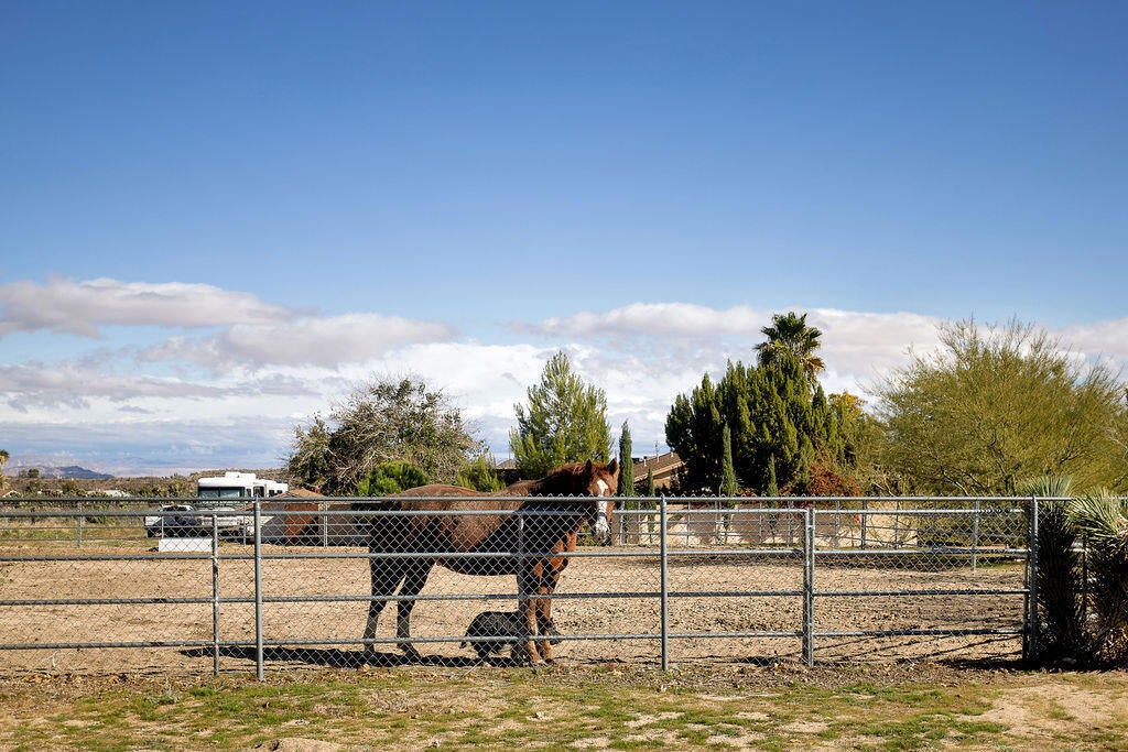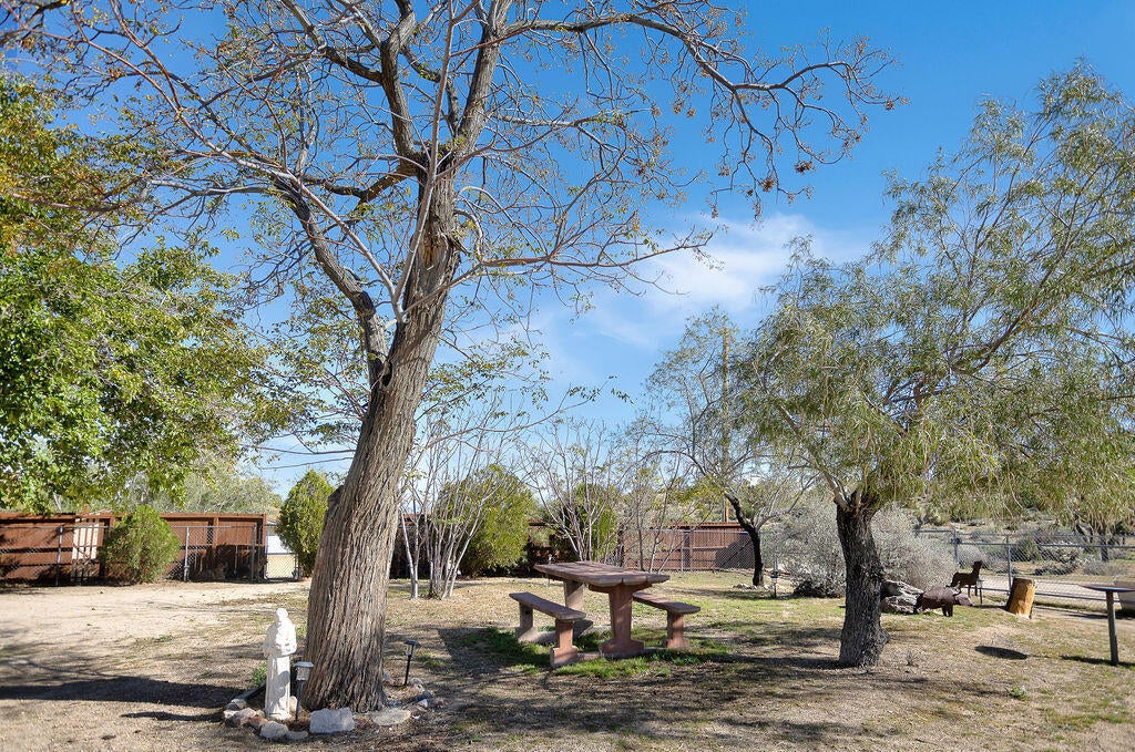 Park-Like Setting. Welcome to this charming 2-bedroom, 2-bath, 2- car garage home located in the desirable Rancho Mesa area of Yucca Valley. The open living room flows seamlessly into the kitchen and extends to an oversized patio, perfect for entertaining. The primary bedroom features a luxurious custom bathtub and walk-in shower, while the guest bedroom offers stunning views of natural rock formations. Energy-efficient ductless heating/air conditioning and an evaporative cooler ensures year-round comfort. Mature trees and desert landscaping create a tranquil setting across 2.29 fully fenced acres, complete with an automatic entry gate for privacy and security. A separately fenced horse arena makes this property ideal for equestrian enthusiasts, while expansive outdoor space is well-suited for animal lovers, hobbyists or an ADU. Plenty of room to bring your vision to life.