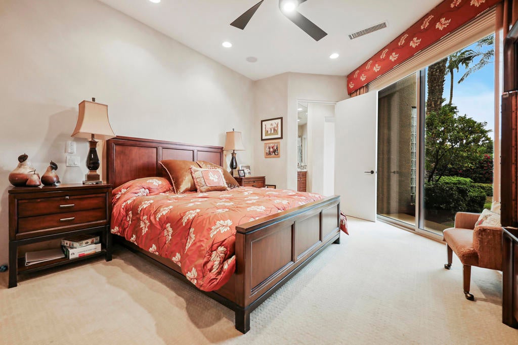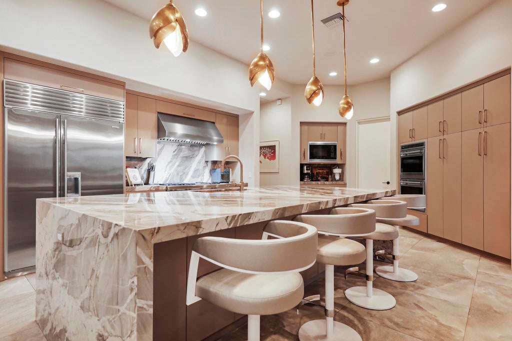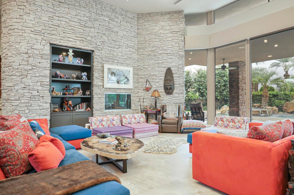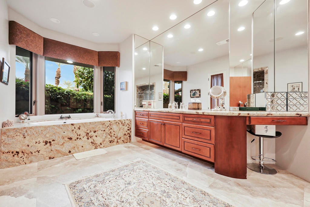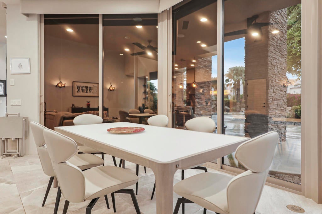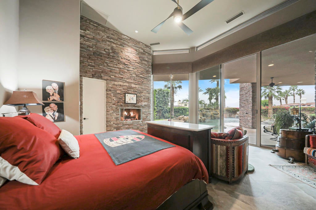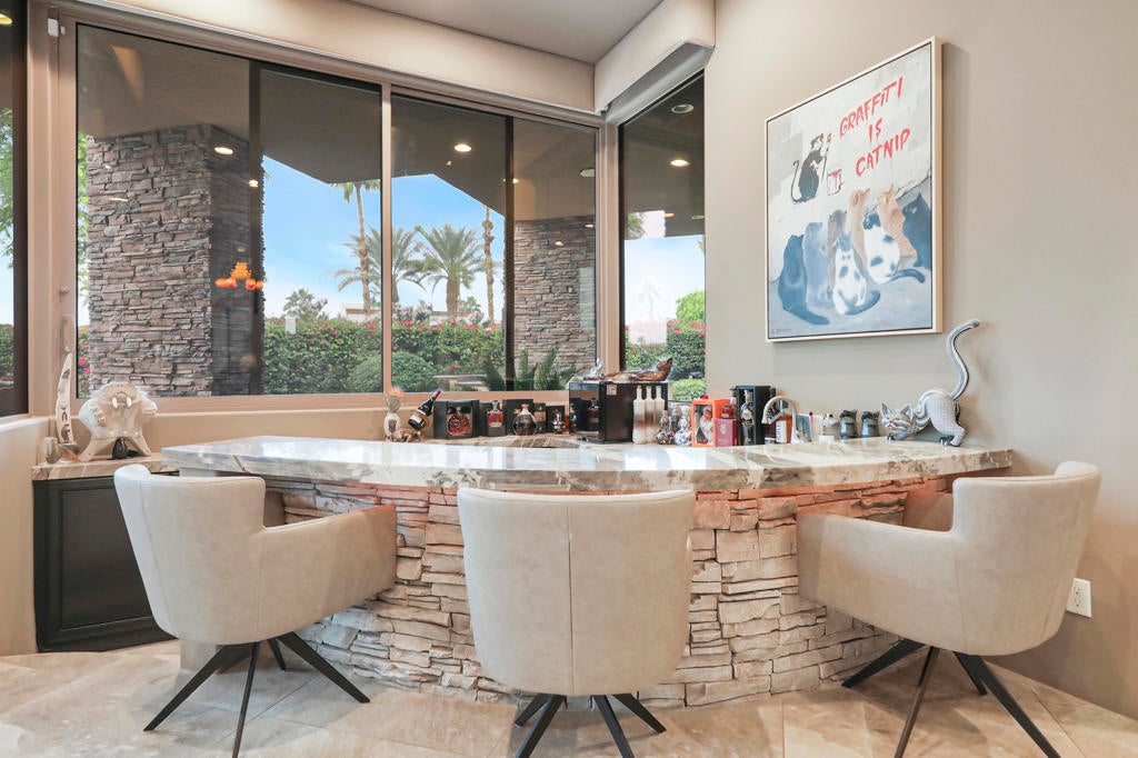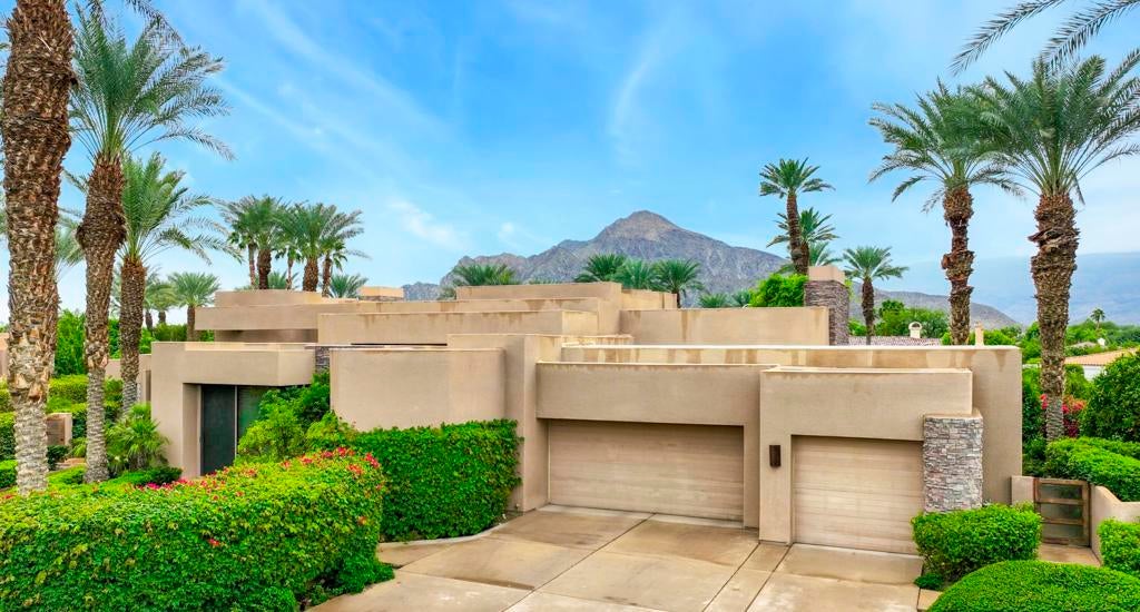 Architectural Masterpiece in The Estancias with mountain views. An exceptional, custom-designed residence by renowned Architect John Walling, was just listed in this prestigious community. Travel down a long circular private driveway and walk through the lush courtyard. Enter through the towering steel and glass entry doors to be instantly captivated by the spacious living room adorned with15 ft high ceilings, dramatic walls of glass and a commanding stacked-stone fireplace. There's an adjacent wet bar that's been updated in modern sophistication, with sleek contemporary cabinetry and stunning marble countertops with a large pass-through window to the patio. The chef's kitchen was also updated with gorgeous counter tops featuring waterfall edges, sleek cabinets and stainless appliances, plus, two large pantries. The private primary wing offers a sanctuary of peace complete with an adjoining executive office with views to the mountains and pool. There's a dedicated fitness studio, as well. The primary bathroom offers granite counter, spa tub, a large shower, and two separate water closets. All secondary bedrooms are large and luxurious, private en-suites. The private backyard is an entertainer's dream offering a lush, enclosed oasis featuring a resort-style pool with waterfalls, a large whirlpool spa, a unique island fire pit, all anchored by a spacious covered patio with a full outdoor grill/bar. Enjoy spectacular, unobstructed views of the majestic Santa Rosa Mountains. Completing this immaculate estate is a fully finished, upgraded garage with storage cabinets and convenient direct access to the kitchen. This is quintessential desert luxury, redefined.