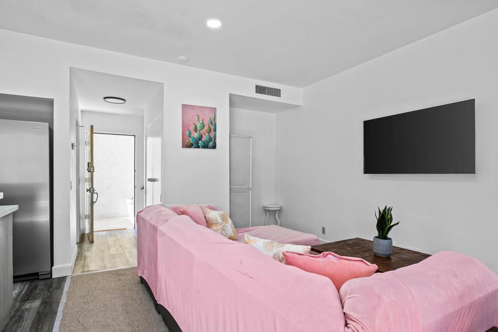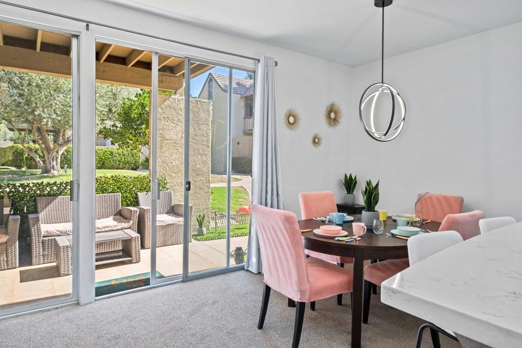 Short-term rental-friendly gem in Indian Wells! Inside guard-gated Mountain Cove, this remodeled and furnished 2BD/2BA two-level condo delivers resort-style living with income potential. Framed by the Santa Rosa Mountains, lush greenbelts, and citrus-lined walking paths with fresh fruit in season, it's a short stroll to two of three community pools, heated in winter. The open-concept main level centers on a sleek kitchen with quartz counters, stainless appliances, custom storage, and an oversized island with bar seating that flows into the light-filled living area and out to a private patio. Upstairs, two generous bedrooms share a large balcony with beautiful views -- perfect for morning coffee or sunset cocktails. Newer carpet in the living areas pairs with luxury vinyl plank in the kitchen and baths for a polished, low-maintenance finish. With short-term rentals allowed (buyer to verify with City/HOA), it works beautifully as a vacation rental, second home, or full-time residence. Indian Wells residents also enjoy city perks, including discounted golf and resort benefits, plus convenient community laundry. All of this in a prime location near Highway 111, Indian Wells Golf Resort, shopping, and dining. This is the lock-and-leave desert escape buyers are asking for right now.