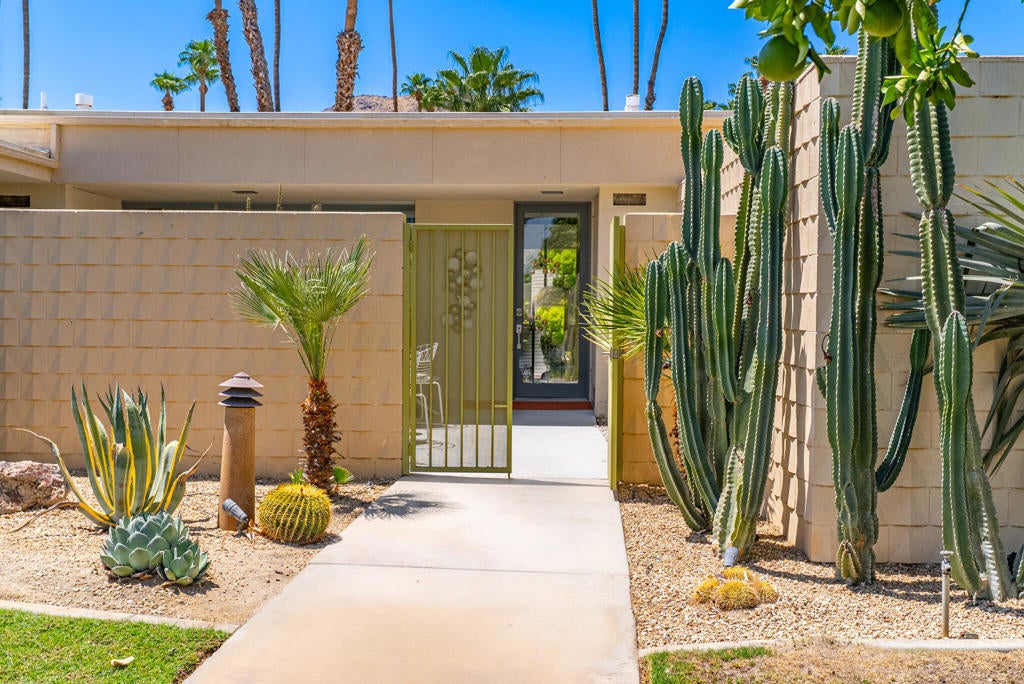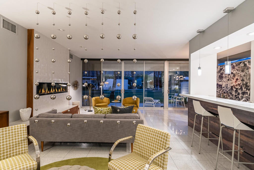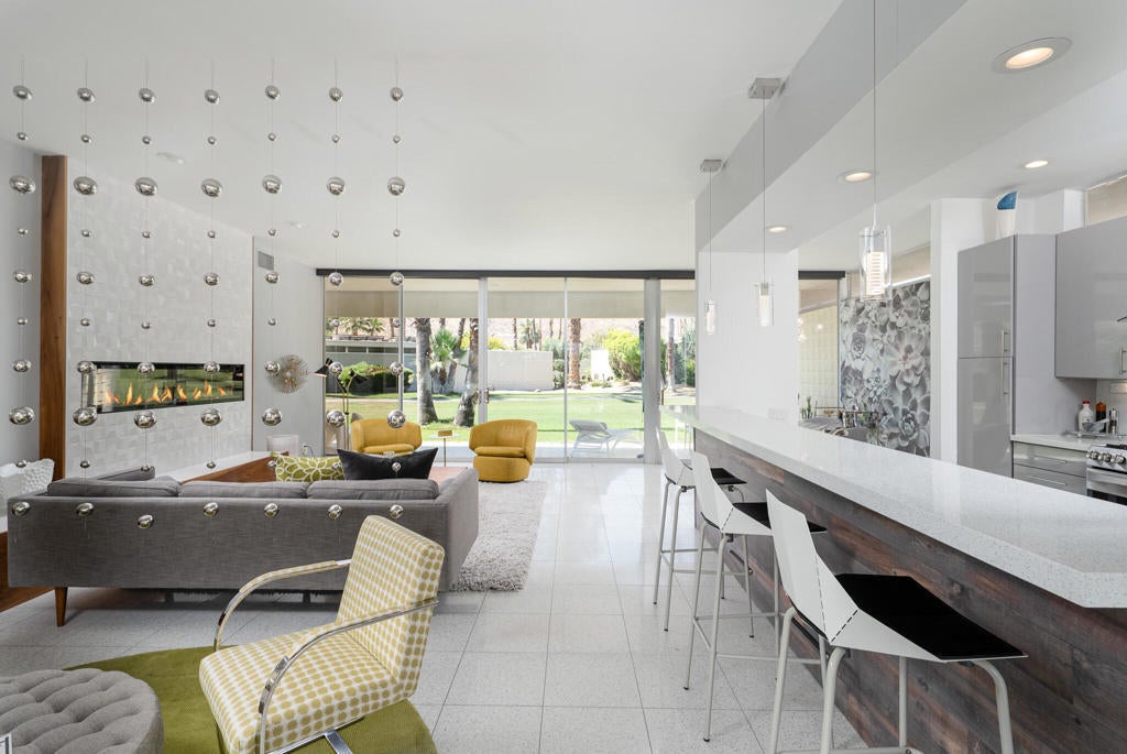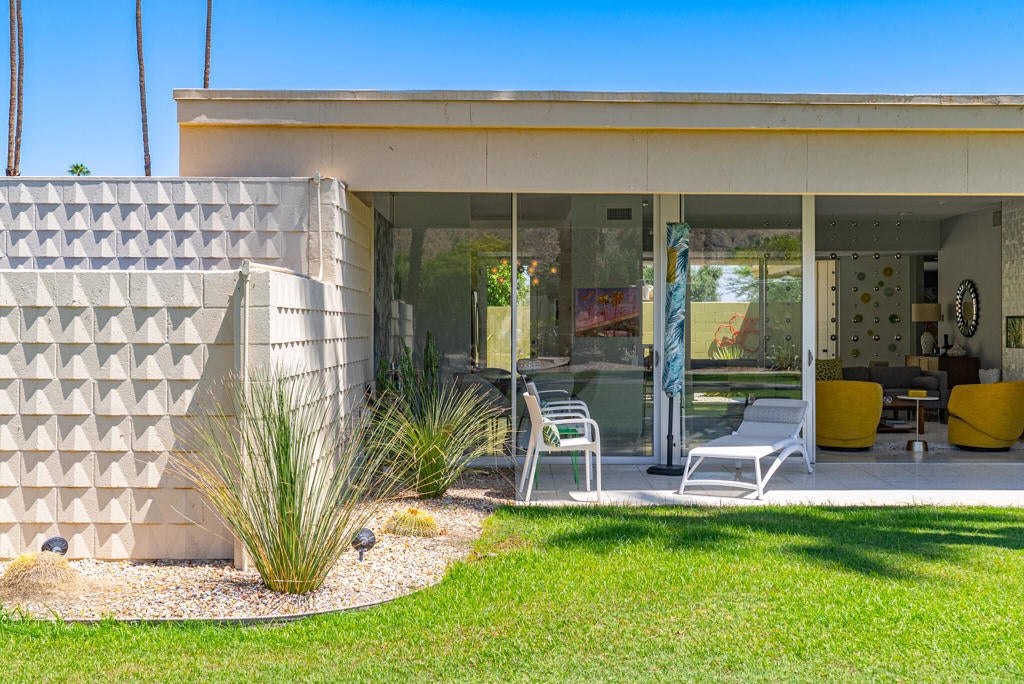 This beautifully remodeled 2bed/2bath home is just waiting for you to call home at the coveted Seven Lakes Country Club. Originally designed by Richard A. Harrison, inside its mod shadow-blocked walls, you'll find a spacious unit updated for today's living. Spread out over the 1,545 sq ft open floor plan, highlighted by light terrazzo tile floors, get ready to entertain in style! The remodeled kitchen is finished with KraftMaid grey cabinetry, sparkling stainless steel appliances, and ample quartz countertops, including a large breakfast bar. Walls of glass sliders open out onto a green leisure terrace with views of the mountains and the iconic Southridge estates. Enclosed for maximum privacy, the northern window wall opens onto a large private courtyard lined with a desertscaped perimeter garden. Both spacious bedrooms offer great closets as well. An assigned two-car garage is available while the tranquil pool is just steps away. The roof has been recently recoated as of July 2025. Past the 24-hour guarded front gate, 'The Gem of the Desert' offers a unique elevated lifestyle with its Ted Robinson-designed 18-hole executive golf course, 15 pools and spas with poolhouses, and the lively William Cody-designed clubhouse with a formal dining room, casual cocktail lounge, and a terrace overlooking the waterfall-fountain. Welcome home!