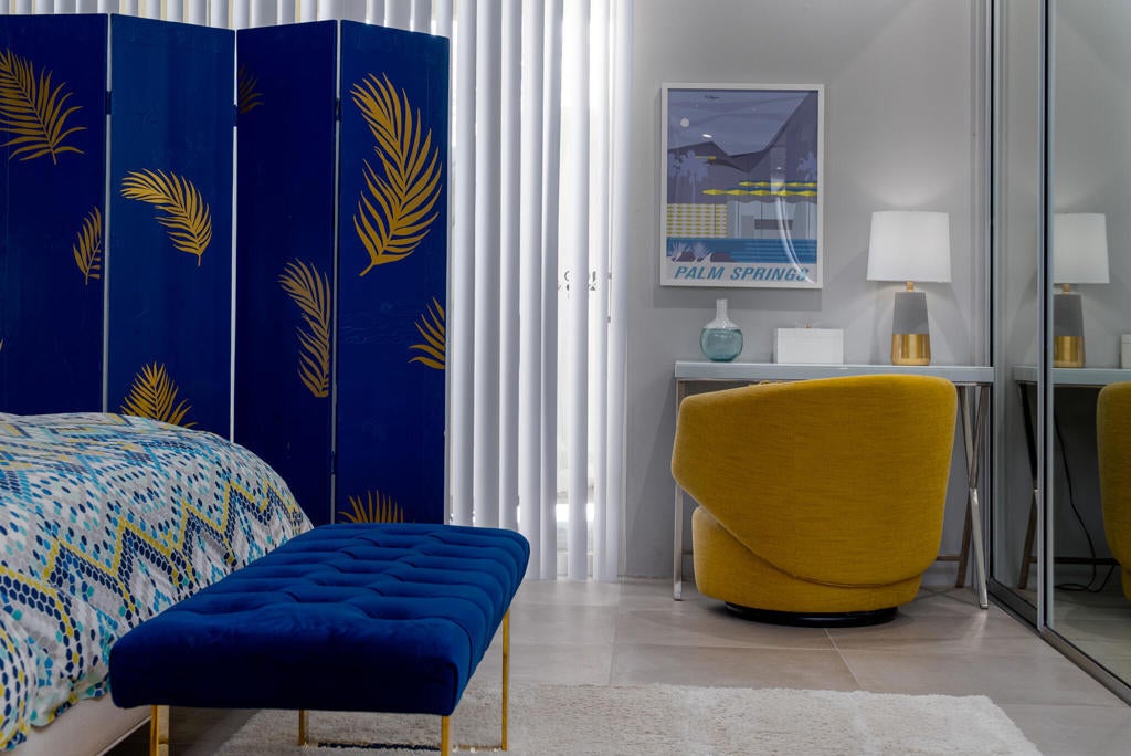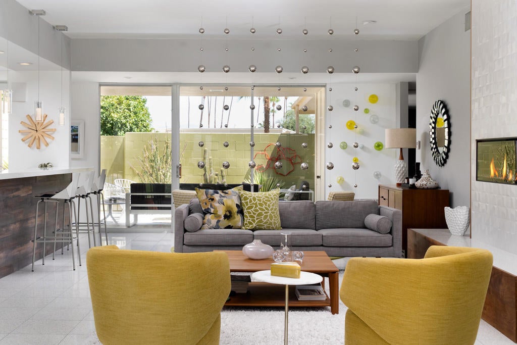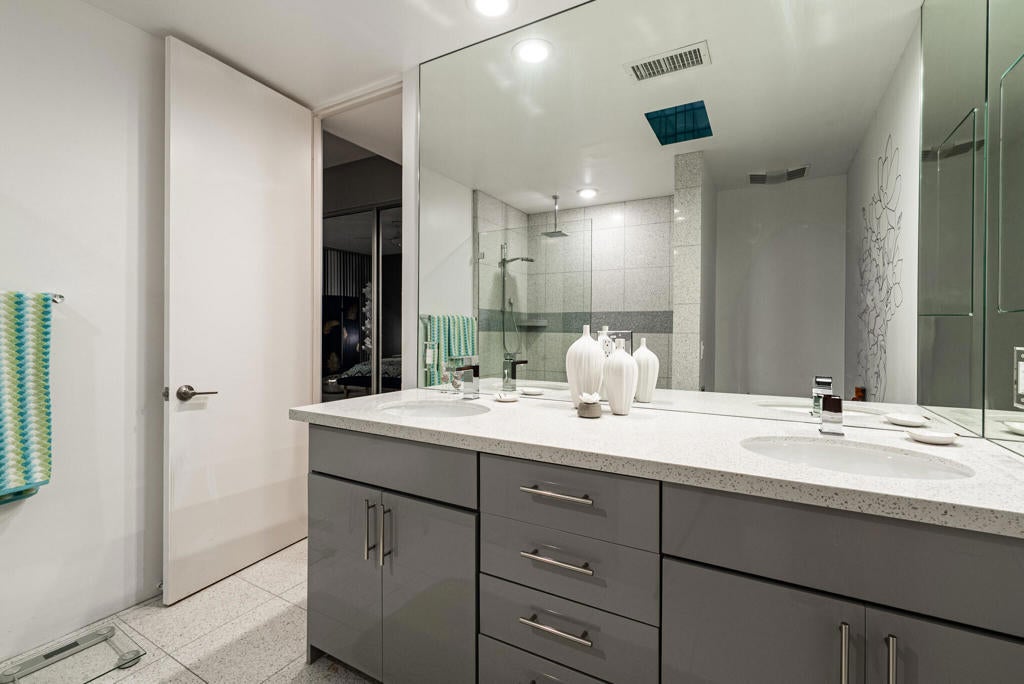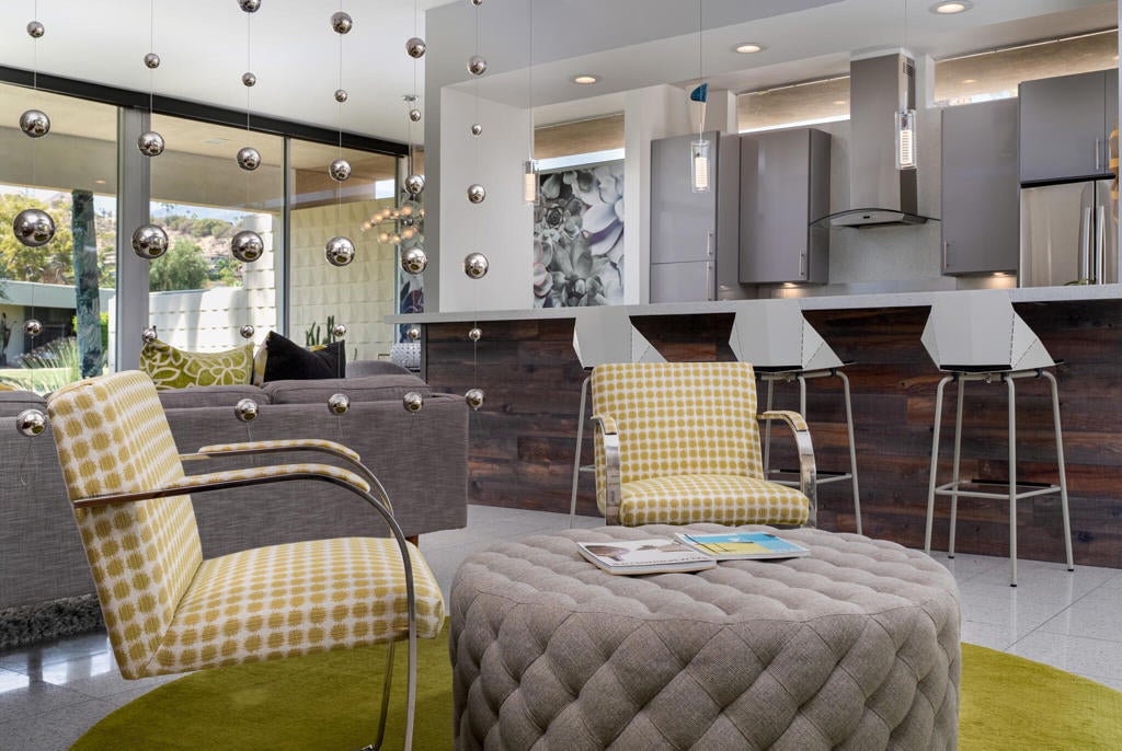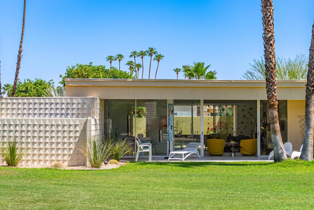 This beautifully remodeled 2bed/2bath home is just waiting for you to call home at the coveted Seven Lakes Country Club. Originally designed by Richard A. Harrison, inside its mod shadow-blocked walls, you'll find a spacious unit updated for today's living. Spread out over the 1,545 sq ft open floor plan, highlighted by light terrazzo tile floors, get ready to entertain in style! The remodeled kitchen is finished with KraftMaid grey cabinetry, sparkling stainless steel appliances, and ample quartz countertops, including a large breakfast bar. Walls of glass sliders open out onto a green leisure terrace with views of the mountains and the iconic Southridge estates. Enclosed for maximum privacy, the northern window wall opens onto a large private courtyard lined with a desertscaped perimeter garden. Both spacious bedrooms offer great closets as well. An assigned two-car garage is available while the tranquil pool is just steps away. The roof has been recently recoated as of July 2025. Past the 24-hour guarded front gate, 'The Gem of the Desert' offers a unique elevated lifestyle with its Ted Robinson-designed 18-hole executive golf course, 15 pools and spas with poolhouses, and the lively William Cody-designed clubhouse with a formal dining room, casual cocktail lounge, and a terrace overlooking the waterfall-fountain. Welcome home!