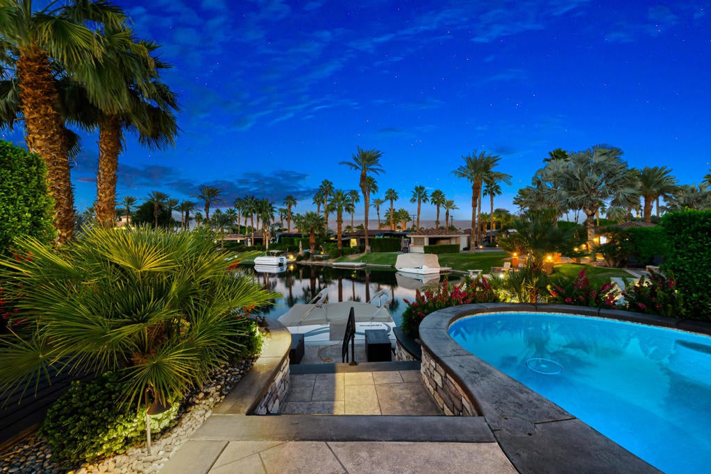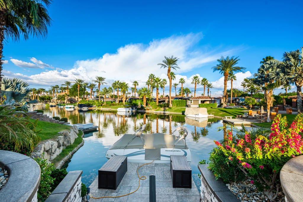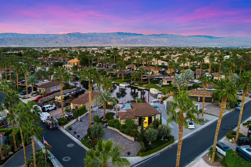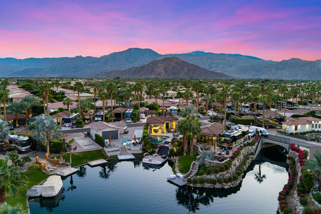 One of Motorcoach Country Club's most exceptional offerings. Lot 320 is an oversized, elevated corner water lot that feels like a double lot--yet with only one set of dues. Its unique positioning provides panoramic mountain views to the east and west, along with beautiful water views, all while offering an extraordinary level of privacy rarely found on a canal-front location.A large circular driveway, separate from the coach parking pad, provides abundant parking and includes the golf cart with your purchase. Beyond the private gated entry, the outdoor living space offers a large fire pit with seating for six, an overhead awning that provides shade and retains warmth, three permanently mounted cantilever umbrellas, a pop-up swivel TV, and an additional fire feature at the coach pad. The pool and elevated spa are exceptionally private and overlook the east canal and mountains. A custom staircase leads to your private dock, where an Electracraft boat--also included--awaits.Inside, bi-folding lanai doors open into the stunning 706 sq. ft. coach house. The chef's kitchen features a massive island with seating for six, under-counter wine fridge, reverse osmosis system, KitchenAid appliances, Wolf range with custom hood, full-size pantry with slide-out shelving, and hidden outlets for a seamless backsplash. The living area includes a linear Avanti fireplace, TV with soundbar, tinted glass, and electric drop screens discreetly built into custom soffits for shade and privacy. Double sliders open to an elevated private patio with mountain views, a drop-screen awning, and thoughtfully designed landscaping that provides privacy without obstructing scenery. The entire property is powered by a premium Control4 smart-home system managing lighting, music, shades, and more.The casita offers two wardrobes, a large built-in 180 bottle wine fridge, and a beautifully finished 3/4 bath with a full tile shower. Custom French doors open directly to the outdoor fire pit area. Additional storage and a full-size stacked washer/dryer are conveniently located inside for your convenience.Motorcoach Country Club is an exclusive, guard-gated Class A luxury motorcoach resort requiring coaches 30'-45'. Owners enjoy world-class amenities including golf, a 5-star clubhouse, fine dining at Top of the Falls, a yacht club, fitness center, three pools, tennis, pickleball, and over two miles of stunning waterways.