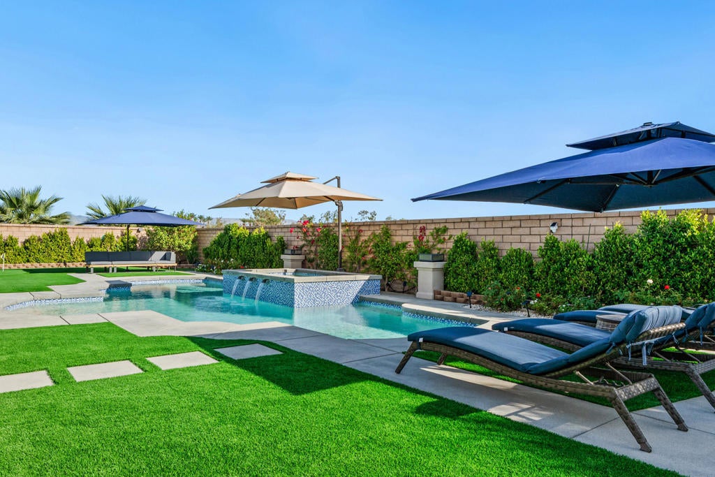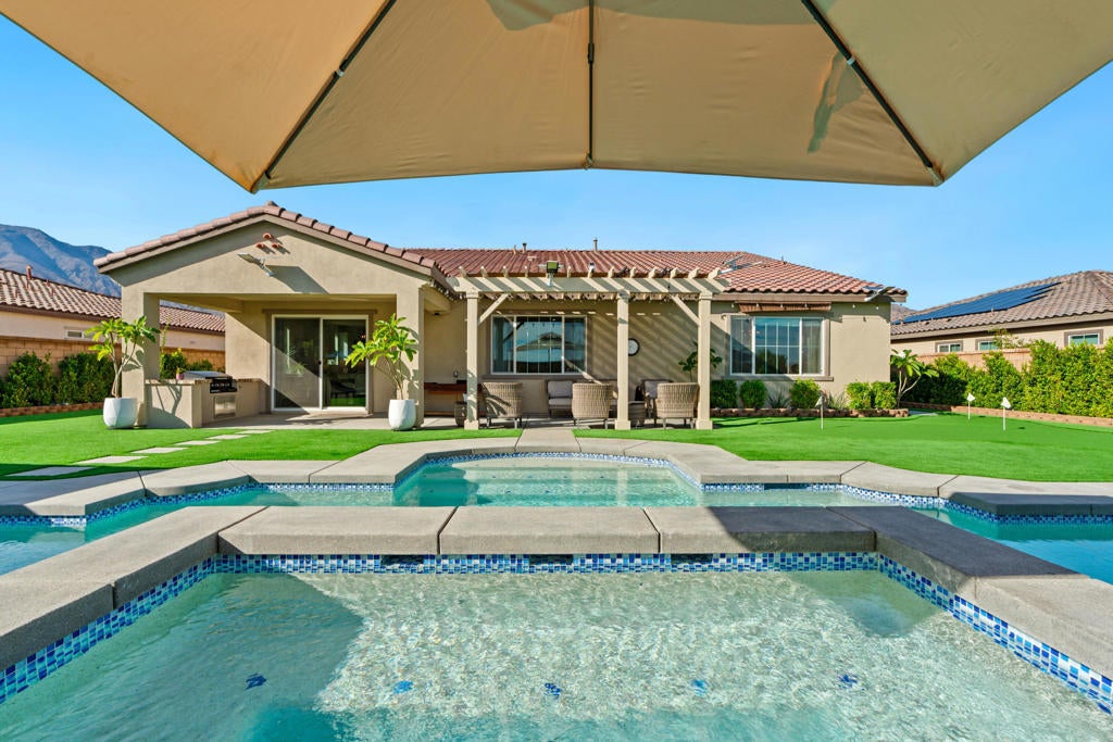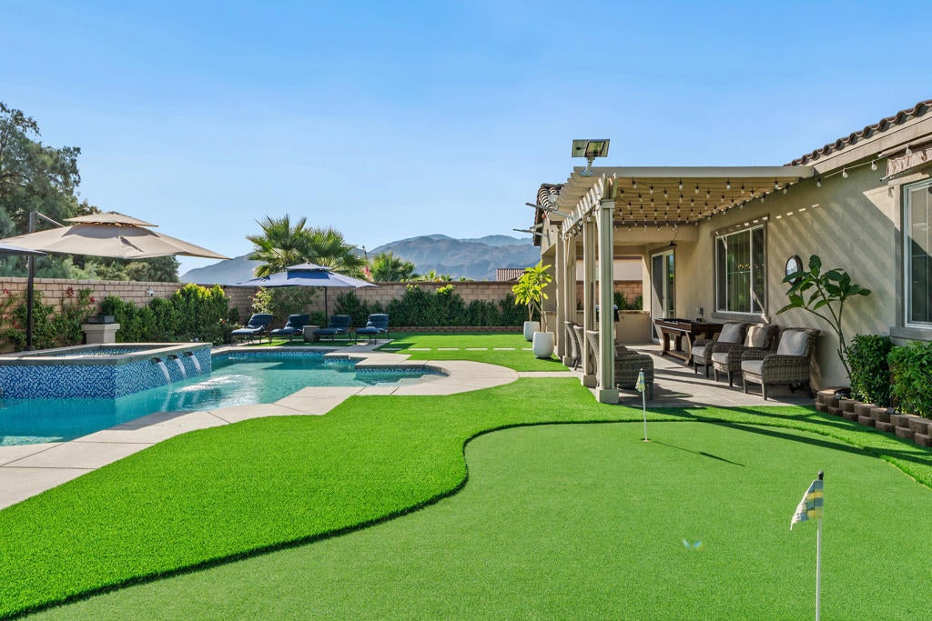 Welcome to 58228 Aragon Way, a light filled La Quinta retreat offering privacy, space, and thoughtful upgrades throughout. Located in the desirable Cantera at Coral Mountain community, this 3-bedroom plus den, 3-bath residence spans approximately. 3,006 sq. ft. on an expansive 11,761 sq. ft. lot with beautiful mountain views from the front, both side yards, and the backyard. Designed for bright year-round ambiance, the home enjoys excellent sun orientation and natural light. Each bedroom offers its own en-suite bath, while the flexible den can serve as an office or formal dining room and includes custom built-in cabinetry. Modern conveniences include owned solar (6.3 kW), three HVAC zones, tankless water heater, soft-close cabinetry, upgraded hardware, dimmer lighting, quartz center-island counters, and built-ins in both the office and family room. The backyard is an entertainer's haven featuring a custom saltwater pool and oversized spa, adjustable LED pool and spa lighting, artificial turf, and a 4-hole putting green. The patio receives early shade in the summer, while the winter sun gently warms the south-facing windows, creating comfortable indoor living across the seasons. Indiana Laurel hedges line three perimeter walls, offering exceptional privacy while preserving open-sky views, with no construction planned behind the property. Additional features include a 3-car garage with built-in workbenches and shelving, four exterior cameras, fruit trees, solar landscape lighting, low maintenance landscaping, and low utilities per seller. A rare opportunity offering generous lot size, meaningful separation from neighbors, and a beautifully upgraded setting ideal for full-time living or a desert escape. Ideally located near renowned golf courses, top-tier tennis venues, and the vibrant dining and lifestyle destinations that define La Quinta living.