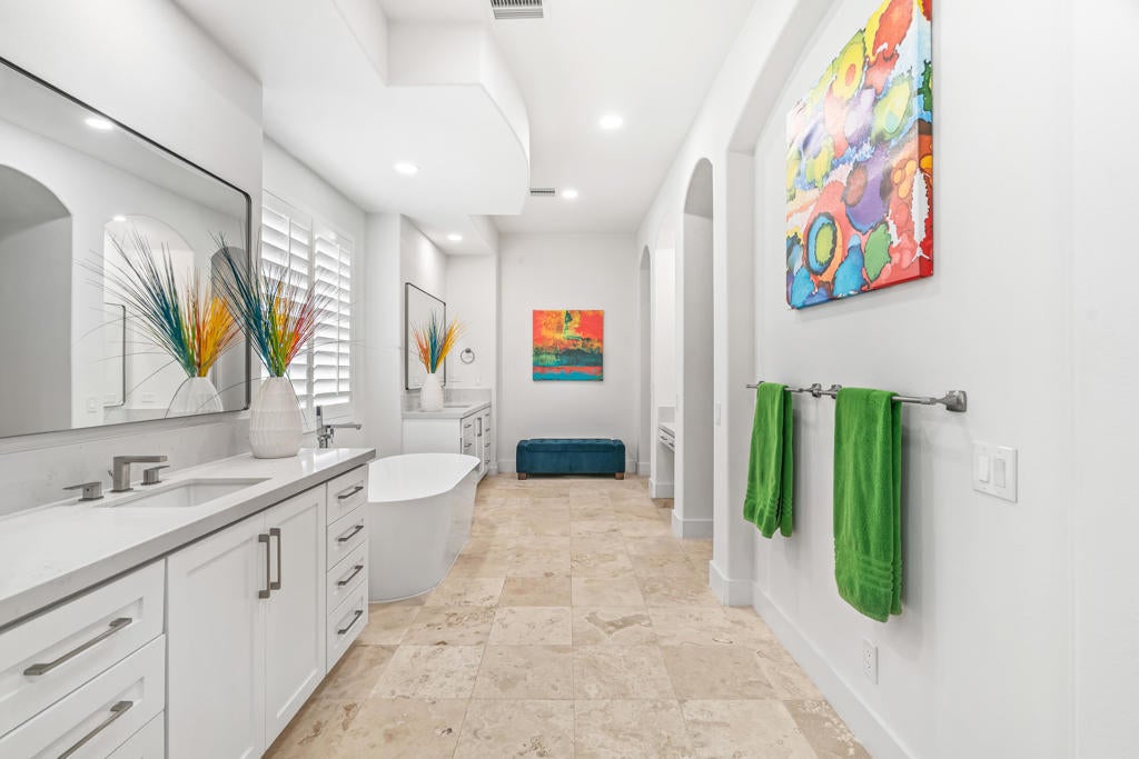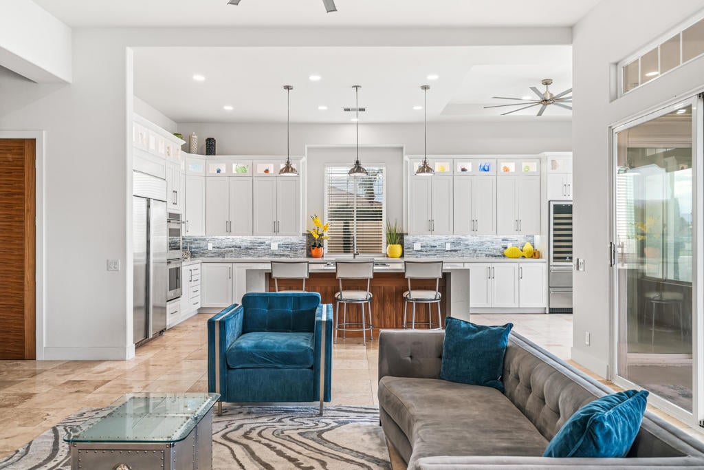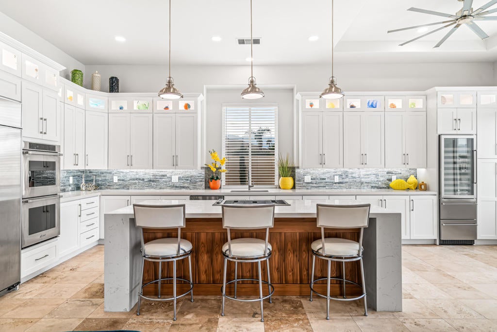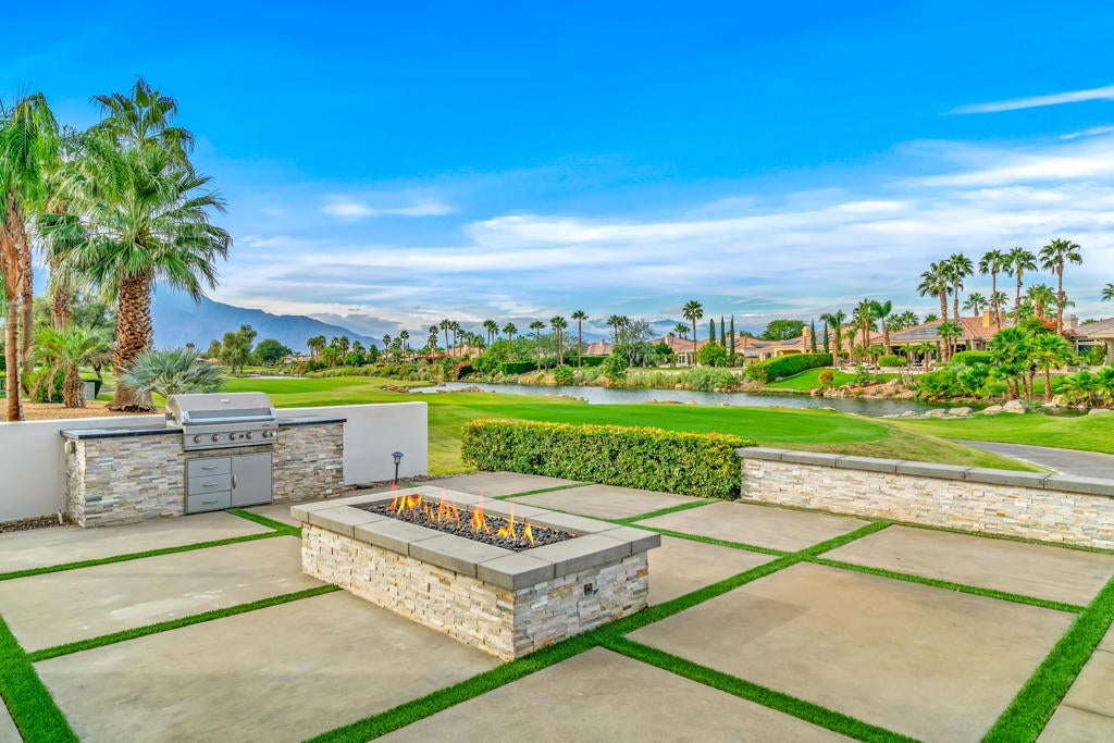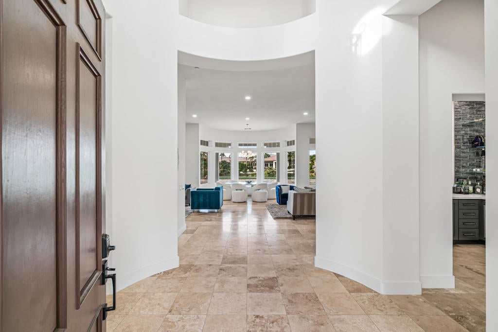 WARM CONTEMPORARY GRANDEUR IN PRESTIGIOUS MIRA VISTA! Experience magnificent Desert living in this 4369 Sq Ft modern residence perfectly poised on a premium elevated Lot, within the guard gated community of Mira Vista, in Rancho Mirage. This opulent FURNISHED home blends plush comfort, refined modernity and exceptional privacy; All overlooking the 11th Fairway with breathtaking MOUNTAIN, WATER and GOLF COURSE VIEWS! A grand sense of arrival begins in a vast rotunda, where natural light pours into expansive living areas that exude true elegance. The formal living and dining spaces transition effortlessly into the inviting family room creating, harmony, warmth and an ideal backdrop for both intimate gatherings and grand scale entertaining Freshly added lighting, ceiling fans, upgraded doors, fixtures and cabinetry, completed by extra wide base boards heighten the home's rich character. The chef's kitchen is a stunning blend of form and function, thoughtfully updated with quartz counter tops, custom backsplash, a lighted display niche and spacious walk in pantry. A large scale refrigerator, GE gas cooktop, additional Dacor appliances and oversized wine refrigerator with cooling drawers, elevate the culinary experience. Nearby, a sophisticated wet bar with glass shelving, bar refrigerator and seating for guests enhance the home's capacity for sumptuous entertaining! The private quarters are equally impressive. The palatial primary suite offers a serene retreat with a cozy fireplace, sitting area with private entry to the backyard. The primary bathroom provides a Zen-style setting with dual sinks, separate vanities, tub and large shower completed by two enormous walk in closets. Nicely appointed are two guest ensuites surrounding and additional media room and an additional bedroom that serves beautifully as a guest room or office. An attached casita with private entry, is a thoughtful haven for guests, extended stays, or multigenerational living. OUTDOORS enjoy a freshly curated backyard, with pool, spa, built in cook station and firepit for evenings under the stars with uninterrupted fairway views! Not to be forgotten is the separate laundry room two car garage and dedicated golf cart garage. Residents in Mira Vista enjoy Tennis, Pickleball and Golf and beautifully manicured grounds. MODERN, ELEGANT AND UNDENIABLY COOL A LIFESTLE REDEFINED!