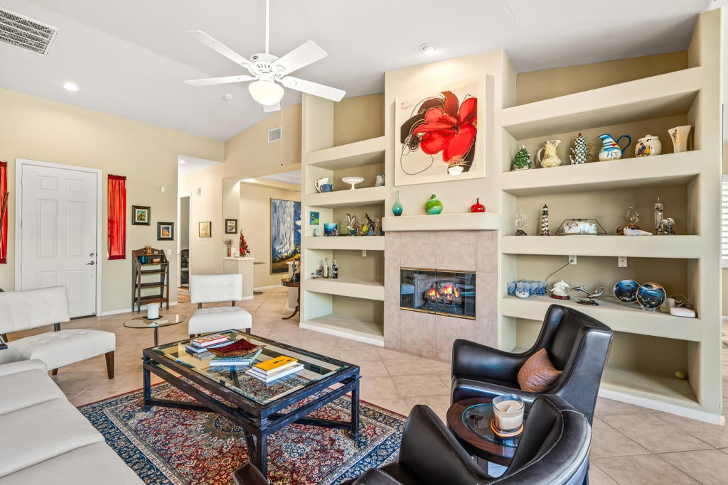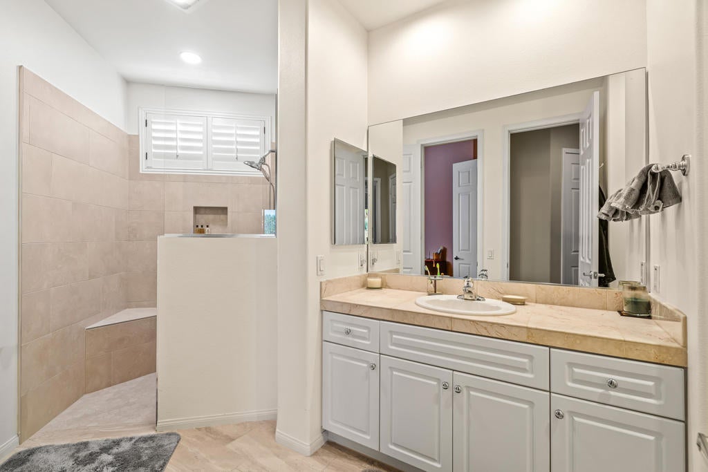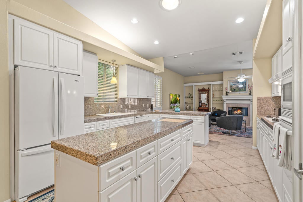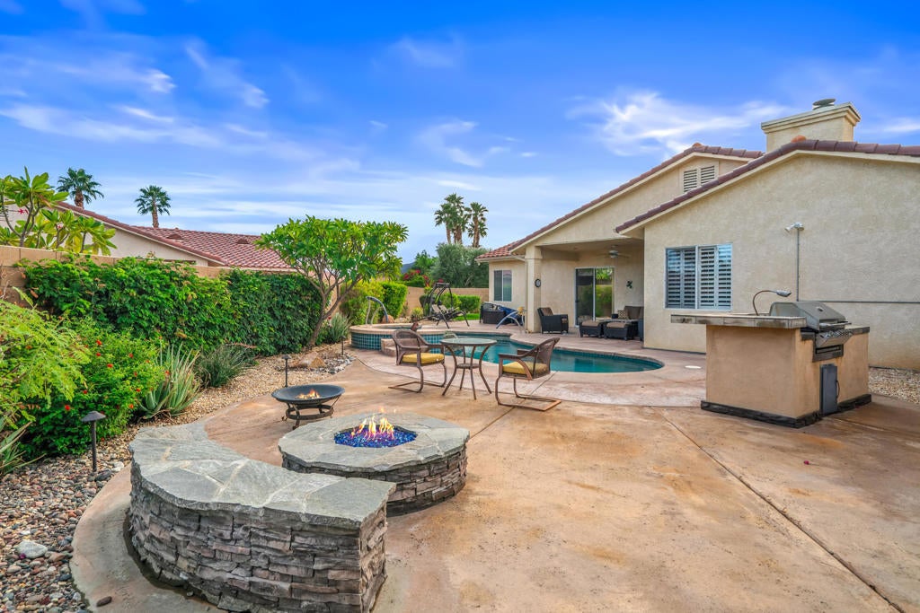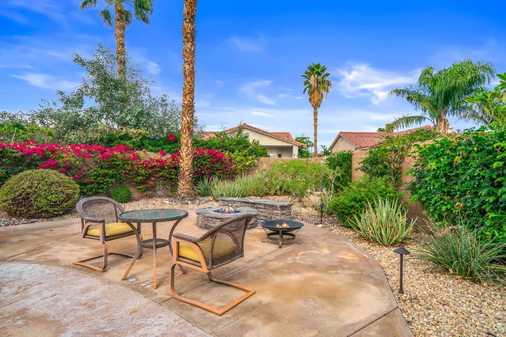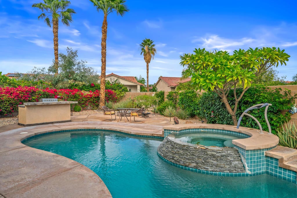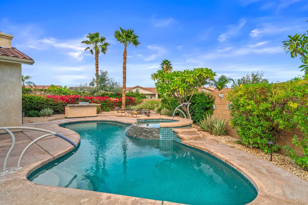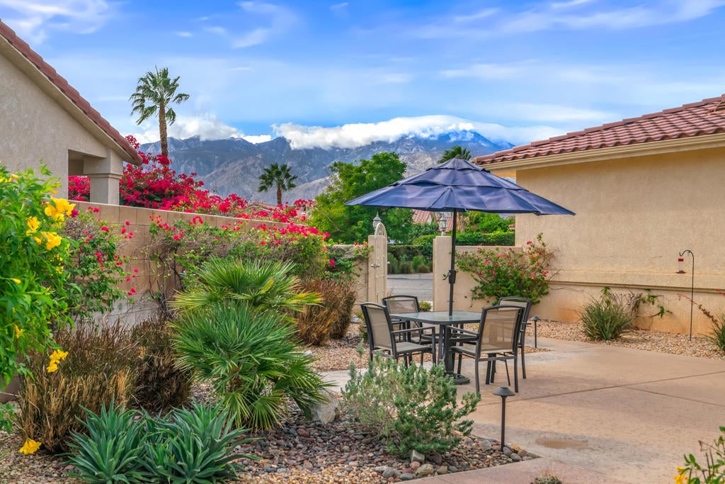Calling all wine enthusiasts looking to buy in one of Cathedral City's best kept secrets! Homes in Landau Manor are rarely available. No HOA! Owned Solar, a 700 bottle climate controlled wine cellar. This property boasts single level living with over 2,500 square feet located on a large lot with a three-car garage at the end of a quiet cul de sac. Enter the courtyard which offers mountain views to your west that wraps around the entire property, perfect for entertaining. The backyard boasts a pebble-tech salt water pool & spa, built-in BBQ, gas fire pit and covered patio. From the front door you enter the open living areas, both living and family rooms offer fireplaces and soaring ceilings. The kitchen has a breakfast bar, large island that opens to the dining area. There are three bedrooms and baths. The guest bath shower has been re-designed and is handicapped accessible. The large primary suite offers an expansive walk-in closet, vanity with double sinks, separate shower and tub and an abundance of storage. Recent upgrades to the property include new insulation in the attic, insulated garage doors & new door openers, WiFi operated pool equipment.
