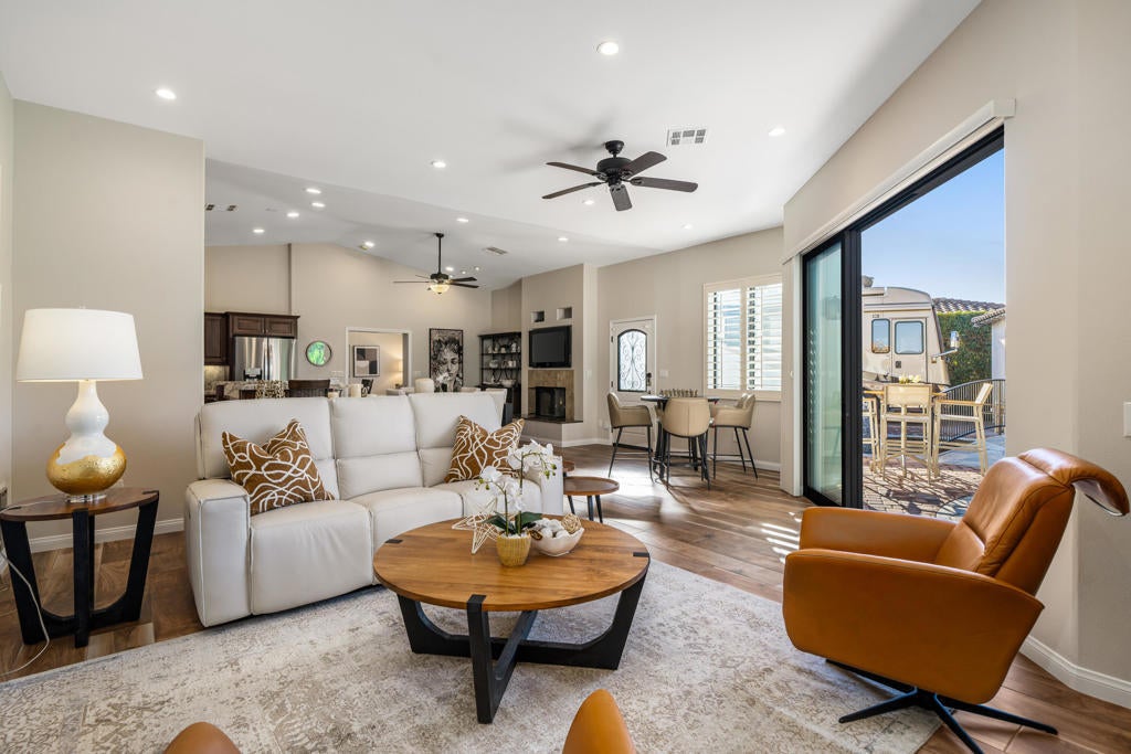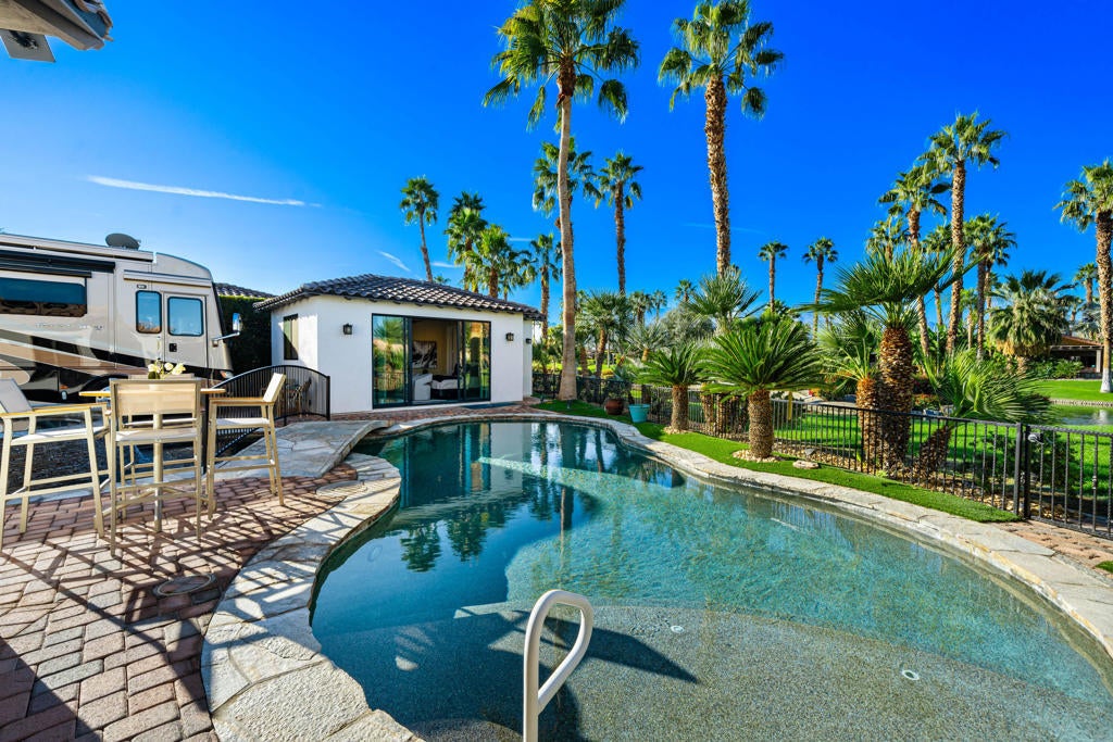 #93 DESERT SHORES RESORTExpanded Villa + Guest Cabana property is located on large, corner lot with greenbelt, Lake and waterfall views.Main Villa Sq Ft: 830Cabana: 373TOTAL LIVING: 1,558Garage: 370TOTAL STRUCTURE: 1,928Expanded Plan 30 floor plan with expansive living space with Living Room, Country Kitchen with Dining Space + a, spacious Retreat with en suite and walk-in closet + a detached Guest Cabana with kitchenette and batrhroom.Private corner location finished with pavestone decking and enclosed with wrought-iron doggie fence.The kitchen is equipped with maple cabinets and stainless-steel appliances including a refrigerator, oven range, dw microwave, Dining area has cozy fireplace for cool mornings and evenings.Association includes clubhouse, tennis,, pickleball fitness center, community pool & spa, social activities, 24-hour, guard gated with high-tech perimeter security, trailer storage area, doggie park, front yard landscape maintenance & brand new super-speed FIOS internet