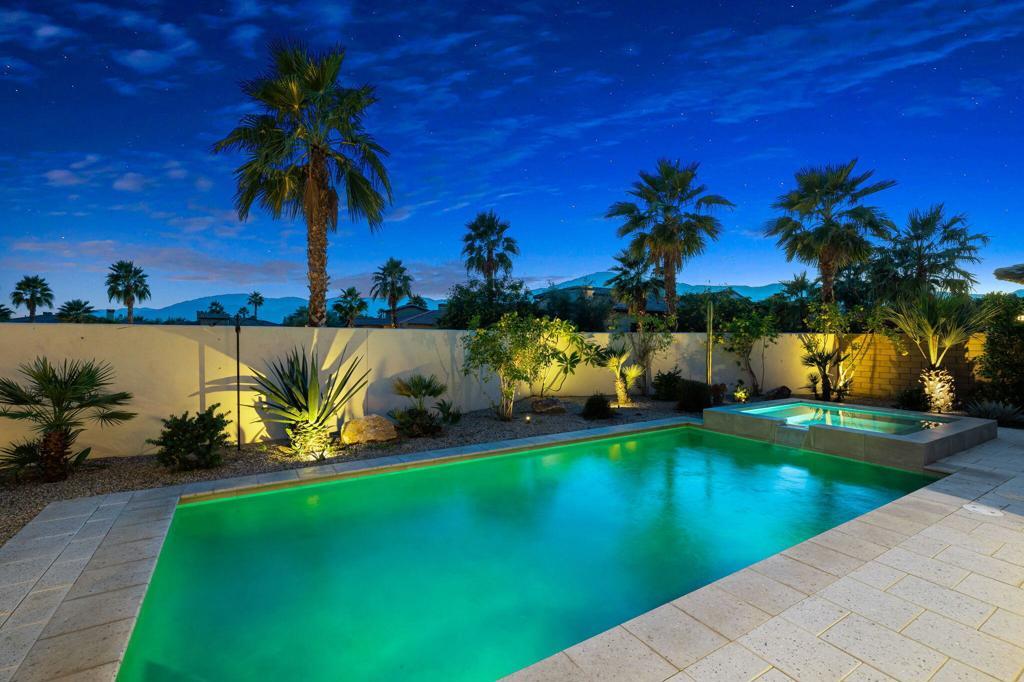 This luxurious Mediterranean residence showcases breathtaking, unobstructed southern views of the Santa Rosa Mountains from one of Monterra's most desirable oversized lots. Ideally positioned at the end of a quiet cul-de-sac within the Greg Norman gate at PGA West, this 2017-built home features the highly sought-after Residence 1 floor plan, offering 3,075 sq. ft. and four en-suite bedrooms. Once Inside, you're welcomed by a meticulously maintained interior enhanced by high ceilings, custom flooring, recessed lighting, designer window treatments, and abundant natural light. The gourmet kitchen serves as the focal point of the home, appointed with premium stainless-steel appliances, a 6-burner gas cooktop, and an extended island with a breakfast bar all overlooking the spacious great room with a decorative fireplace and retractable glass doors that create a flawless transition to the outdoor living area. Designed for effortless indoor-outdoor living, the private outdoor space features an inviting pool and spa, an expansive loggia, cool-deck pavers, surround sound, a TV, built-in BBQ, two putting greens and a fireplace creating the perfect ambiance for relaxation and entertaining. Additional highlights include an air-conditioned 2-car plus golf-cart garage with epoxy flooring and custom built-ins. Perfectly situated for resort-style living, this exceptional PGA West retreat is just a short golf cart ride from six championship golf courses, three clubhouses, and the full array of premier PGA West amenities.