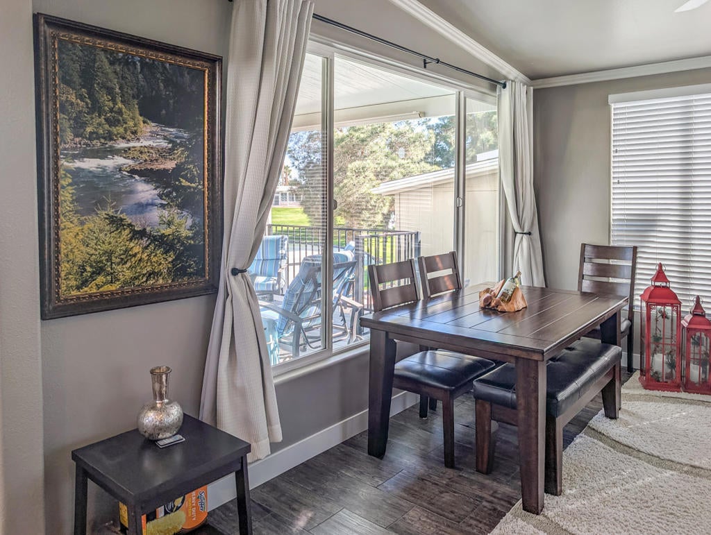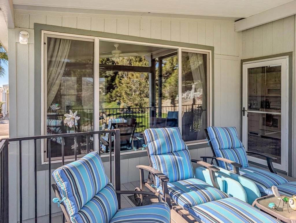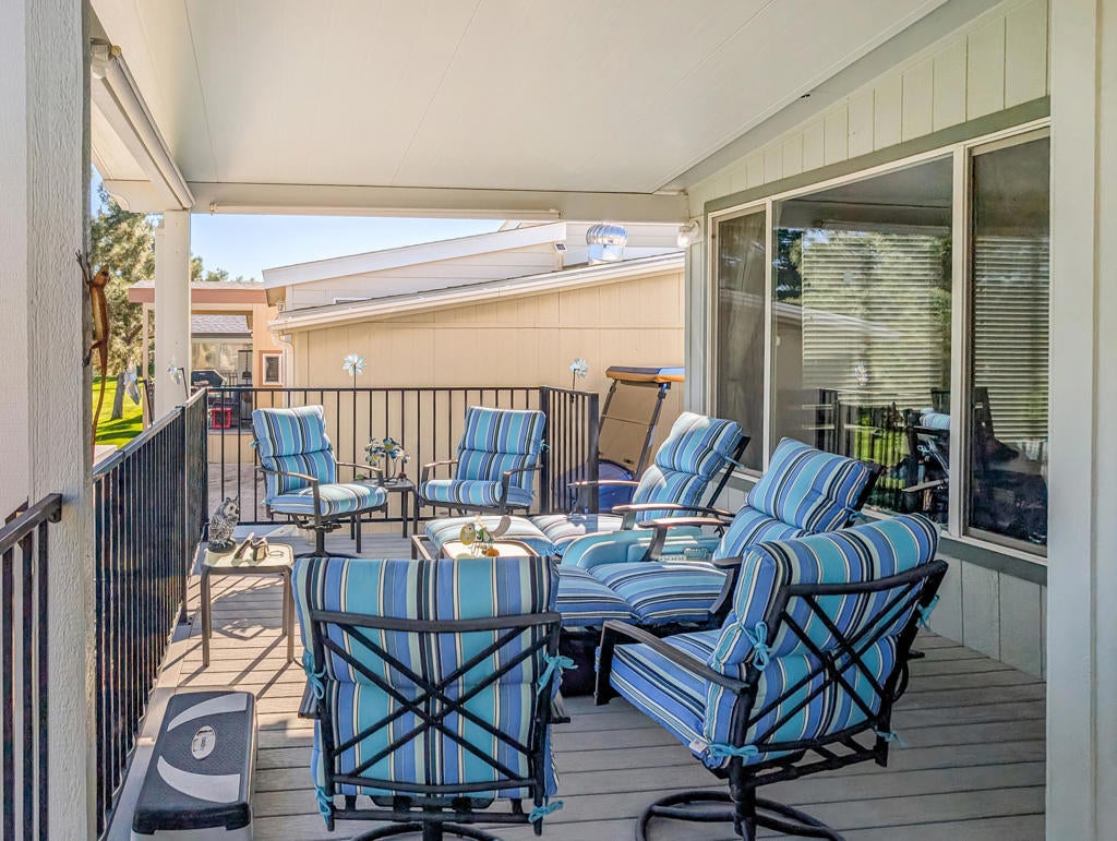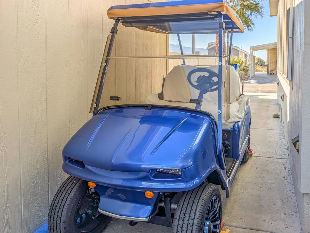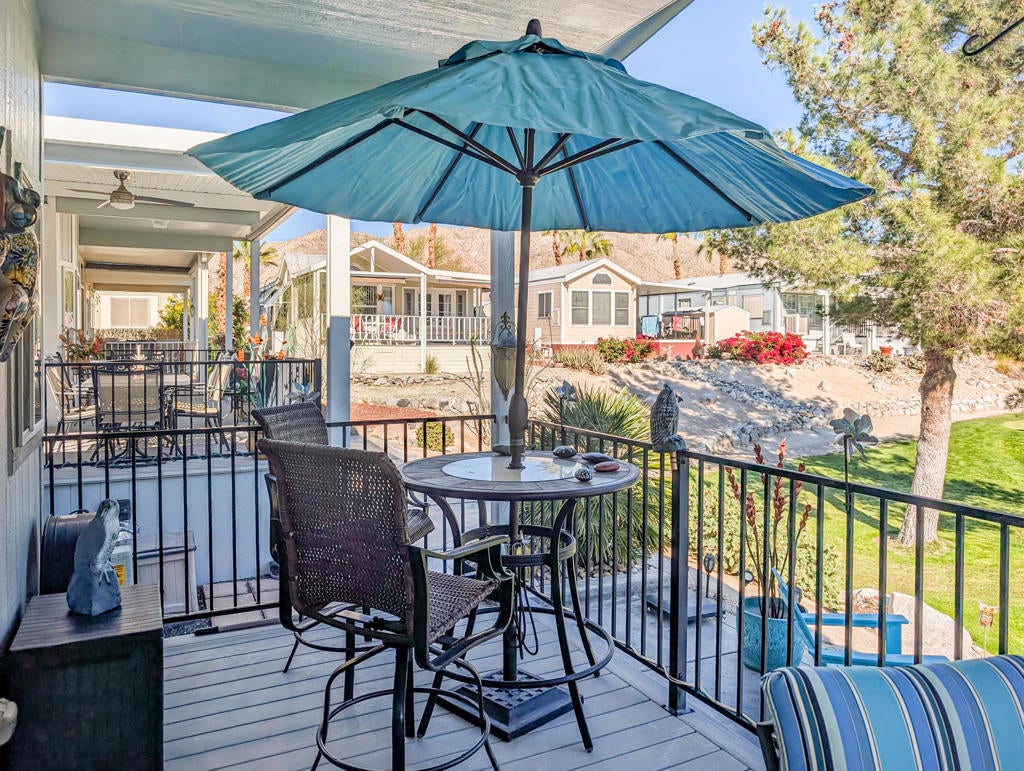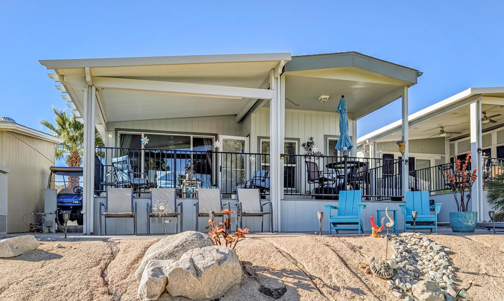 This property offers impressive views both indoors and outdoors and is situated adjacent to the 5th and 6th holes of the golf course. Well maintained, this approximately 750 sq. ft. one-bedroom (king-size), one-bathroom 2016 Cavco Park Model reflects careful ownership. Features include modern appliances such as a robotic vacuum system and two air purifiers, an open floor plan, Luxury Vinyl Plank flooring throughout, mature irrigated landscaping, and a well-constructed California room overlooking the surrounding area. The outdoor space includes two-tiered decking designed for entertaining or relaxation. Inside, the high-volume ceilings and 9-foot doors in the bathroom and bedroom create a spacious atmosphere. Caliente Springs is a 55+ luxury resort community offering amenities including a mineral-fed hot spring pool and spas, a 9-hole golf course, water ball, water aerobics classes, yoga, 8-pickleball courts, tennis courts, and more within an active environment. Please note, the lot is not owned; space rent is $950. Golf Cart for sale not included in price.