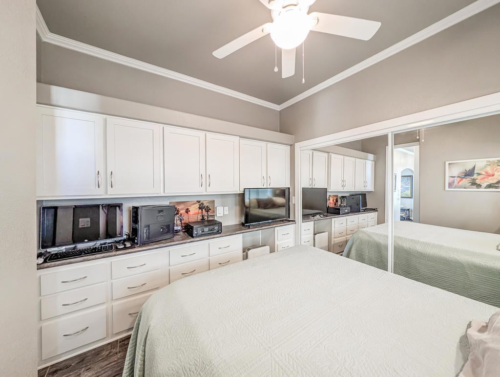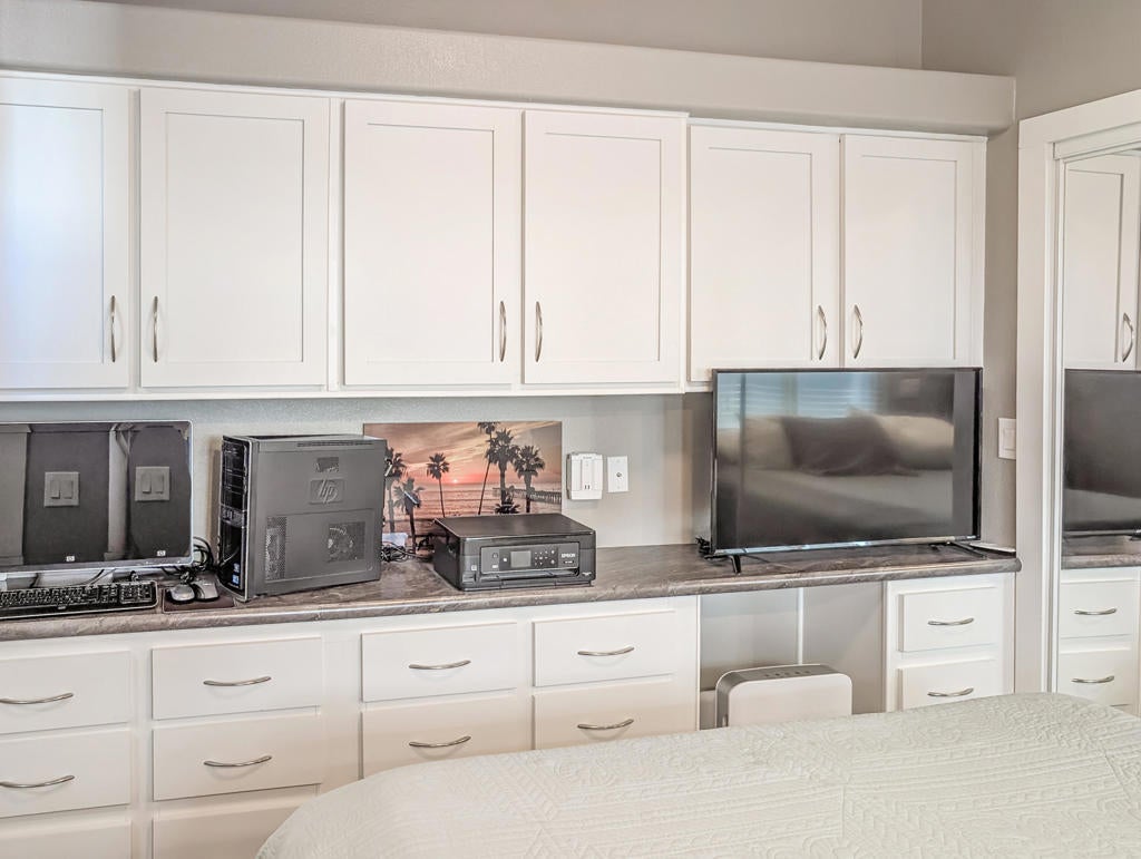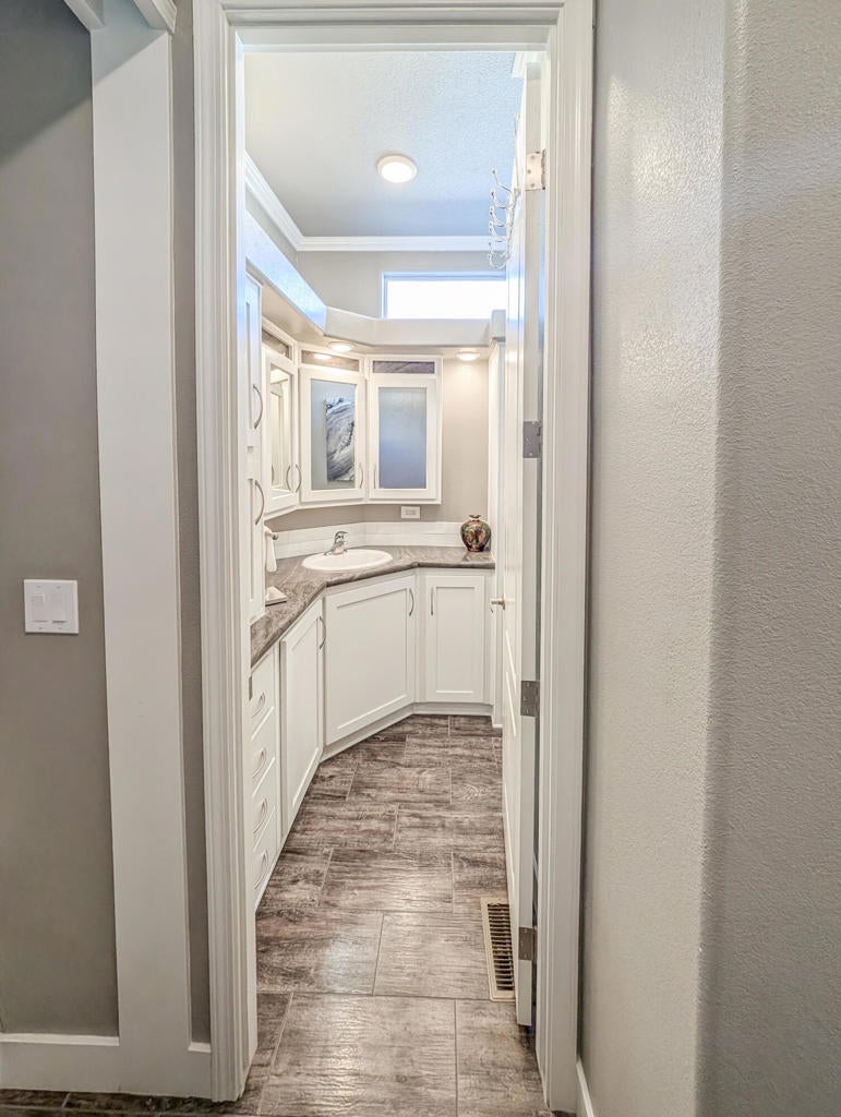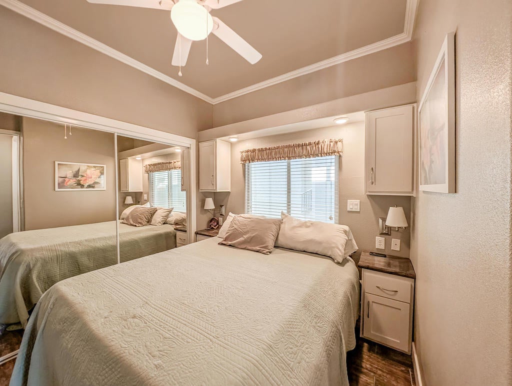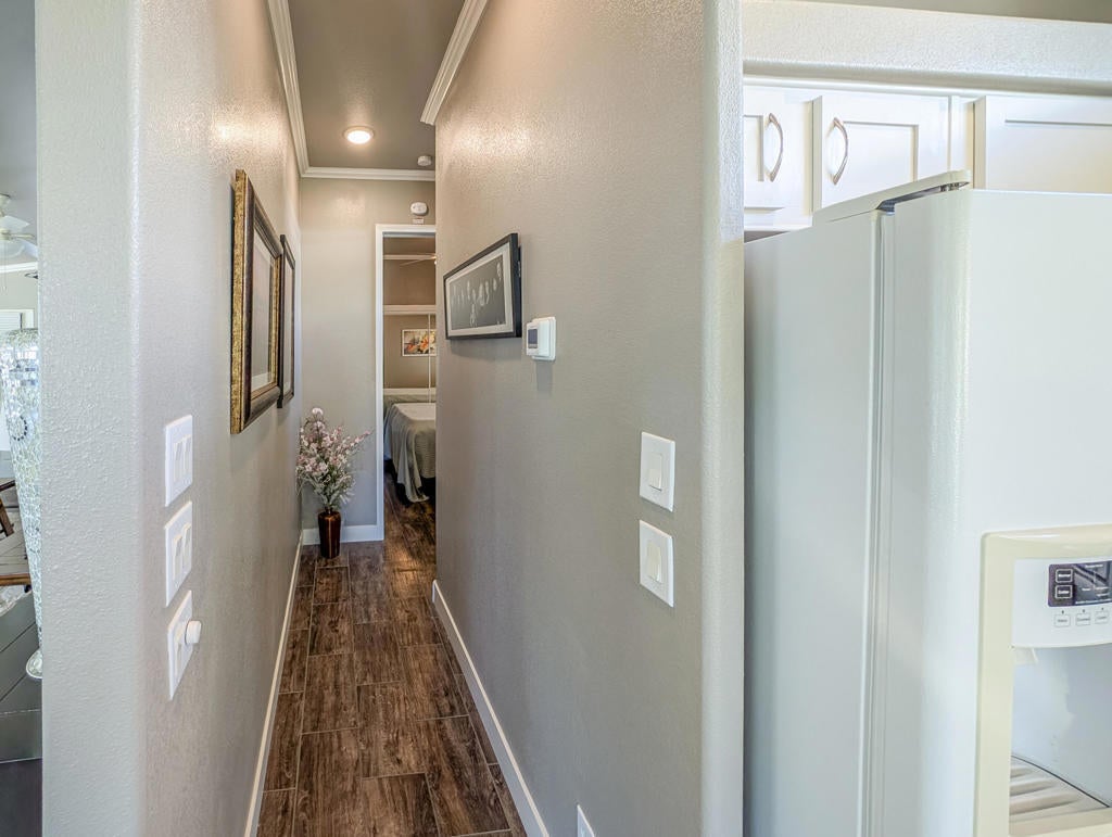 This property offers impressive views both indoors and outdoors and is situated adjacent to the 5th and 6th holes of the golf course. Well maintained, this approximately 750 sq. ft. one-bedroom (king-size), one-bathroom 2016 Cavco Park Model reflects careful ownership. Features include modern appliances such as a robotic vacuum system and two air purifiers, an open floor plan, Luxury Vinyl Plank flooring throughout, mature irrigated landscaping, and a well-constructed California room overlooking the surrounding area. The outdoor space includes two-tiered decking designed for entertaining or relaxation. Inside, the high-volume ceilings and 9-foot doors in the bathroom and bedroom create a spacious atmosphere. Caliente Springs is a 55+ luxury resort community offering amenities including a mineral-fed hot spring pool and spas, a 9-hole golf course, water ball, water aerobics classes, yoga, 8-pickleball courts, tennis courts, and more within an active environment. Please note, the lot is not owned; space rent is $950. Golf Cart for sale not included in price.