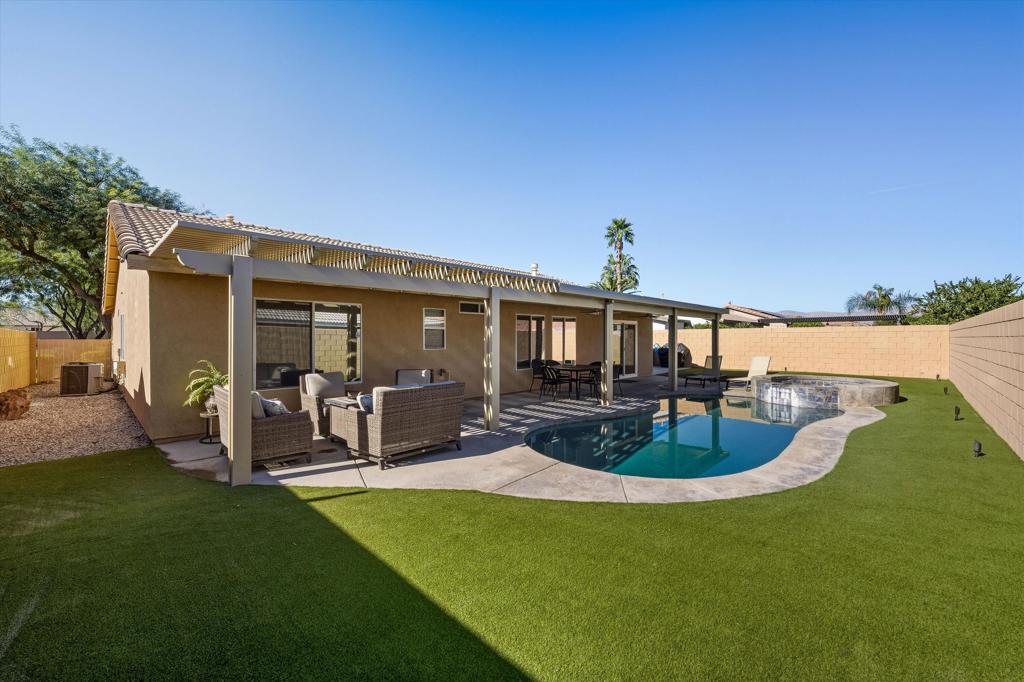 Welcome to this renovated desert sanctuary nestled in North Indio, with no HOA fees, perfectly positioned just moments away from world renowned events. This exquisitely renovated 4 bedroom, 3 bathroom residence comes fully furnished and presents an exceptional dual opportunity. Whether you envision a tranquil personal retreat for your own enjoyment or a flexible rental investment (short term, seasonal or long term). The interiors greet you with a meticulously chosen modern upgrades, including resilient luxury vinyl flooring that combines aesthetic appeal with robust durability and gleaming quartz countertops. The expansive backyard features a pristine Pebble-Tec pool and spa, a putting green and a multitude of inviting seating arrangements. The grounds boast low-maintenance artificial turf alongside lush green spaces perfect for lounging and ample room for an RV with electrical hookup already in place for extra guests. A generously sized covered patio provides essential shade and comfort during the desert's warm days, ensuring you and your guest can relax in style.