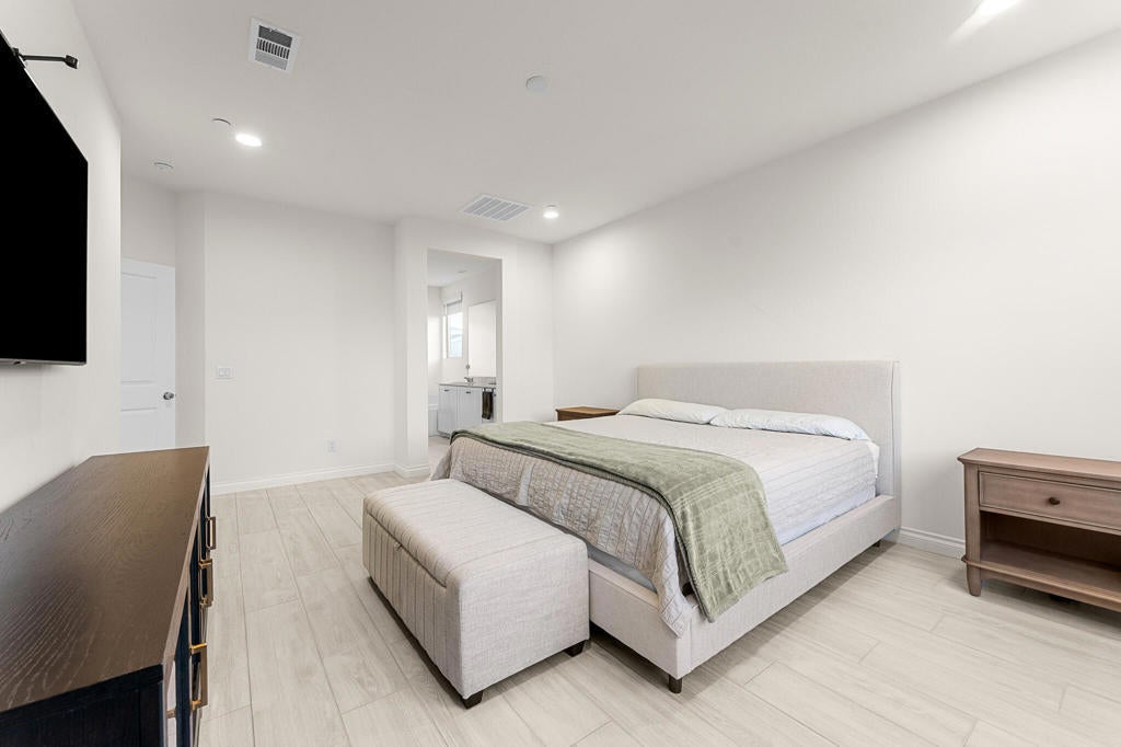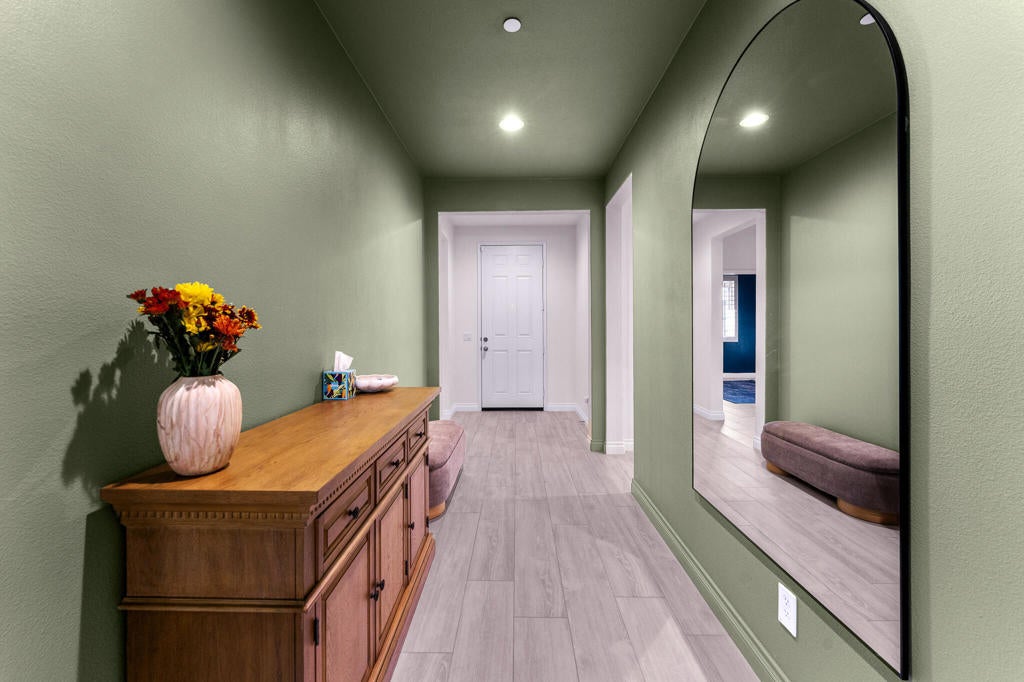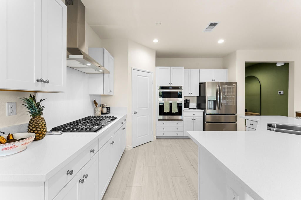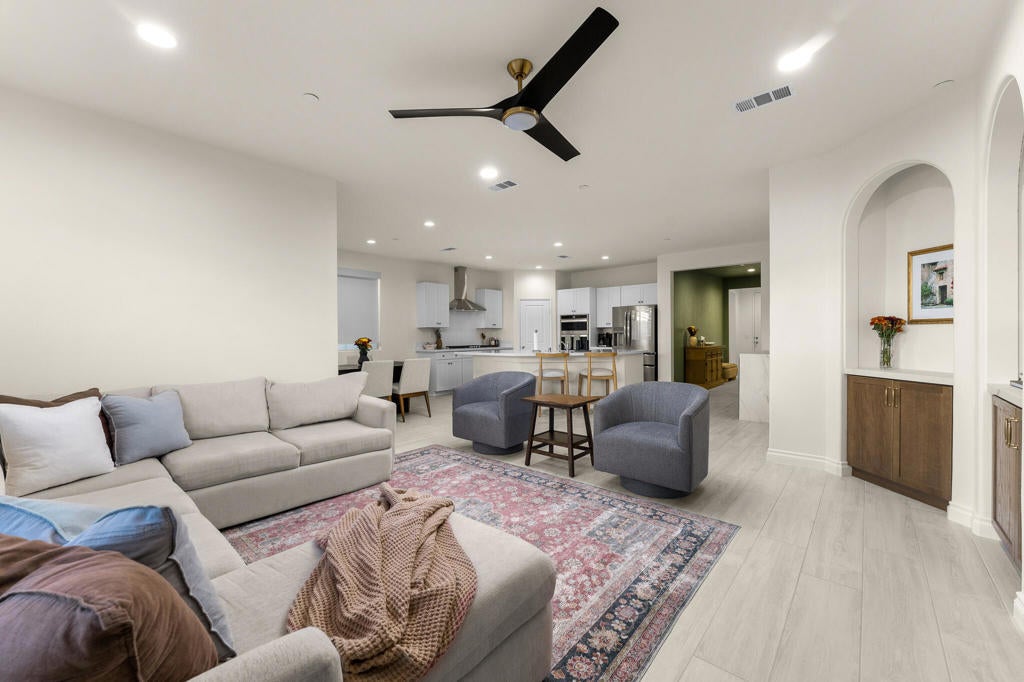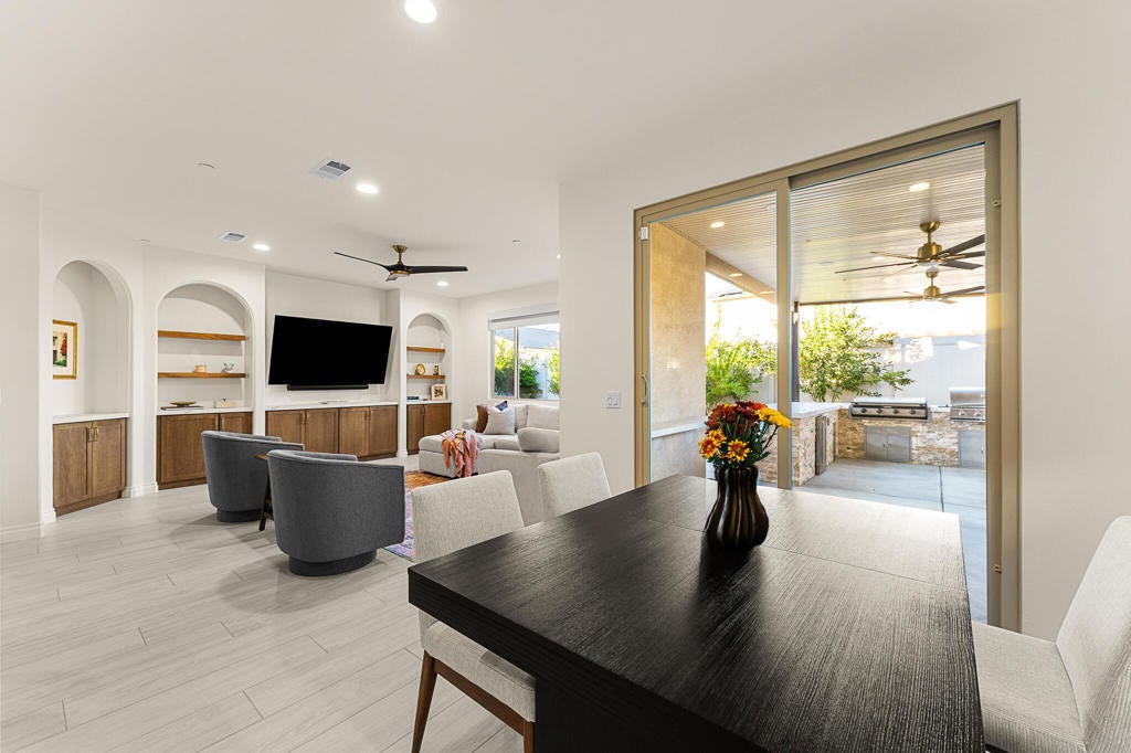 Experience comfortable living and thoughtful upgrades throughout this 4-bedroom, 2-bathroom home with 1,960 sq ft of interior space. From the moment you walk in, the custom walnut built-ins immediately make a statement offering beautiful storage, warm textures, and LED-lit arches that elevate the entire living room. Leased Solar system to help you save on energy. Entertain with ease thanks to the built-in bar with mini fridge and optional shelving space. The chef's kitchen is truly the heart of the home and one of the features that sold the current owners designed for everyday living and weekend hosting.You'll also appreciate the spacious walk-in laundry room, a generous primary bedroom, and well-designed secondary bedrooms that offer flexibility for family, guests, or workspace needs.The outdoor living is just as impressive:Front patio with fan perfect for morning coffeeBack patio with fan + LED lightingFull outdoor kitchen: grill, griddle, mini fridge, and sink. Outdoor entertainment area with TV & speaker connections. Landscape lighting throughout the front and back. Plenty of space for a future poolThis property blends style, comfort, and functionality inside and out. A must-see for buyers looking for a home that's truly move-in ready with room to grow.