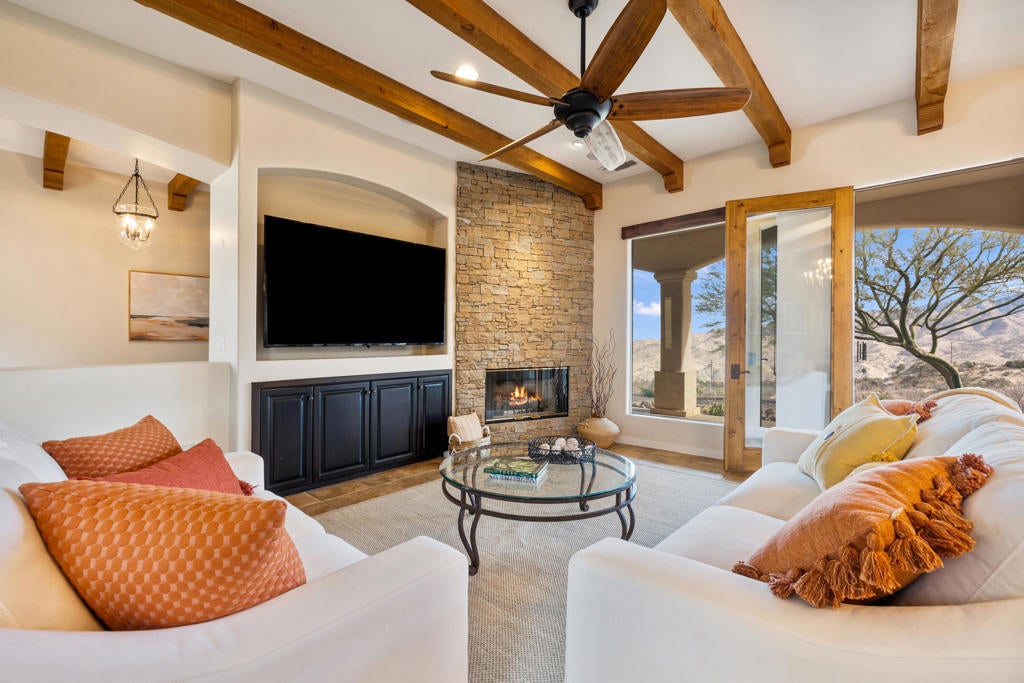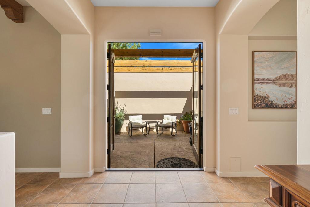 Serene Santa Barbara-style view home on 2.52 acres in Pinyon Crest, just 15 minutes above El Paseo. This 3 bed,3 bath, approx. 2337 sq ft. home(2004) sits among landscaped gardens and flowering trees at 4,000 ft. elevation, often 10-15 degrees cooler than the Valley floor, in a private mountain community that adjoins National Forest land with sweeping views of the Valley floor and City lights.Inside, 8-foot wood French doors connect the main living areas and bedrooms to a deep covered veranda that runs the length of the home. Wood-beamed ceilings and a split bedroom layout place the primary on one side and two guest bedrooms on the other for privacy.The primary retreat has two walk-in closets, a freestanding soaking tub with views of the garden and Valley lights, and direct access to a private sitting area on the veranda. The renovated kitchen includes a work island with views, upgraded appliances, custom cabinetry, and opens to the breakfast, dining and living areas.Practical upgrades include three zones of heating and cooling, a backup generator, and EV charging station in the 3-car garage. Outdoors, gardens, multiple seating areas, and paver walkways lead to mature trees and flowering plants where you can enjoy the mountain air and stary skies. If you are seeking a turnkey mountain getaway above the desert floor yet close to Palm Desert amenities, this Pinyon Crest home is a must see.