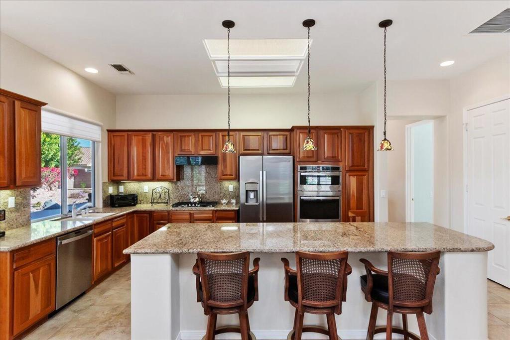 Beautifully appointed **MONACO ESTATE MODEL** located on an oversized corner lot in Sun City Palm Desert, just a short distance from the Sunset View Clubhouse. A private gated front courtyard leads to elegant double leaded-glass entry doors. Inside, the foyer and great room impress with 12 ft. ceilings, recessed lighting, and a double slider that opens to the north-facing backyard featuring multiple seating areas, a built-in BBQ, gorgeous desert landscaping, and peek-a-boo mountain views.The beautifully updated kitchen offers granite countertops, new GE Profile stainless steel appliances, a large island with breakfast bar, pendant and under-cabinet lighting, and a skylight that fills the space with natural light. The adjoining family room includes a custom built-in media center, plantation shutters and recessed lighting. Tile flooring is throughout the main living areas, with carpeting in the bedrooms.The spacious primary suite features a bay-window slider opening to the backyard, a large walk-in closet with custom storage, dual-sink vanity, seated makeup vanity, shower/spa tub, and bidet. The extended first guest suite includes plantation shutters and an ensuite bath with a stall shower. A second guest suite also offers shutters and an ensuite bath with a shower/tub combination.Additional features include: Backyard has slab & 220 in place for a spa, Home Central Vacuum, Dual A/C units with electronic air filtration, a recirculating hot water pump, and an extended laundry room with abundant cabinetry and a utility sink. The extended 2-car plus golf cart garage provides extensive cabinetry, overhead hanging storage, and its own dedicated A/C.
