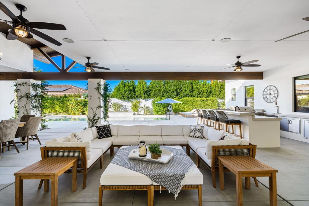 Discover this exceptional Tuscan-inspired enclave nestled within the heart of Rancho Mirage. An elegant combination of dark timber beams, natural stone, and smooth stucco welcomes you into a world of sophistication. Beyond the inner courtyard, enter through reeded glass doors into a grand open-concept design featuring 15-foot cathedral ceilings, modern fireplace, and abundant natural light. Light oak floors, rich wood beams, and white shiplap create a beautifully curated, crisp aesthetic that feels both elegant and cozy. The living room flows seamlessly into the chef's kitchen, which boasts high-end appliances, a large island with seating for six, a designated dining area, and a fully-equipped butler's pantry- perfect for entertaining. A highly desirable feature of this 6-bedroom residence is an impressive 4-bedroom attached casita complete with its own full-size kitchen, living room, and laundry. Step out into your private resort! The expansive 1,500 sq ft covered patio is an entertainer's dream, complete with an outdoor kitchen with BBQ, kegerator, and fridge. True to resort-style living is a modern 44-foot-long pool with waterfalls, lounging areas, and a large fire pit perfect for evening conversations and roasting marshmallows! For ultimate convenience and sustainability, this home is equipped with smart-operated features, key amenities include integrated surround sound, ceiling-mounted Wi-Fi network, Tesla Powerwall system paired with 25 Panasonic solar panels, whole-home soft water filtration, and security cameras throughout.