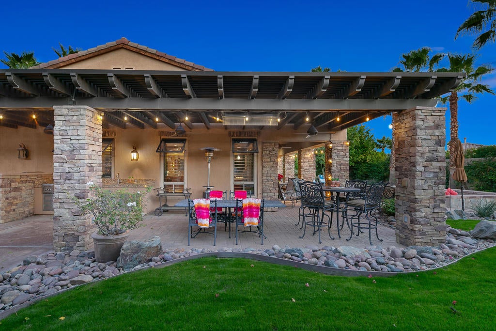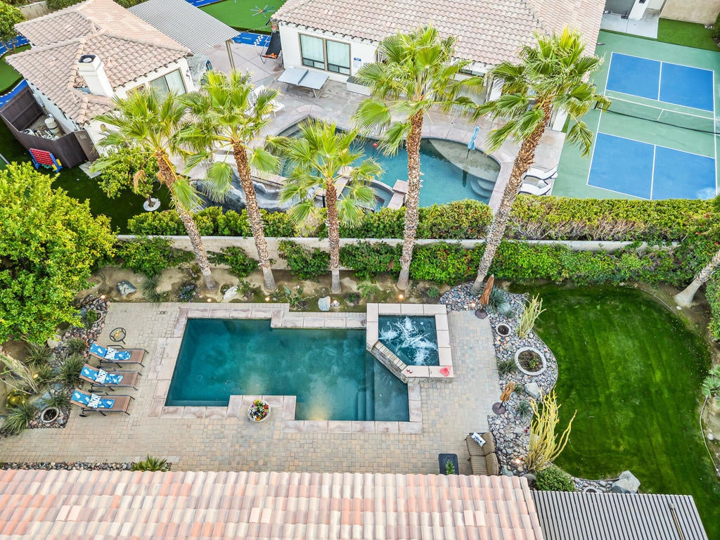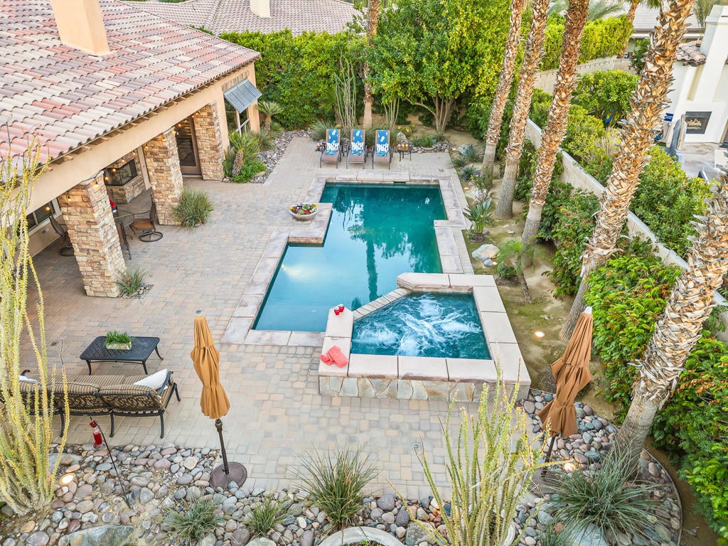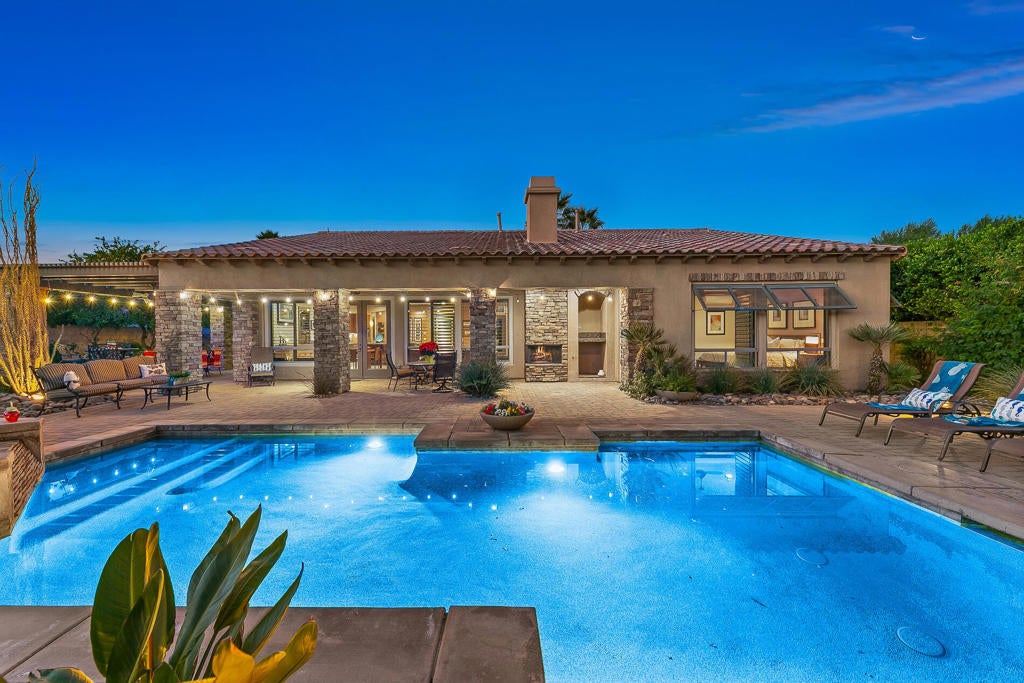 There's something special about a home that instantly feels like a destination--and this Tuscan-inspired residence in the highly coveted, short-term-rental-approved Montage Santa Rosa is exactly that. Set on an oversized lot with a south-facing backyard, the home is perfectly positioned for all-day sun, relaxed pool days, and unforgettable desert evenings.Step inside and you're welcomed by a great room designed for connection and entertaining, anchored by a custom stone fireplace, granite wet bar, and seamless indoor-outdoor flow to the backyard. The chef's kitchen is made for gathering, featuring two oversized granite islands, stainless steel appliances, custom lighting, a glass-door pantry, and an easy transition to the dining area and outdoor living spaces.What truly sets this home apart is its flexibility. A media room near the entry offers ideal space for additional sleeping or entertainment, while three private bedroom suites plus a den provide the opportunity to easily adapt the layout into a five-bedroom configuration to maximize rental potential. The primary suite is a private retreat with custom built-ins, a walk-in closet, and direct access to the pool and spa--perfect for slow mornings and peaceful nights.The outdoor space is where this property truly shines. A wraparound loggia, outdoor kitchen, Alluma-wood covered patio, and thoughtfully placed pavers create a backyard that feels like a private resort. The pool and spa are surrounded by multiple lounging and entertaining areas, while the generous side yard offers room for future enhancements, including the potential for a pickleball court. A tandem garage adds even more versatility with extra storage or future conversion possibilities.Designer details like crown molding and custom paint give the home warmth and character, while still leaving room to elevate value through thoughtful upgrades.For buyers and investors seeking STR approval, strong demand, lifestyle appeal, and meaningful upside, Montage Santa Rosa remains unmatched. Opportunities with this combination of location, flexibility, and income potential are increasingly rare--making this one truly stand out.