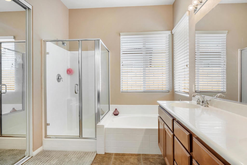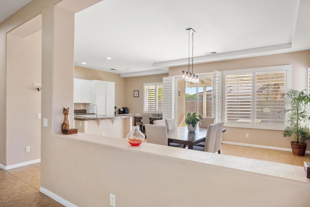 Welcome to this inviting 4-bedroom home with a den (optional 5th bedroom) located behind the gates of Esplanade. Inside, the formal living and dining areas flow into a spacious family room with a cozy fireplace. The kitchen offers granite countertops, a skylight, an island with bar seating, and a breakfast nook with a built-in desk.The primary bedroom includes sliding doors to the backyard, an oversized walk-in closet, and an ensuite with dual vanities, a soaking tub, and a separate shower. Two bedrooms share a guest bath with dual sinks, while the fourth bedroom enjoys its own private bathroom.Additional features include a large laundry room with storage and a sink, a two-car garage, and hallway skylights that bring in wonderful natural light. Close to schools, parks, dining, and shopping, and located in the Imperial Irrigation District for lower electricity costs. Don't miss this fantastic Esplanade home!