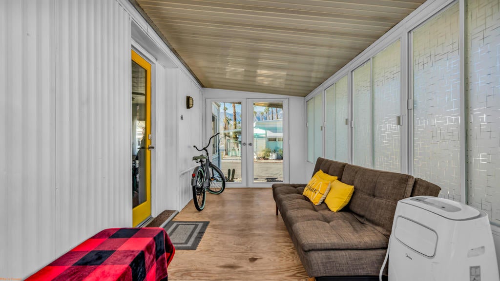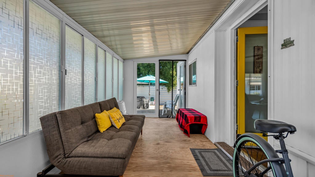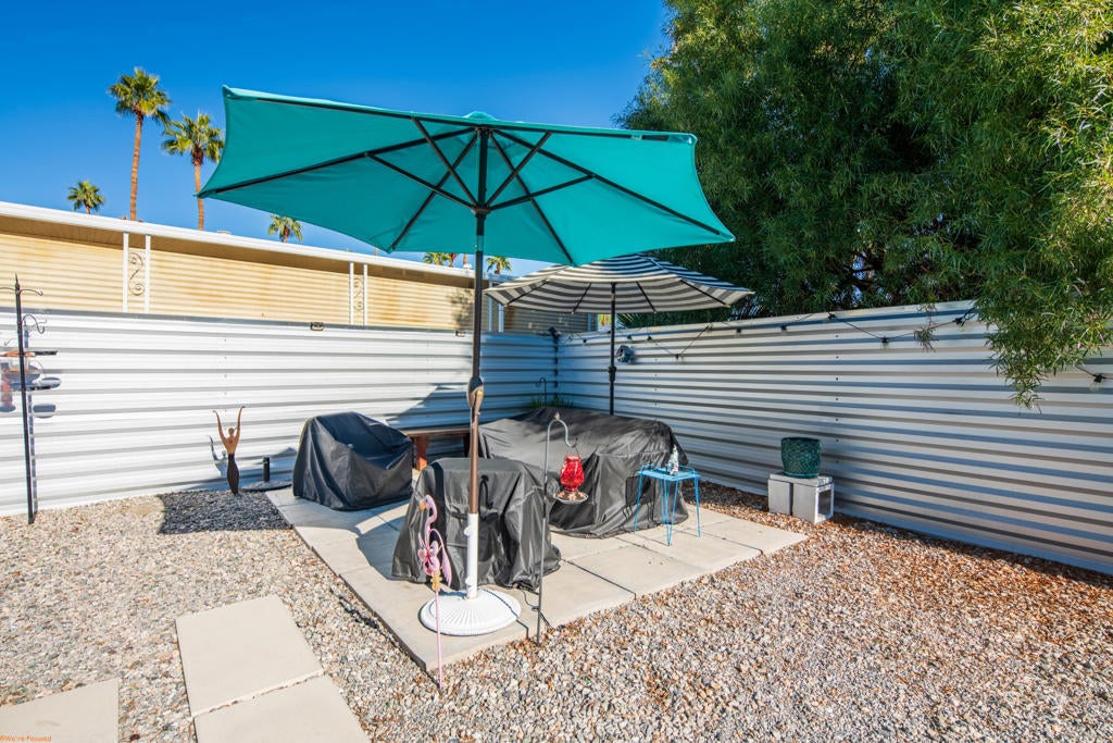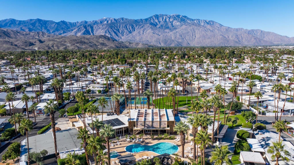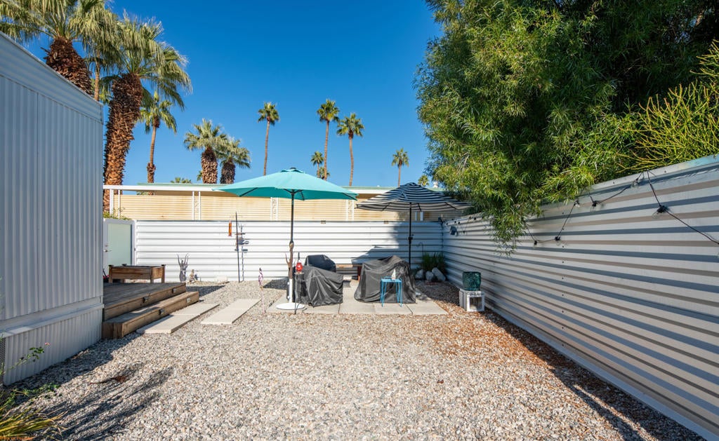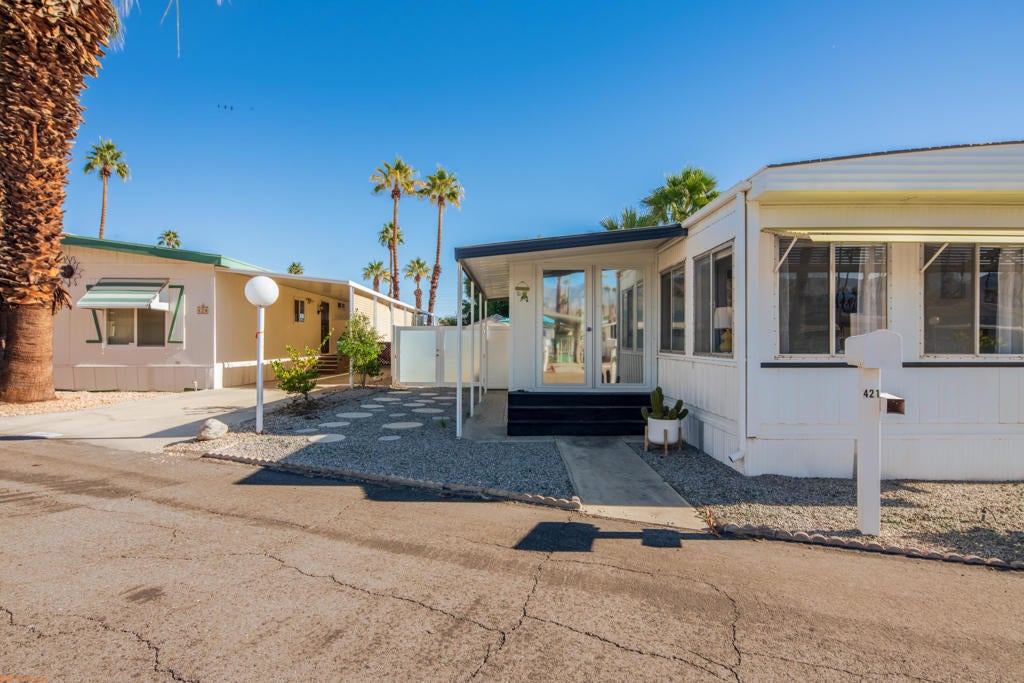 BEAUTIFUL 2BD/1BA manufactured home showcasing PRIDE OF OWNERSHIP with fresh, inviting aesthetic--inside and out in the desirable Royal Palms community--offering MODERN DESERT COMFORT with a CHARMING MID-CENTURY touch. Perfectly located in Cathedral City minutes from Palm Springs and Rancho Mirage with quick access to Hwy 111, this home provides convenience, style, and INCREDIBLE VIEWS.Step inside to a BRIGHT, ENCLOSED SUNROOM that FILLS the HOME WITH NATURAL LIGHT and opens into a SPACIOUS LIVING ROOM framed by STUNNING VIEWS of the SAN JACINTO MOUNTAINS. The dining area features a built-in buffet and pendant lighting, creating a warm and inviting space to entertain.The KITCHEN has been THOUGHTFULLY UPGRADED with BUTCHER BLOCK COUNTERTOPS, subway tile backsplash, gas cooktop, and newer refrigerator. A separate laundry area sits just off the kitchen for added convenience.The BATHROOM showcases a TASTEFUL REMODEL with UPDATED SINK AND COUNTERTOPS, a MARBLE-TILED SHOWER, and a bamboo feature wall for added texture and warmth. The primary bedroom offers generous space and a walk-in closet, while the guest room is perfect for visitors or a home office.Outside, the BACKYARD has been REFRESHED WITH GRAVEL, STONE PAVERS, FENCING and a charming gazebo--ideal for morning coffee, outdoor dining, or simply soaking in the breathtaking mountain views. The home is PARTIALLY FURNISHED and ready to add your personal finishesRoyal Palms offers resort-style amenities including a newly renovated fitness center, pool and spa, pickleball courts, BBQ area, RV storage, 3 parks for your furry friends,and more.