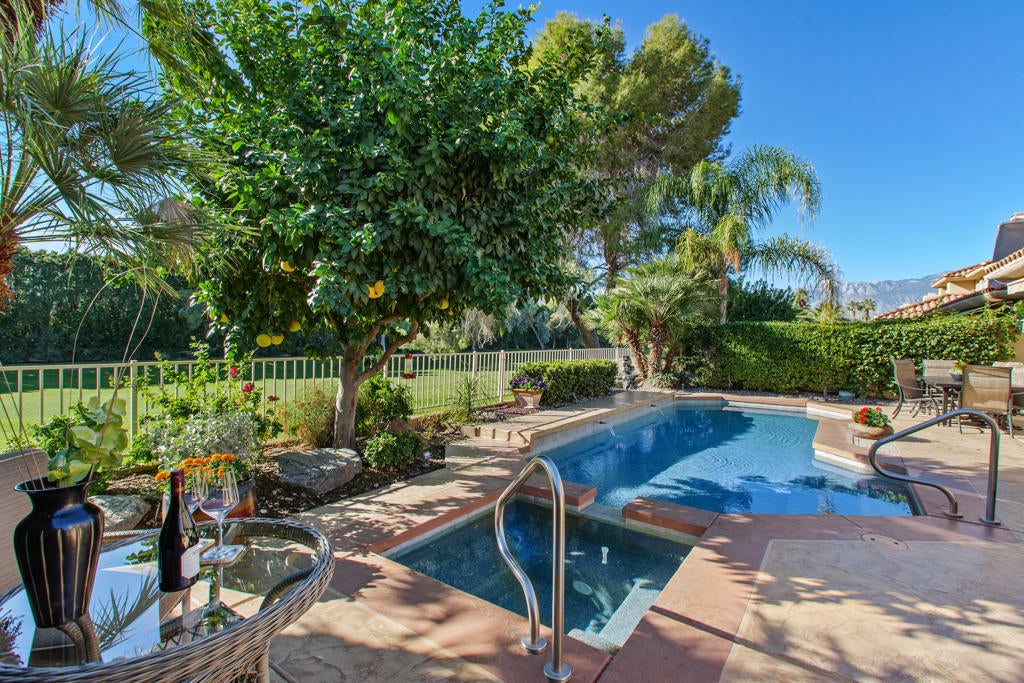 Welcome to 201 Kavenish Dr., a beautiful highly upgraded property in the desirable community of Rancho Mirage Country Club. Three bedrooms (one is the attached casita), three baths with gorgeous south facing views of the golf course and the Santa Rosa Mountains. The family room and kitchen combo with a breakfast bar are wonderful for entertaining. Crown Molding and Plantation Shutters throughout. Step outside to your private saltwater pool with pebble-tec finish surrounded by beautiful epoxy coated concrete decking, BBQ Island and automatic awnings - perfect for outdoor entertaining, relaxing or gathering with friends and family. The huge Master Suite has an oversize master bathroom, walk-in closet and large soaking tub. Golf enthusiasts will enjoy the community's private 10-hole golf course, available for a nominal fee. This home also offers a two-car garage with separate golf cart garage. Conveniently located minutes to Eisenhower Medical Center, shopping, dining, entertainment, Costco, and El Paseo shopping and dining. This home offers the perfect balance of comfort, convenience, and lifestyle. Rancho Mirage CC is one of the best values in the desert. Don't wait to schedule your private showing!!!