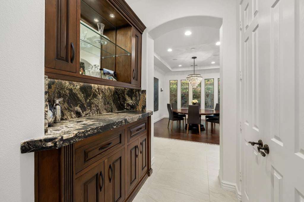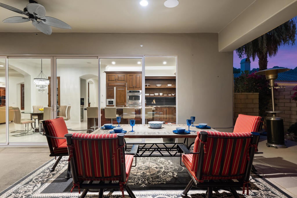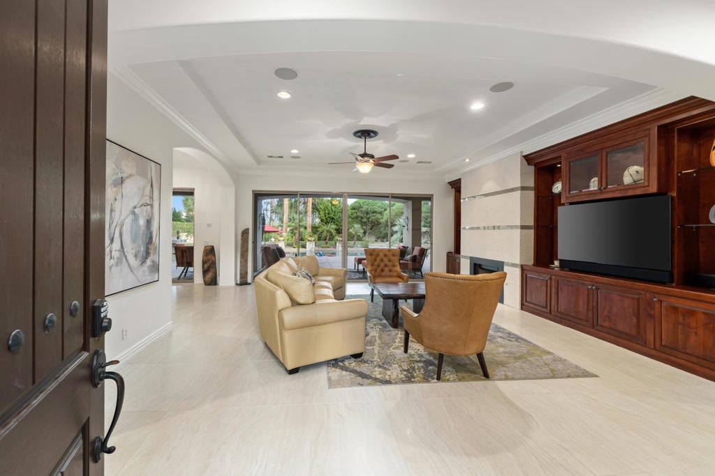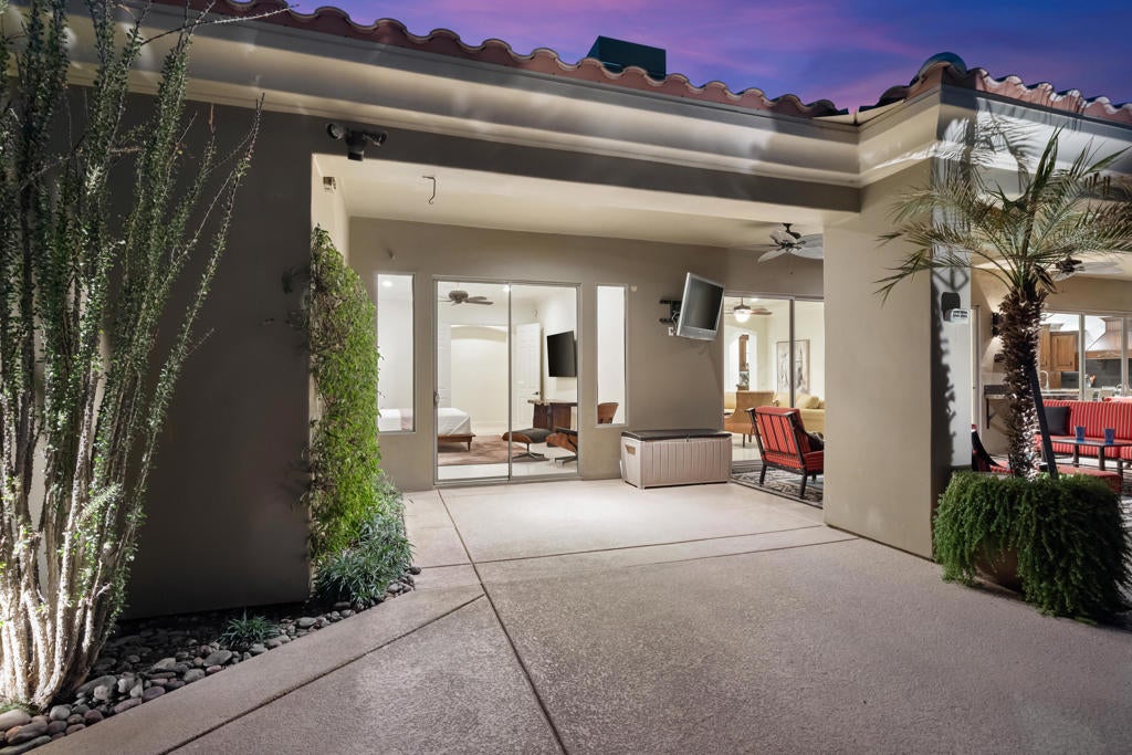Available for a year lease!Casa Marbella showcases a resort-like backyard oasis with lush greenery, palm trees, and an expansive custom pool and spa with a spectacular waterfall. The private courtyard entry with a flowing water feature leads inside to a wall of glass that was professionally engineered to bring in the light & stunning views across the back of the entire great room & kitchen! Outdoor living is where Casa Marbella truly shines. Take a leisurely dip in the pool for a moment of serenity and rinse off in the outdoor shower. Lounge and relax under the covered portico with cocktails or fresh lemonade and watch golf on the outdoor television. Entertain guests at the impressive six-stool fire bar with the fully equipped outdoor kitchen, mini-fridge, and BBQ station. Enjoy s'mores or a glass of wine around the wood-burning fire pit--Dine overlooking the gorgeous backyard landscape with the mountains and sunset offering breathtaking views. Once inside, you can host dinner for family or friends in the stylish formal dining room with a modern crystal chandelier and seating for 6. Head to the comfy leather couch in the living room and wind down by the gas fireplace, or perhaps watch a movie or game in the media room just adjacent. When it's time to sleep, let guests choose between the three lavish queen bedrooms or head straight to the Master Suite. Indulge in a self-care bath soak in the luxurious tub listening to the music of your choice before snuggling into the king bed under the fine linens. Wake up feeling refreshed, get some work done in the office, or manage your tasks and feel ready for the day. Whether you want to decompress or entertain family and friends, Casa Marbella is the ideal desert oasis.