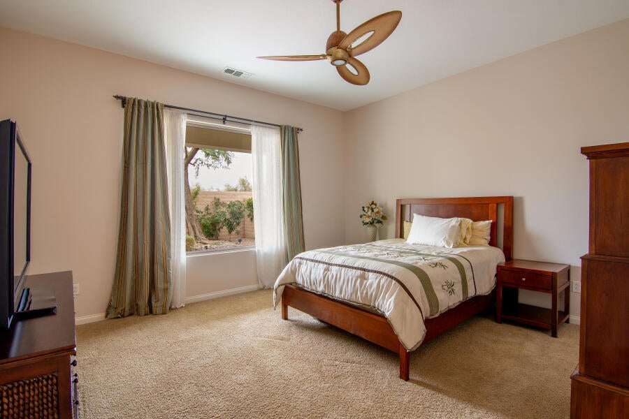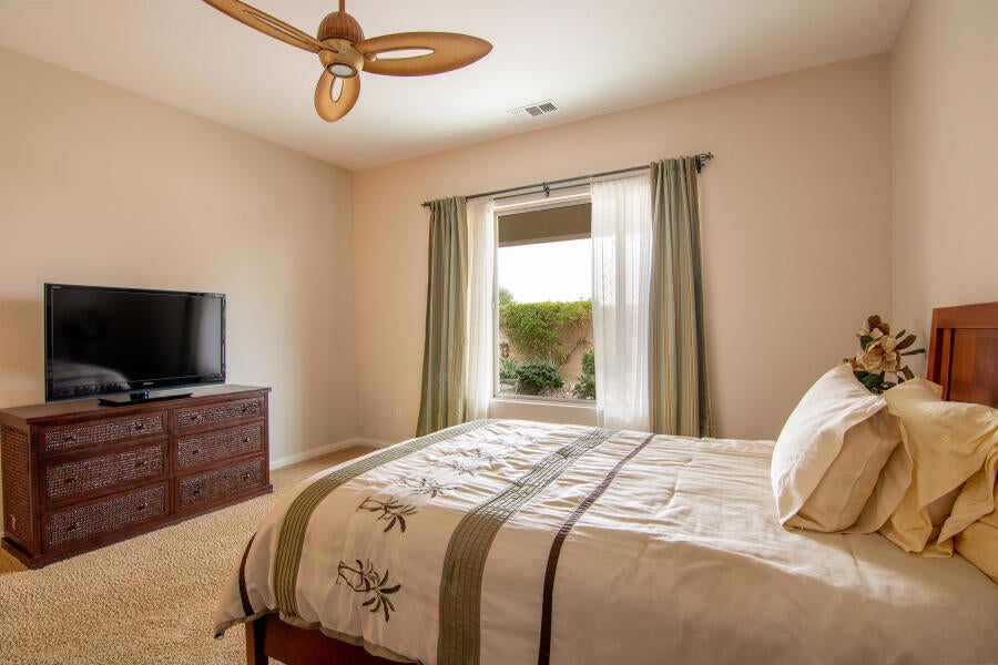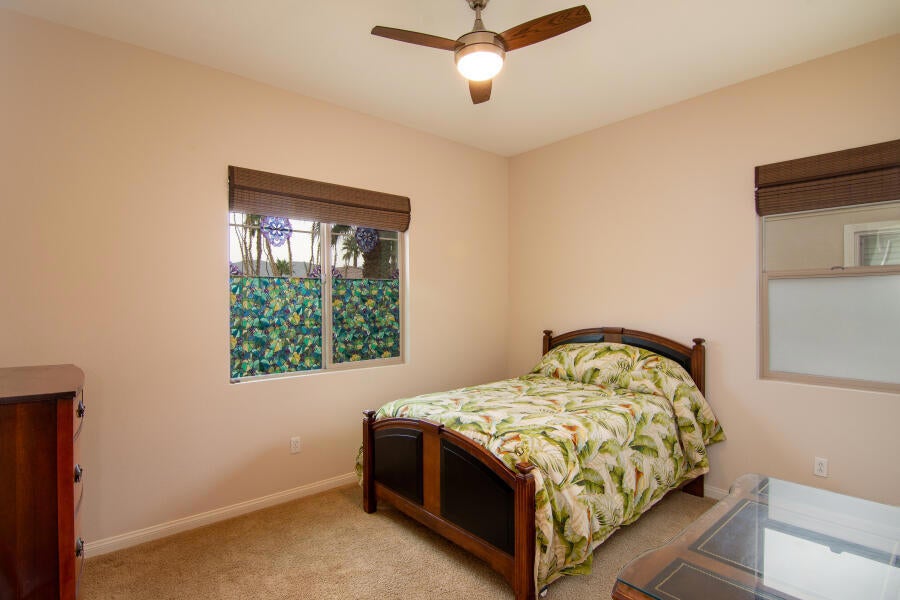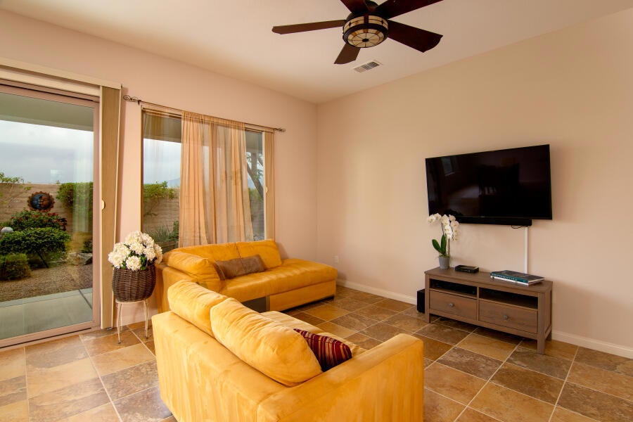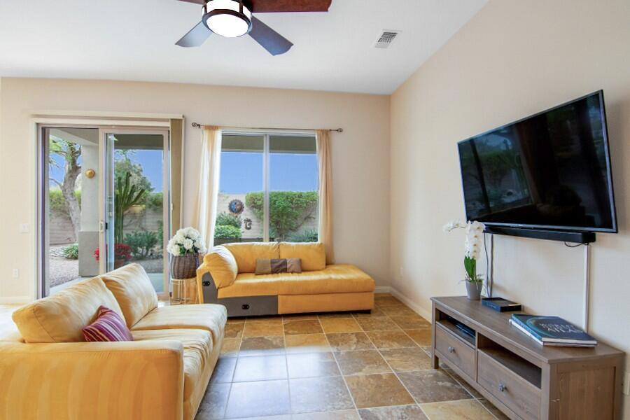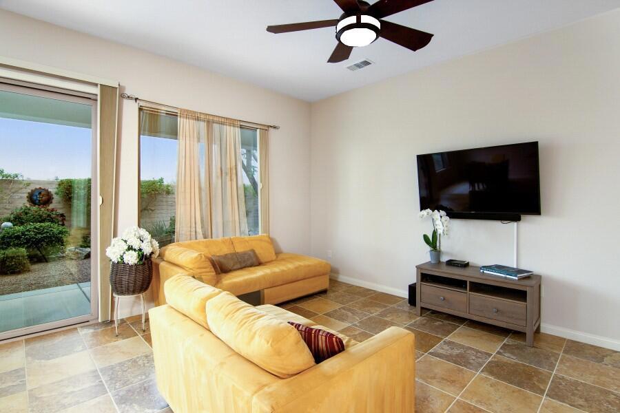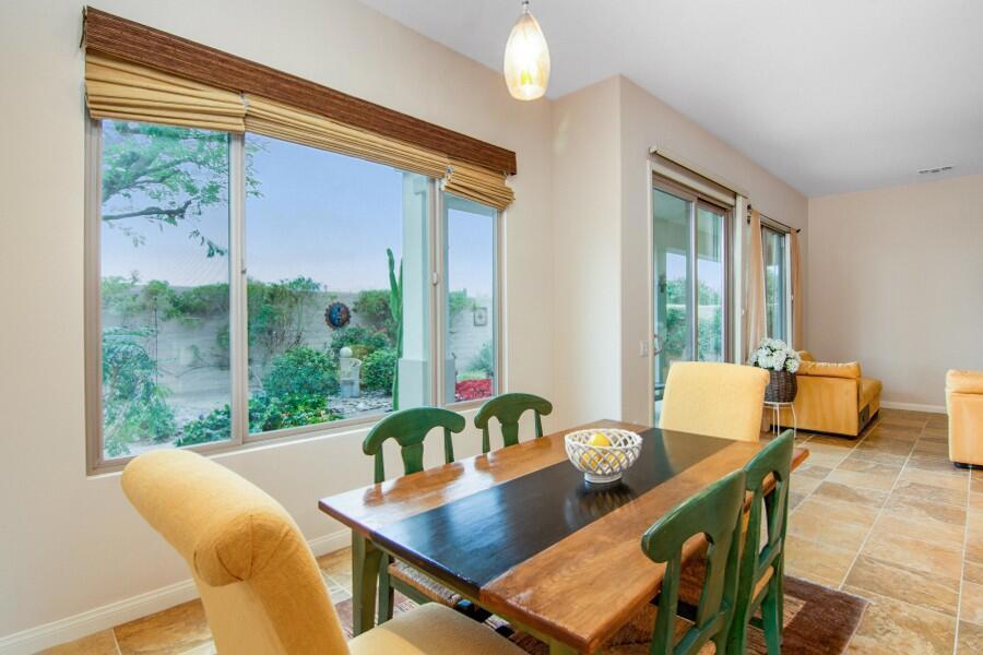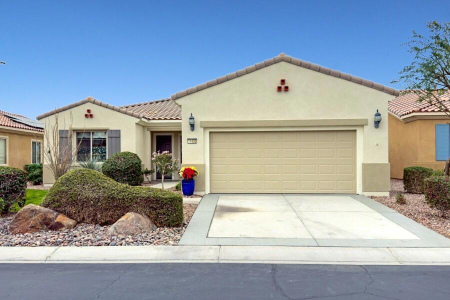 Lovely Avalino Model with Santa Rosa Mountain Peek View! Highly Sought after Del Webb Sun City Shadow Hills for Active Adult Living at it's Best! Enjoy Resort Style amenities, Clubs, Vibrant Social Life including Performing Arts, Concerts, Movies in the Park, & So Much More. Two Clubhouses, Two Fitness Centers, Pools, Spas, 8 Pickleball courts, Plus Tennis! Two Golf Courses, Putting Greens & Driving Range, miles of Walking Trails! Move in Ready... New Interior Paint in Soft soothing Neutral color tones! You'll appreciate this Open & Inviting floor plan which is Great for Entertaining & Relaxation. Enjoy a Spacious Cook's Kitchen with Plenty of Storage, Counter space! Large Walk in Pantry! Granite Breakfast Bar extends your dining and serving space. Casual Dining area is conveniently located off Kitchen & Great room with Slider Door to access Private South facing Leisure yard, Covered Patio, lushly landscaped South facing yard. 2 car attached garage, potential space in front yard area to add a casita or courtyard with HOA approval, of course! Set up your Private Tour, This Home, has been seldomly used by owner and Never used as a rental.