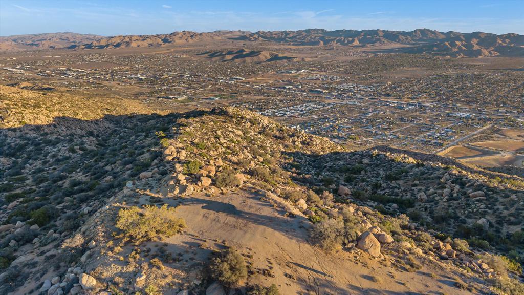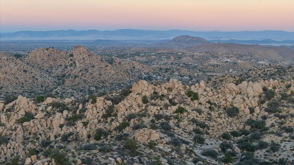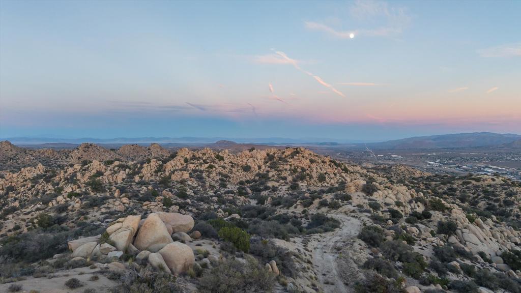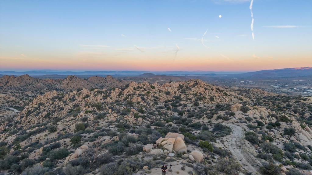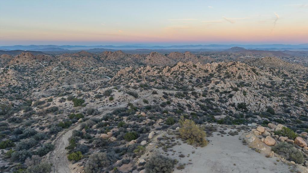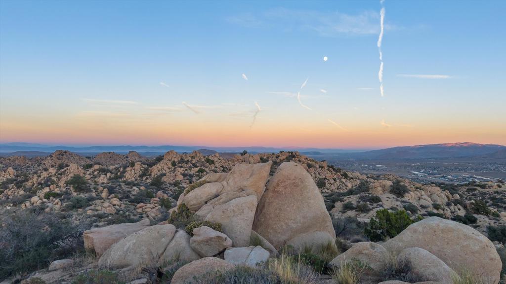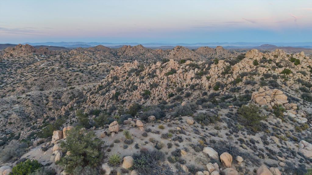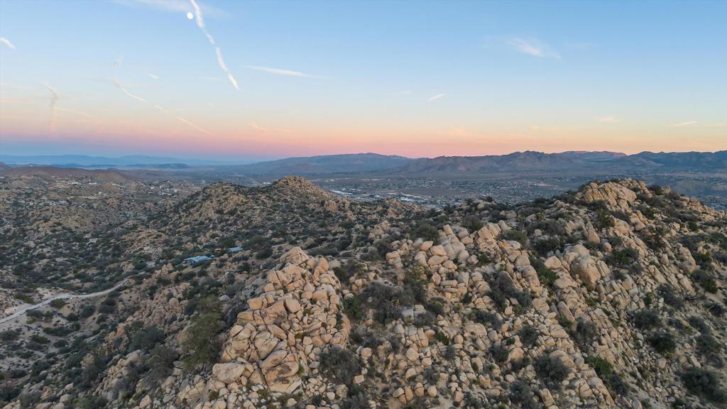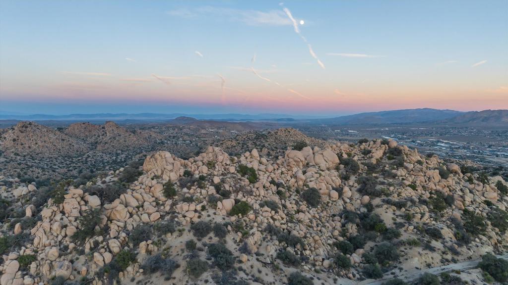 Eighty acres at the summit of Rock Reach, an almost surreal stretch of land where the entire desert opens up around you. The views are staggering in every direction. You can see the whole world from up here: Pioneertown, Landers, Twentynine Palms, Palm Springs, and the long spine of San Jacinto and San Gorgonio anchoring the horizon. Day or night, the landscape feels endless, with city lights in the distance, ridge lines rolling away for miles, and skies that feel close enough to touch.The property is covered in boulders. Enormous, sculptural, towering forms rising out of the ground and wrapping the site in a kind of natural monumentality. Between them are pockets of native flora including creosote, cholla, yucca, and juniper that create moments of green and texture that shift with the seasons and the light.Two building pads are already in place, with countless other options across the terrain. Everywhere you stand feels like its own world.What makes this land truly rare is the combination of scale, privacy, and ease. It feels remote and untouched, quiet and elevated, completely its own universe, yet it is minutes from town with simple access to groceries, gas, coffee, restaurants, and everything you actually need.A property like this comes along once in a lifetime, if ever. It's dramatic, cinematic, and intensely beautiful, one of those desert places that stays with you long after you leave.