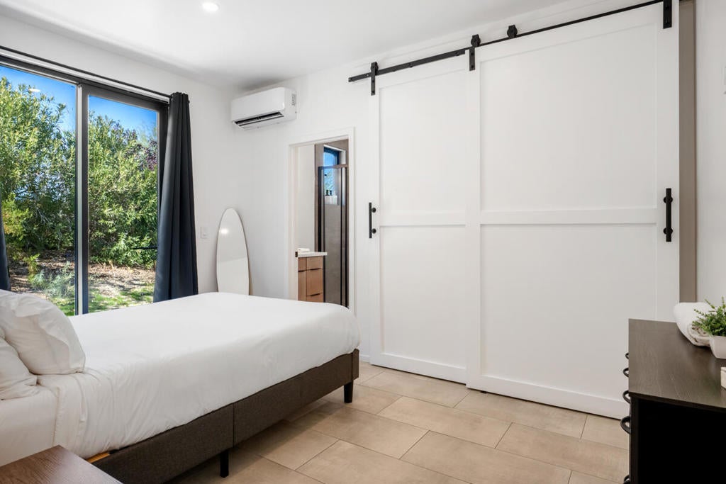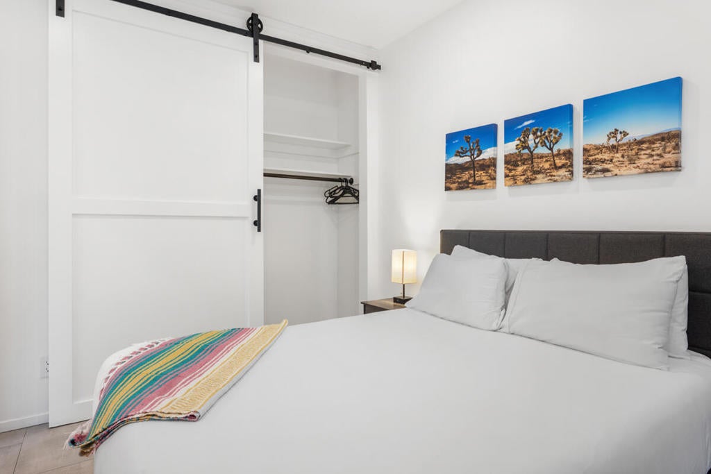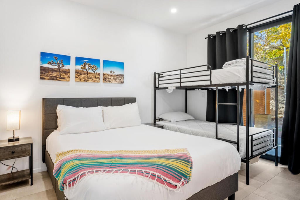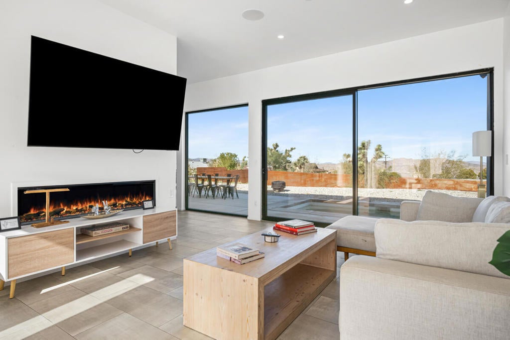 Modern 2021-built home with floor-to-ceiling German-imported Arka windows, paid-off premium solar, and stunning mountain & desert views from every room. This contemporary retreat blends high-end design with exceptional comfort, offering a bright, open layout and top-tier finishes throughout. Perfect as a full-time residence, desert getaway, or turnkey short-term rental--with the option to assume the existing successful Airbnb listing and furnishings (additional price). Inside, enjoy a beautiful modern kitchen featuring quartz countertops, tiled backsplash, sleek cabinetry with soft-close drawers, open shelving, and a large wine fridge. The spacious living area includes an electric fireplace/heater, built-in Sonos ceiling speakers, dimmable lighting, and seamless indoor-outdoor flow. All four bedrooms are generously sized, and three feature en suite bathrooms, ideal for privacy and guest comfort. Barn doors on closets, keyless entry, and a tankless water heater add both style and convenience. Go outside to the expansive nearly 1/2-acre lot with a 15' x 8' propane-heated 4-ft deep pool (dedicated propane tank & autofill), large concrete patio with grill, and wide-open desert skies. Additional highlights include a 2-car carport, large finished storage room, an EV charging port (NEMA 14-30 & 14-50 capacity), very efficient 6 mini split/3 condenser heating and AC system, low-voltage speaker wiring, virtually no electric bills, WiFi connection, and new washer/dryer. Located just 10 minutes to Joshua Tree National Park, 5 minutes to Downtown Joshua Tree, and a 3-minute walk to the Friendly Hills hiking trail, home to occasional Mojave Tortoise sightings. With high-end construction and a proven rental history this property is an exceptional opportunity in one of the desert's most desirable locations.