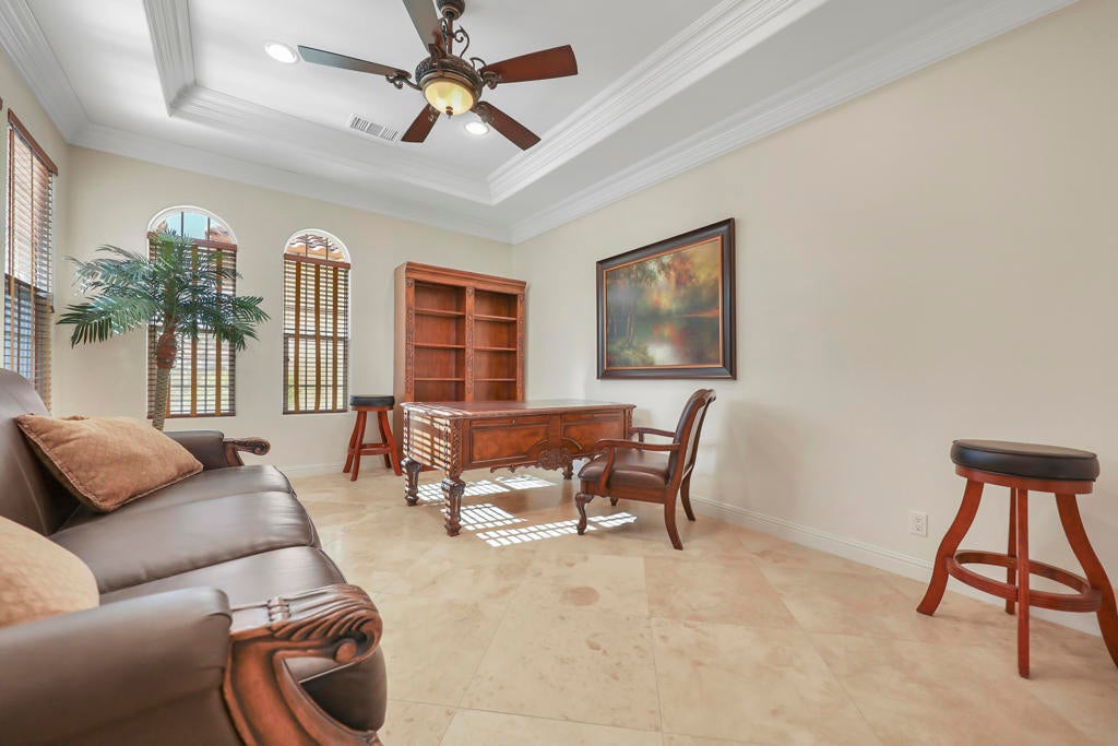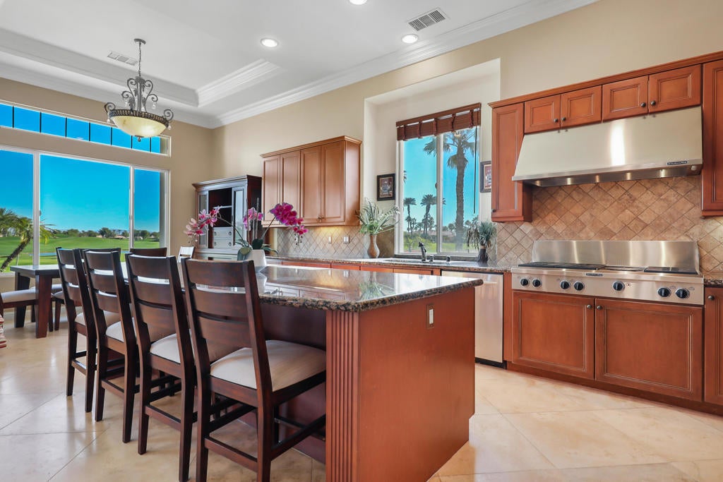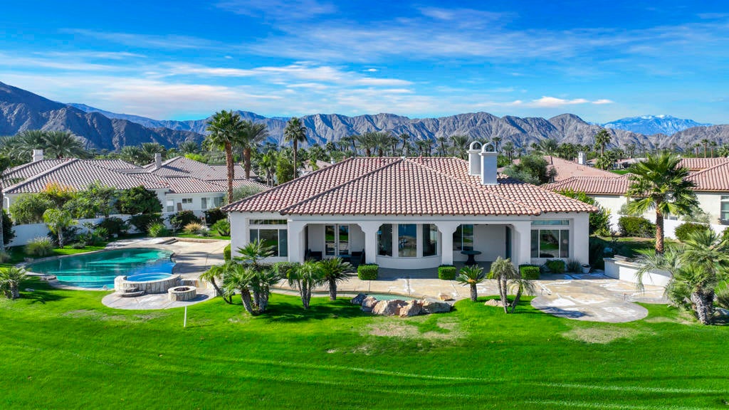 Huge lot at end of cul-de-sac with really awesome views across the driving range, multiple fairways and lakes, the spectacular 18th hole, and the clubhouse. And a gigantic side yard with a putting green! The court entry leads you into a soaring 18', skylit rotunda foyer that opens up to BIG a big 43' Great Room, a big 17' Office/Den, a big 35' Master Suite over 4400 sf. of spacious luxury. Guests?...a courtyard casita plus two guest rooms with their own sitting room (or media room or family room). The Great Room with its bow-window dining room captures the view and is perfect for entertaining. Outside the lush landscaping, custom pool & stream, and the huge side yard extend the entertaining and frame the view. Magnificent fireplaces, gourmet kitchen with European-style maple cabinets, slab granite counters, built-in fridge; switch-start fireplace, Roman tub in master bath.