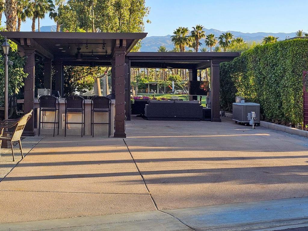 Outdoor Resort Indio is a Class A Motorcoach resort. This is an RV lot. This premium south-facing lot on quiet Divit Court offers mountain views, no harsh sun or strong winds, a north-facing coach for cooling, and a private outdoor space with a solid roof, power screens, fountain, wicker furniture, full kitchen, BBQ, Smart TV, and ceiling fans. Located in the sought-after Outdoor Resort Indio, this luxury RV lot also features a wide, unobstructed golf course view and a large L-shaped pergola with a fluted aluminum solid roof. The spacious L-shaped outdoor kitchen includes granite countertops, stainless appliances, a four-burner cooktop, oven, dishwasher, fridge, wine fridge, and stainless storage. Four electric screens and one manual screen offer versatile shade and privacy, while three ceiling fans, coated RV pad, and extensive pergola lighting enhance comfort. A 55' mounted Smart TV, WiFi hotspot, beautiful landscaping with a Meyer lemon tree, and recently upgraded low voltage wiring ensure convenience and style. Two 4000-watt Infratech ceiling heaters, currently in storage, are also negotiable for added luxury.‍