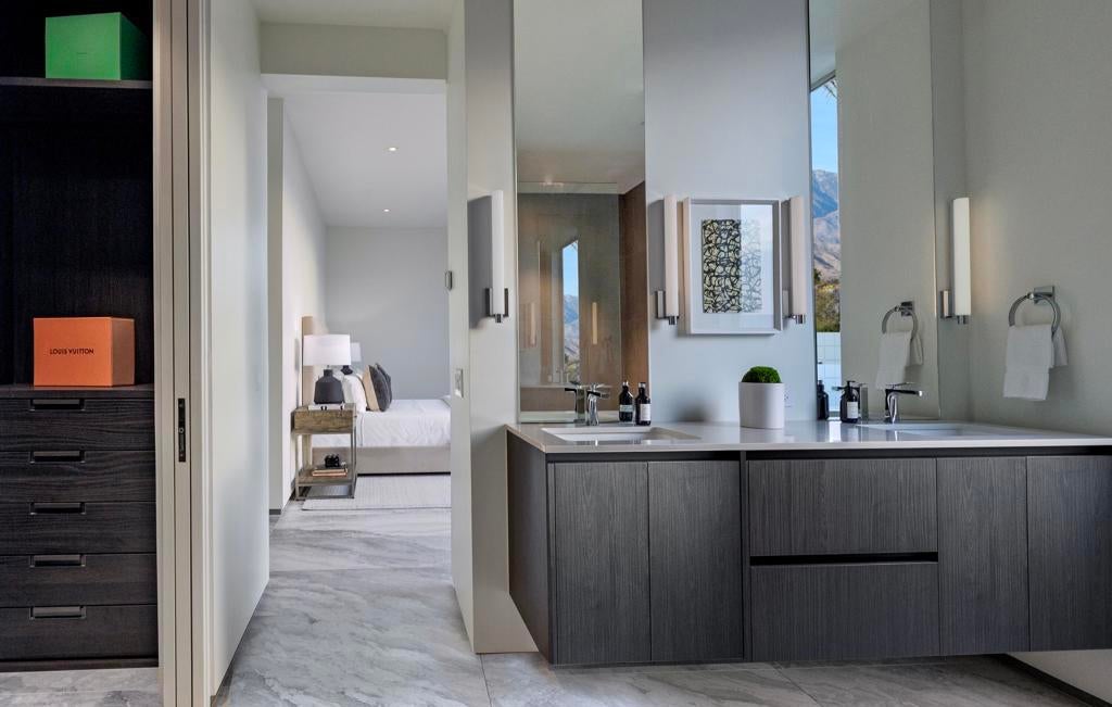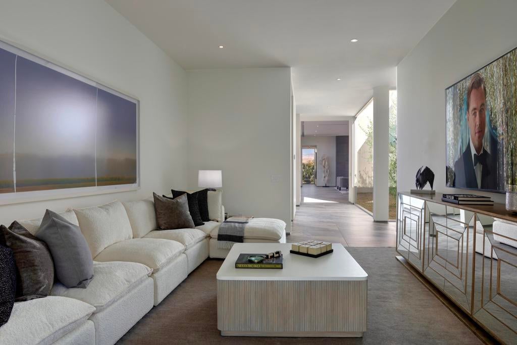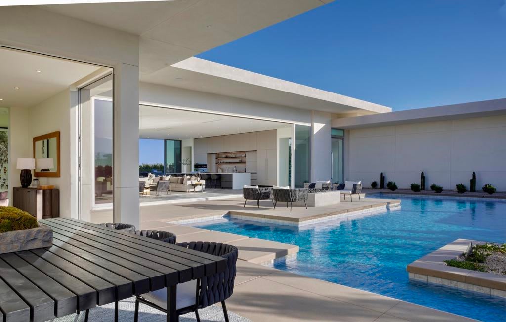 A stunning ultra luxury lifestyle is presented in this remarkable see-through home walled by floor-to-ceiling Fleetwood glass and doors, flanked by the front pool facing mountains west, and a reflection lap pool to the east. A glass atrium greets you at the front door, replete with a desert olive tree immediately clarifying the light, space and open architecture throughout the plan. The home circulates around the atrium providing long art hallways and glass visages of water throughout. Opposing wings provide a very private massive primary suite balanced by the guest/media rooms, all executed with precision alignments. Large format flooring, a 22 foot social kitchen island and a separate wine room, add style and features to this truly incredible modern estate Photos are from a prior model.